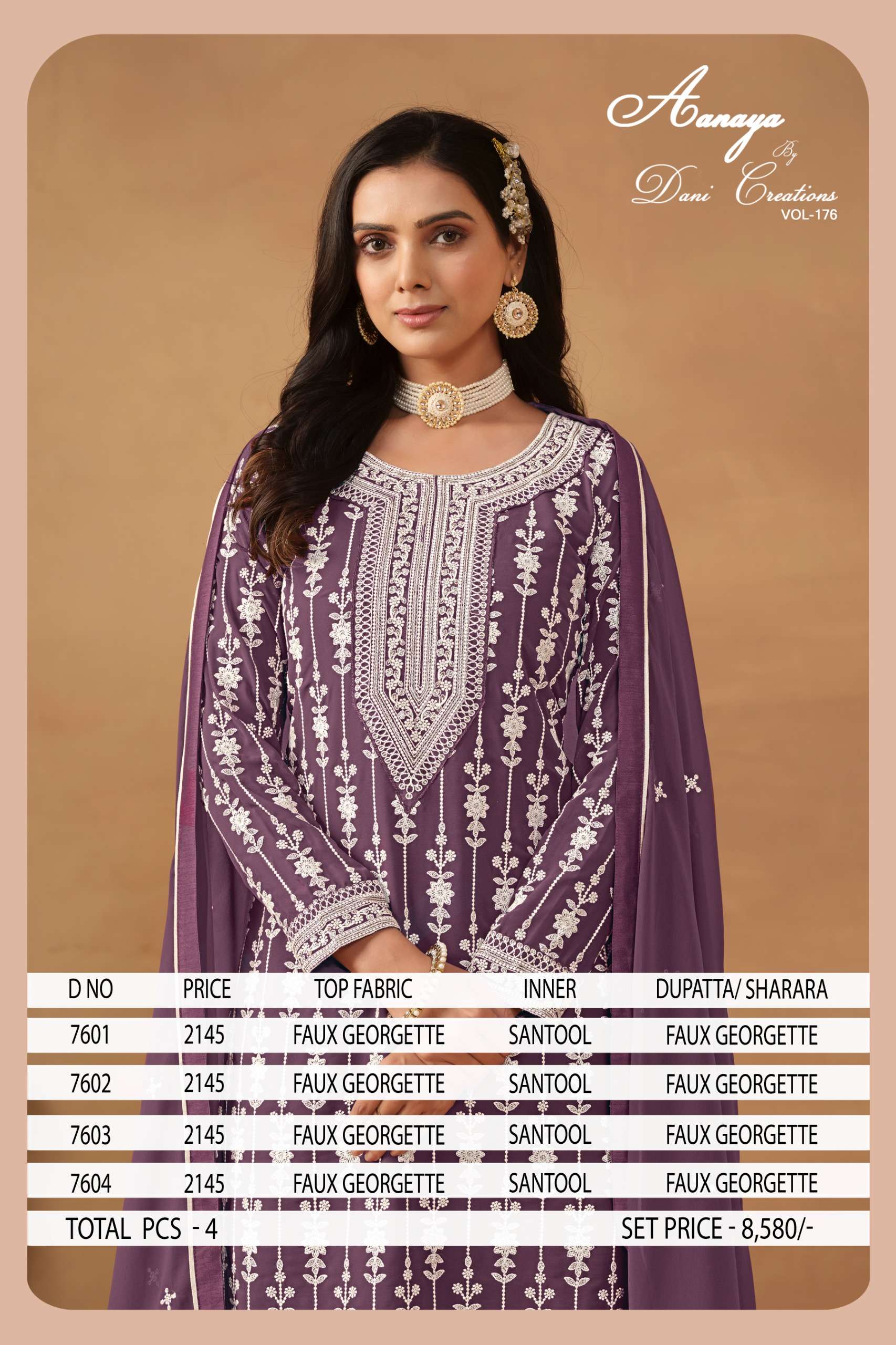 Buy Online AANAYA VOL 176 by Dani creation Faux Georgette suit collection manufacturer surat 4 Pcs of Full Catalogue at Wholesale Price. Looking for AANAYA VOL 176 by Dani creation Faux Georgette suit collection manufacturer surat Full Catalouge at Best Price? Buy Now AANAYA VOL 176 by Dani creation Faux Georgette suit collection manufacturer surat at Wholesale Rate of Rs 8580 with Total 4 Pcs from authroized dealer and supplier of Dani Creation Brand. Cost of Each piece is just only Rs 2145 which is very low and affordable price to resale the product in your retail store ,This is Surat based Wholesale Supplier & Dealer of Dani Creation Brand. Click on Brand name to Know more about Dani Creation Brand's products.Call or Whatsapp on 9898838984 for booking or enquiry