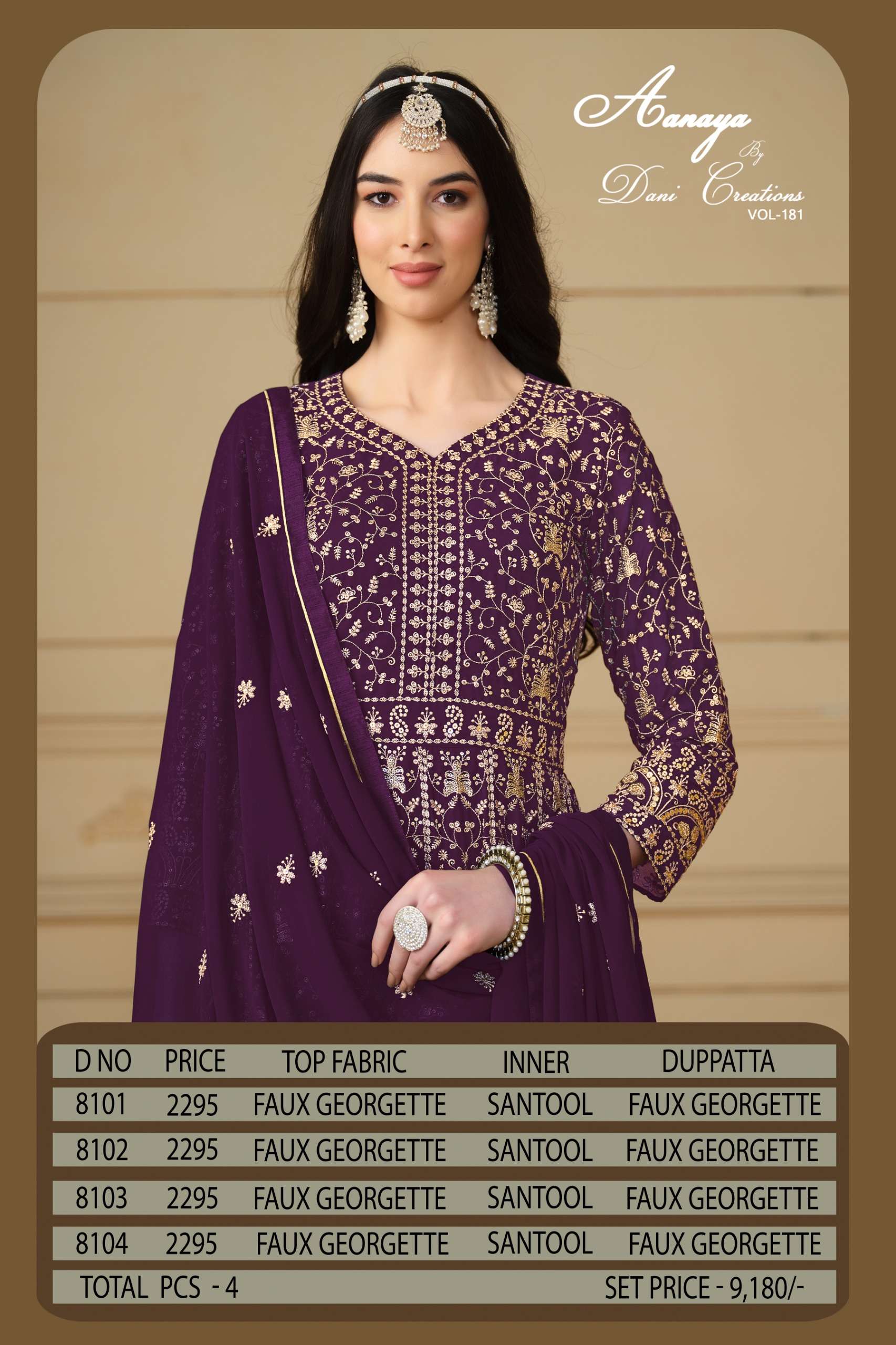 Buy Online AANAYA VOL 181 by Dani creation gown collection manufacturer surat 4 Pcs of Full Catalogue at Wholesale Price. Looking for AANAYA VOL 181 by Dani creation gown collection manufacturer surat Full Catalouge at Best Price? Buy Now AANAYA VOL 181 by Dani creation gown collection manufacturer surat at Wholesale Rate of Rs 9180 with Total 4 Pcs from authroized dealer and supplier of Dani Creation Brand. Cost of Each piece is just only Rs 2295 which is very low and affordable price to resale the product in your retail store ,This is Surat based Wholesale Supplier & Dealer of Dani Creation Brand. Click on Brand name to Know more about Dani Creation Brand's products.Call or Whatsapp on 9898838984 for booking or enquiry
