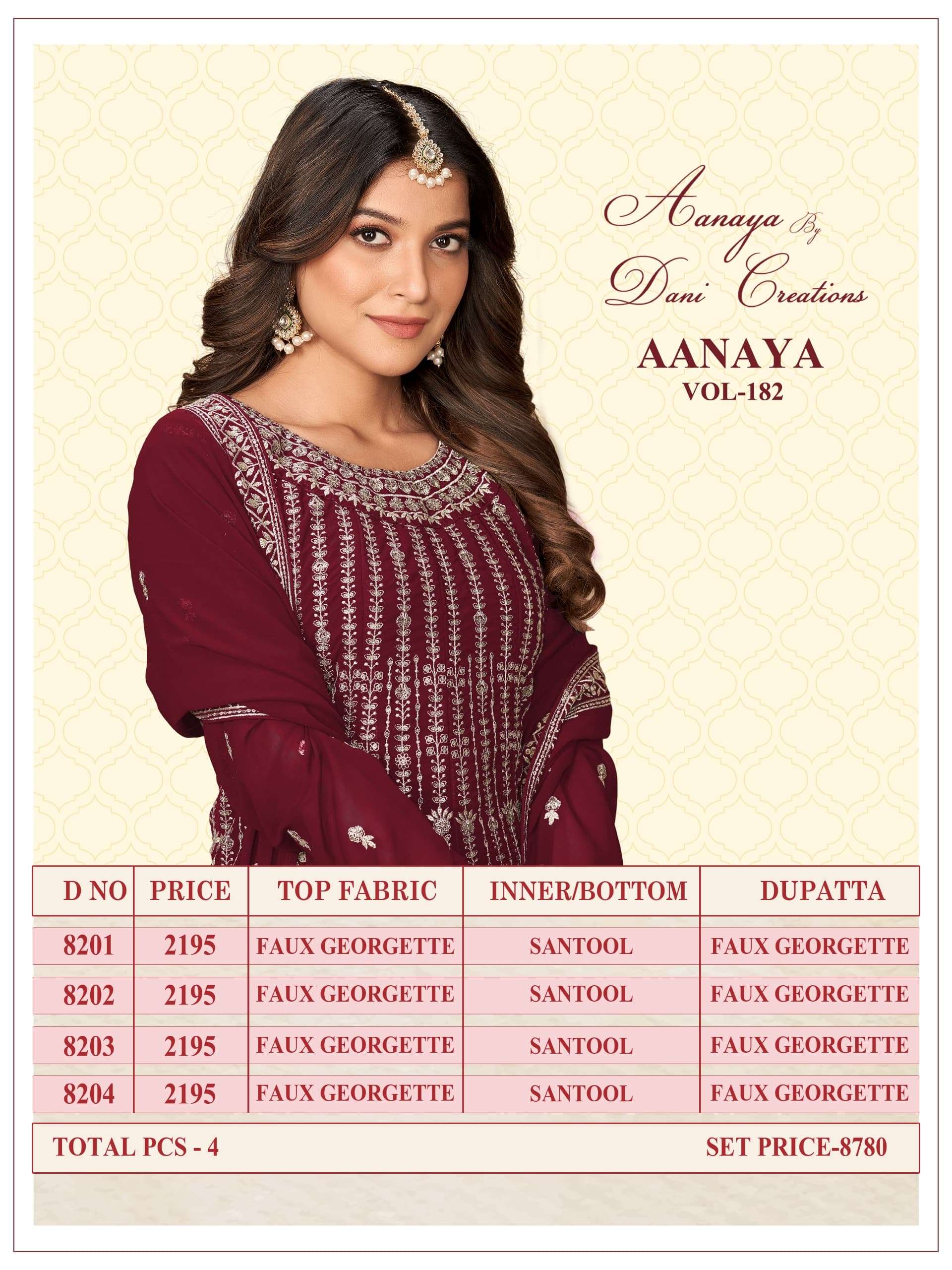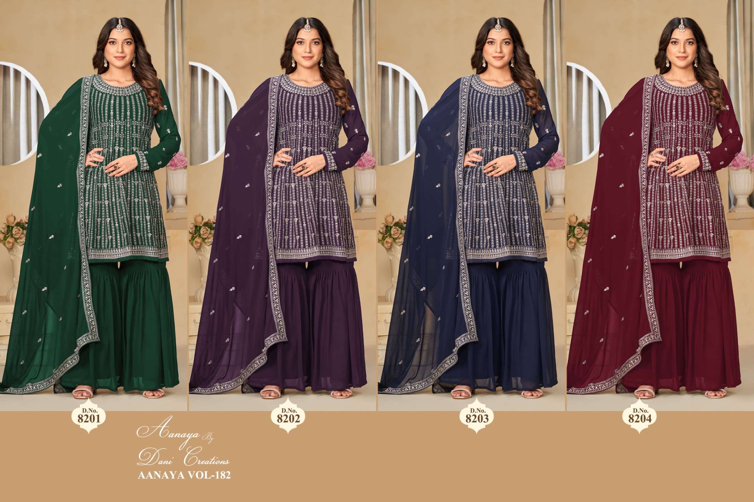 Buy Online AANAYA VOL 182 DANI CREATION 4 Pcs of Full Catalogue at Wholesale Price. Looking for AANAYA VOL 182 DANI CREATION Full Catalouge at Best Price? Buy Now AANAYA VOL 182 DANI CREATION at Wholesale Rate of Rs 8780 with Total 4 Pcs from authroized dealer and supplier of Dani Creation Brand. Cost of Each piece is just only Rs 2195 which is very low and affordable price to resale the product in your retail store ,This is Surat based Wholesale Supplier & Dealer of Dani Creation Brand. Click on Brand name to Know more about Dani Creation Brand's products.Call or Whatsapp on 9898838984 for booking or enquiry