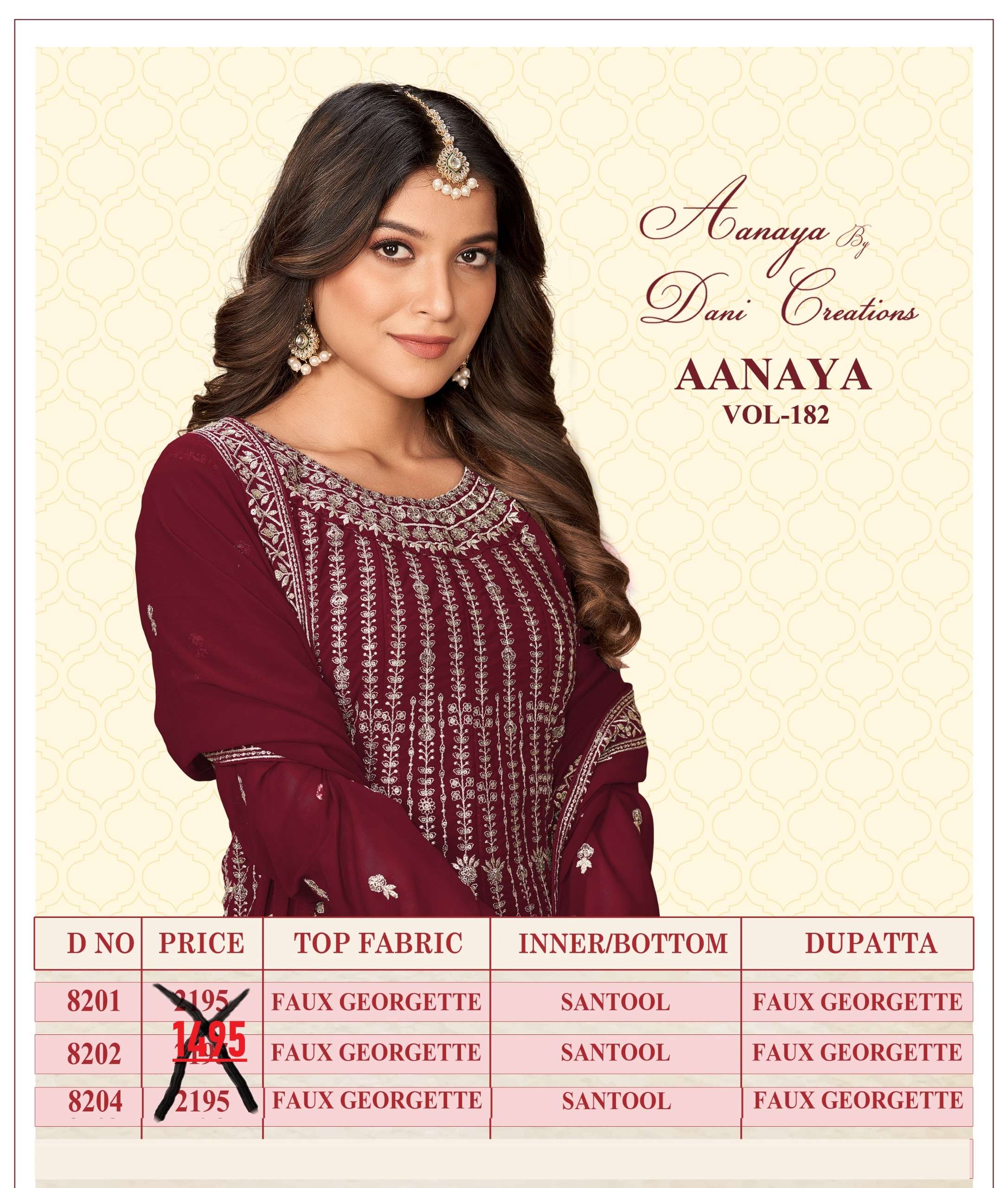 Buy Online AANAYA VOL 183 by Dani creation FAUX GEORGETTE suit collection manufacturer Surat 4 Pcs of Full Catalogue at Wholesale Price. Looking for AANAYA VOL 183 by Dani creation FAUX GEORGETTE suit collection manufacturer Surat Full Catalouge at Best Price? Buy Now AANAYA VOL 183 by Dani creation FAUX GEORGETTE suit collection manufacturer Surat at Wholesale Rate of Rs 5980 with Total 4 Pcs from authroized dealer and supplier of Dani Creation Brand. Cost of Each piece is just only Rs 1495 which is very low and affordable price to resale the product in your retail store ,This is Surat based Wholesale Supplier & Dealer of Dani Creation Brand. Click on Brand name to Know more about Dani Creation Brand's products.Call or Whatsapp on 9898838984 for booking or enquiry