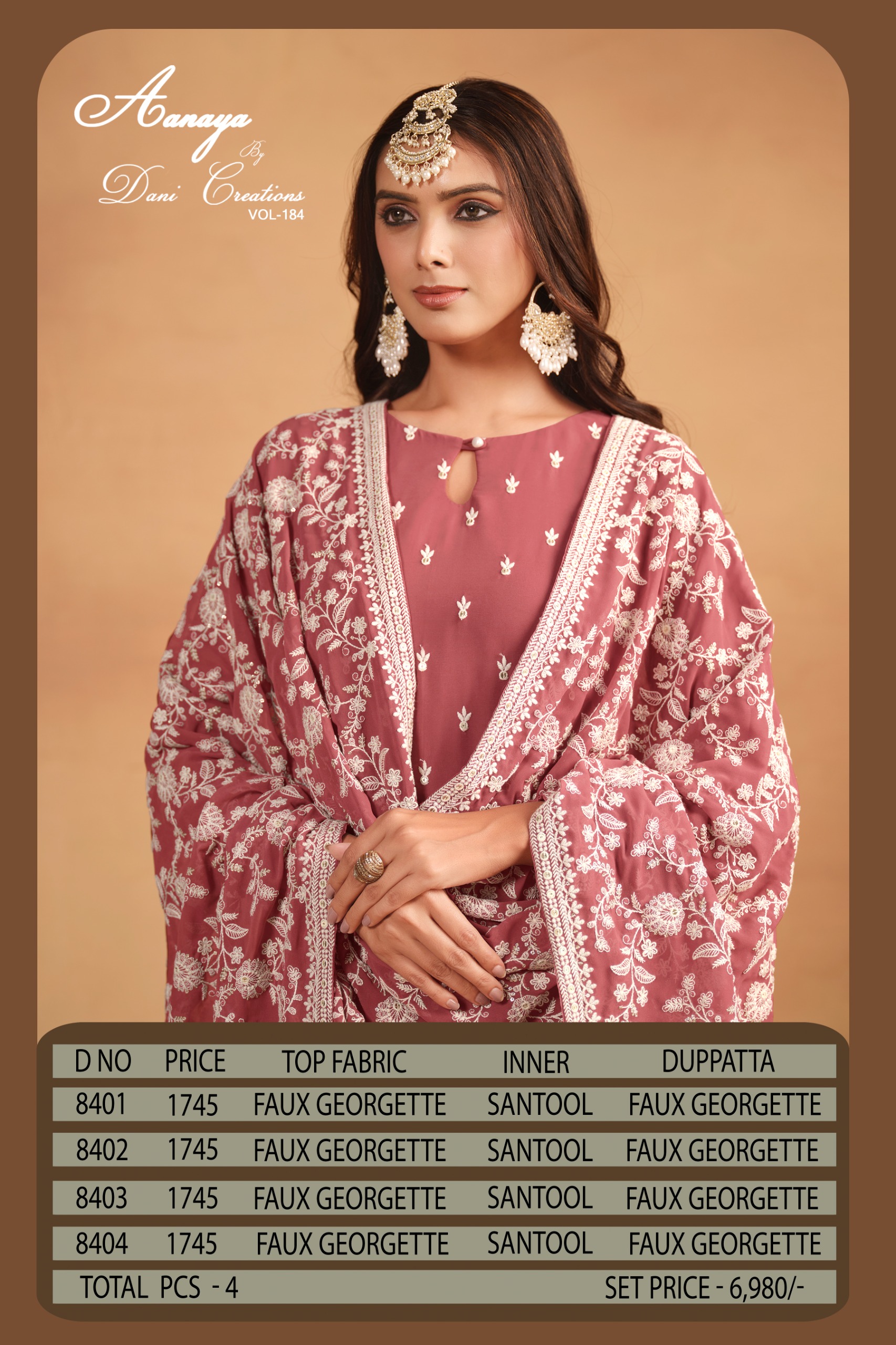 Buy Online Aanaya Vol 184 By Dani Creations 4 Pcs of Full Catalogue at Wholesale Price. Looking for Aanaya Vol 184 By Dani Creations Full Catalouge at Best Price? Buy Now Aanaya Vol 184 By Dani Creations at Wholesale Rate of Rs 6980 with Total 4 Pcs from authroized dealer and supplier of Brand. Cost of Each piece is just only Rs 1745 which is very low and affordable price to resale the product in your retail store ,This is Surat based Wholesale Supplier & Dealer of Brand. Click on Brand name to Know more about Brand's products.Call or Whatsapp on 9898838984 for booking or enquiry