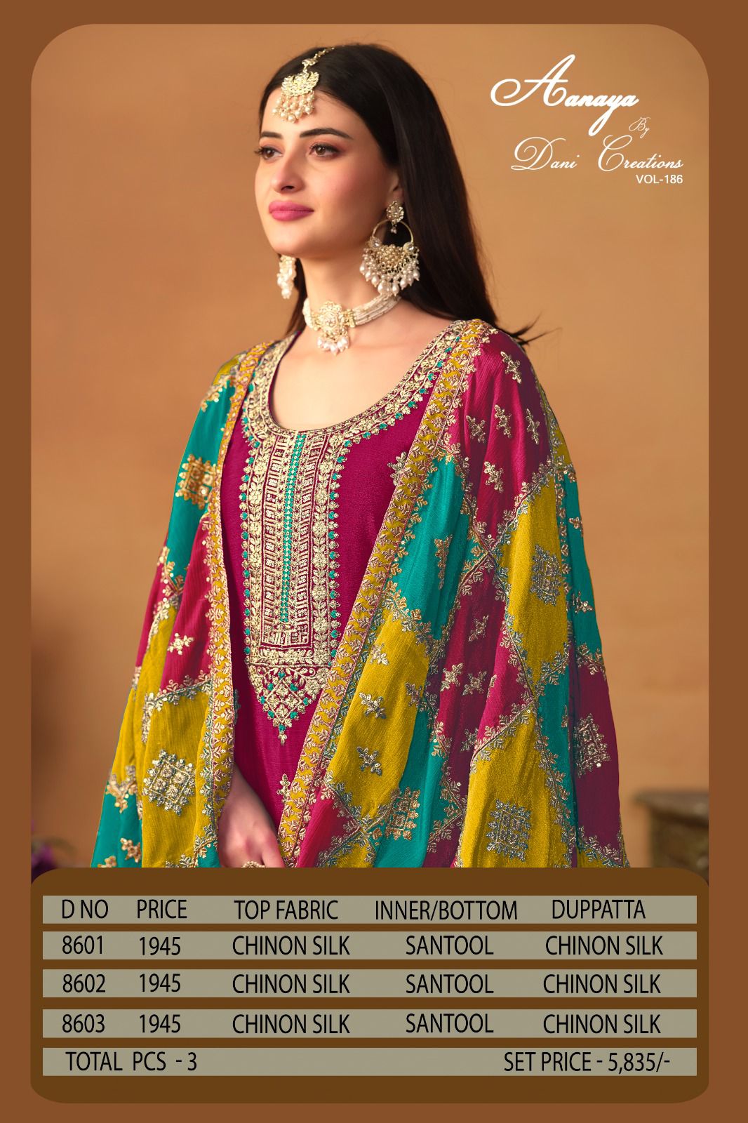 Buy Online Aanaya Vol 186 Designer Chinon Silk Suits 3 Pcs of Full Catalogue at Wholesale Price. Looking for Aanaya Vol 186 Designer Chinon Silk Suits Full Catalouge at Best Price? Buy Now Aanaya Vol 186 Designer Chinon Silk Suits at Wholesale Rate of Rs 5835 with Total 3 Pcs from authroized dealer and supplier of Brand. Cost of Each piece is just only Rs 1945 which is very low and affordable price to resale the product in your retail store ,This is Surat based Wholesale Supplier & Dealer of Brand. Click on Brand name to Know more about Brand's products.Call or Whatsapp on 9898838984 for booking or enquiry