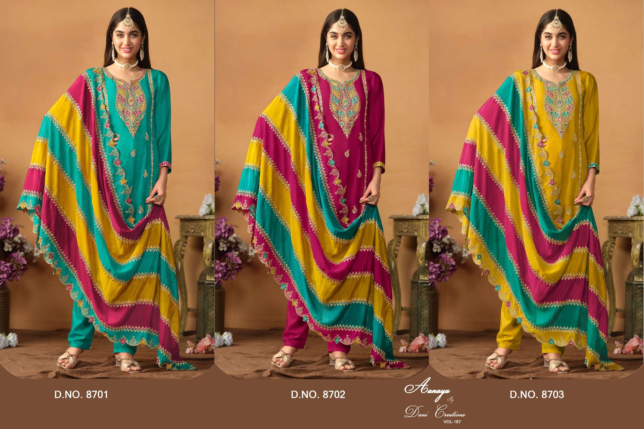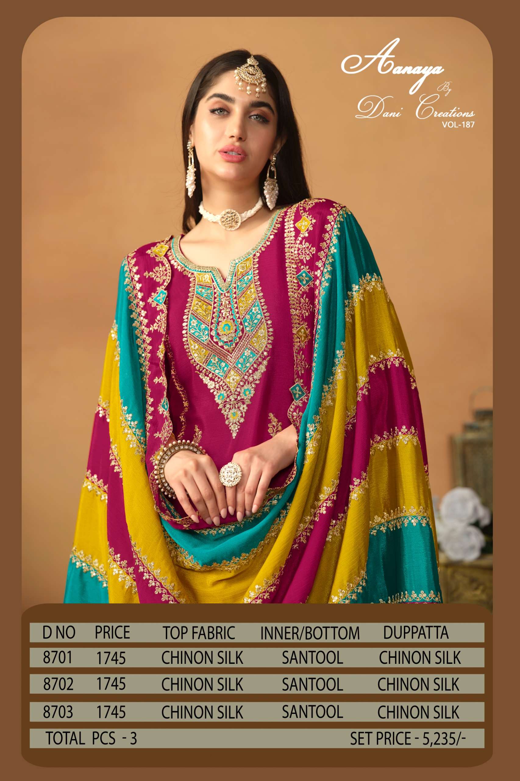 Buy Online AANAYA VOL 187 By Dani creation Chinon Silk suit collection manufacturer surat 3 Pcs of Full Catalogue at Wholesale Price. Looking for AANAYA VOL 187 By Dani creation Chinon Silk suit collection manufacturer surat Full Catalouge at Best Price? Buy Now AANAYA VOL 187 By Dani creation Chinon Silk suit collection manufacturer surat at Wholesale Rate of Rs 5235 with Total 3 Pcs from authroized dealer and supplier of Dani Creation Brand. Cost of Each piece is just only Rs 1745 which is very low and affordable price to resale the product in your retail store ,This is Surat based Wholesale Supplier & Dealer of Dani Creation Brand. Click on Brand name to Know more about Dani Creation Brand's products.Call or Whatsapp on 9898838984 for booking or enquiry