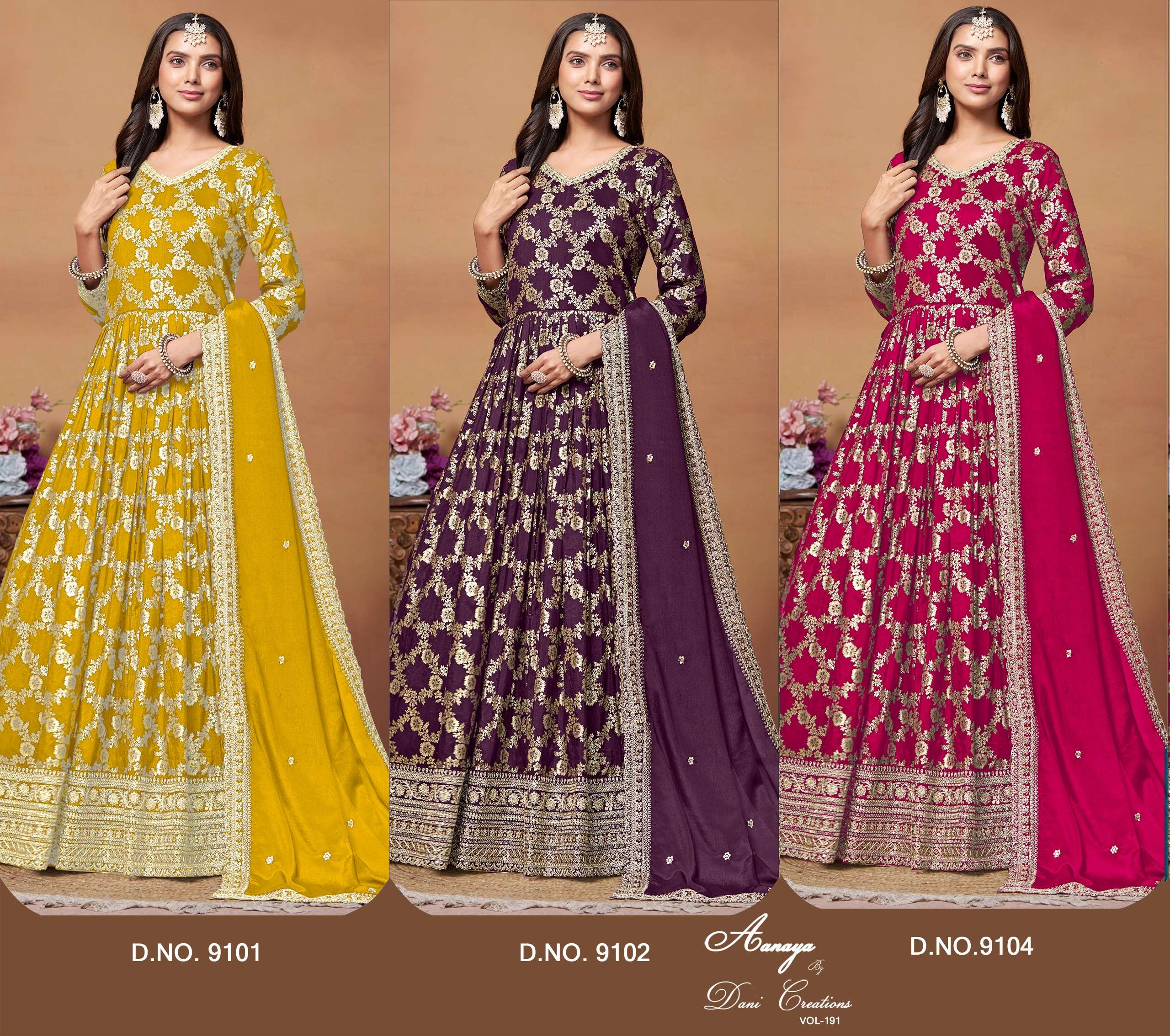 Buy Online AANAYA VOL 191 By Dani creation Dola Jacquard gown collection manufacturer surat 3 Pcs of Full Catalogue at Wholesale Price. Looking for AANAYA VOL 191 By Dani creation Dola Jacquard gown collection manufacturer surat Full Catalouge at Best Price? Buy Now AANAYA VOL 191 By Dani creation Dola Jacquard gown collection manufacturer surat at Wholesale Rate of Rs 7785 with Total 3 Pcs from authroized dealer and supplier of Dani Creation Brand. Cost of Each piece is just only Rs 2595 which is very low and affordable price to resale the product in your retail store ,This is Surat based Wholesale Supplier & Dealer of Dani Creation Brand. Click on Brand name to Know more about Dani Creation Brand's products.Call or Whatsapp on 9898838984 for booking or enquiry
