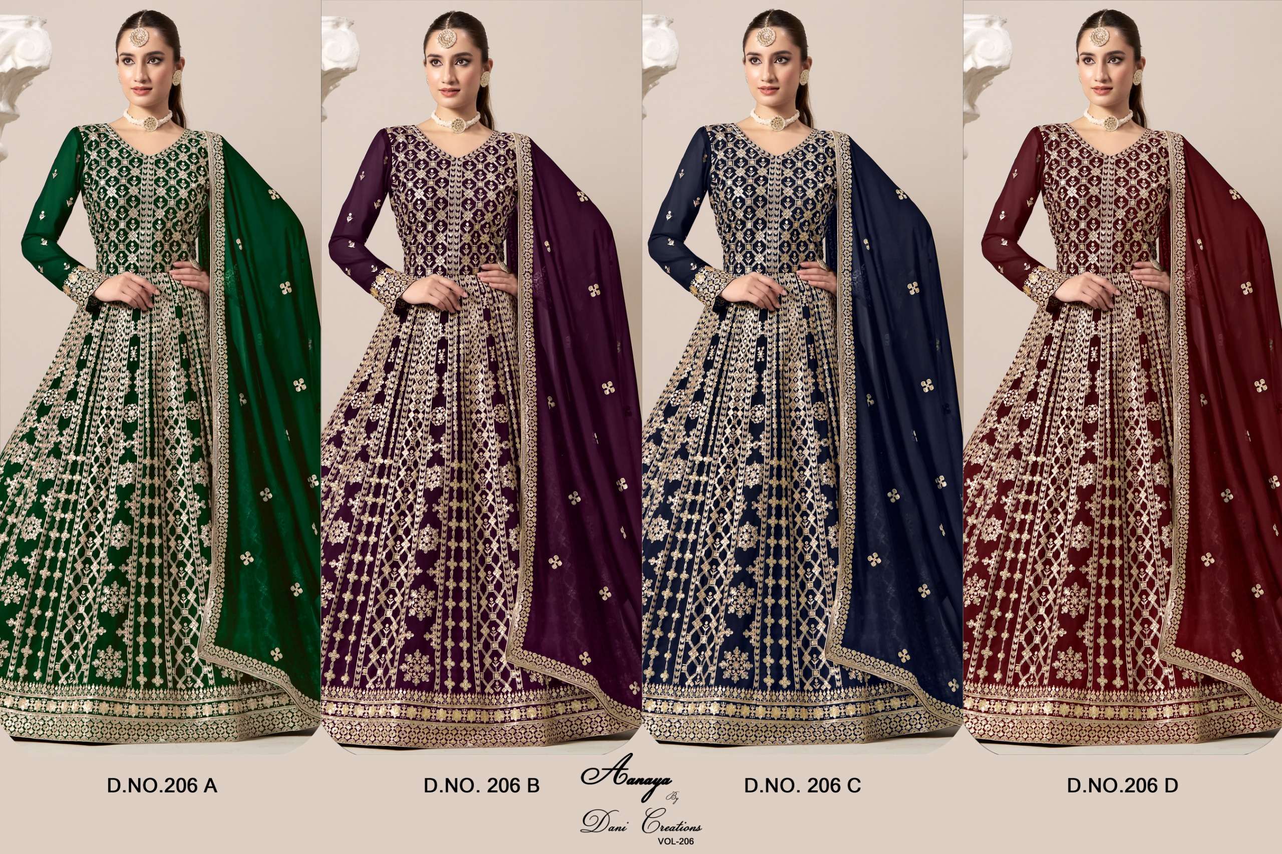 Buy Online AANAYA VOL 206 by Dani creation FAUX GEORGETTE gown collection manufacturer surat 4 Pcs of Full Catalogue at Wholesale Price. Looking for AANAYA VOL 206 by Dani creation FAUX GEORGETTE gown collection manufacturer surat Full Catalouge at Best Price? Buy Now AANAYA VOL 206 by Dani creation FAUX GEORGETTE gown collection manufacturer surat at Wholesale Rate of Rs 12780 with Total 4 Pcs from authroized dealer and supplier of Dani Creation Brand. Cost of Each piece is just only Rs 3195 which is very low and affordable price to resale the product in your retail store ,This is Surat based Wholesale Supplier & Dealer of Dani Creation Brand. Click on Brand name to Know more about Dani Creation Brand's products.Call or Whatsapp on 9898838984 for booking or enquiry