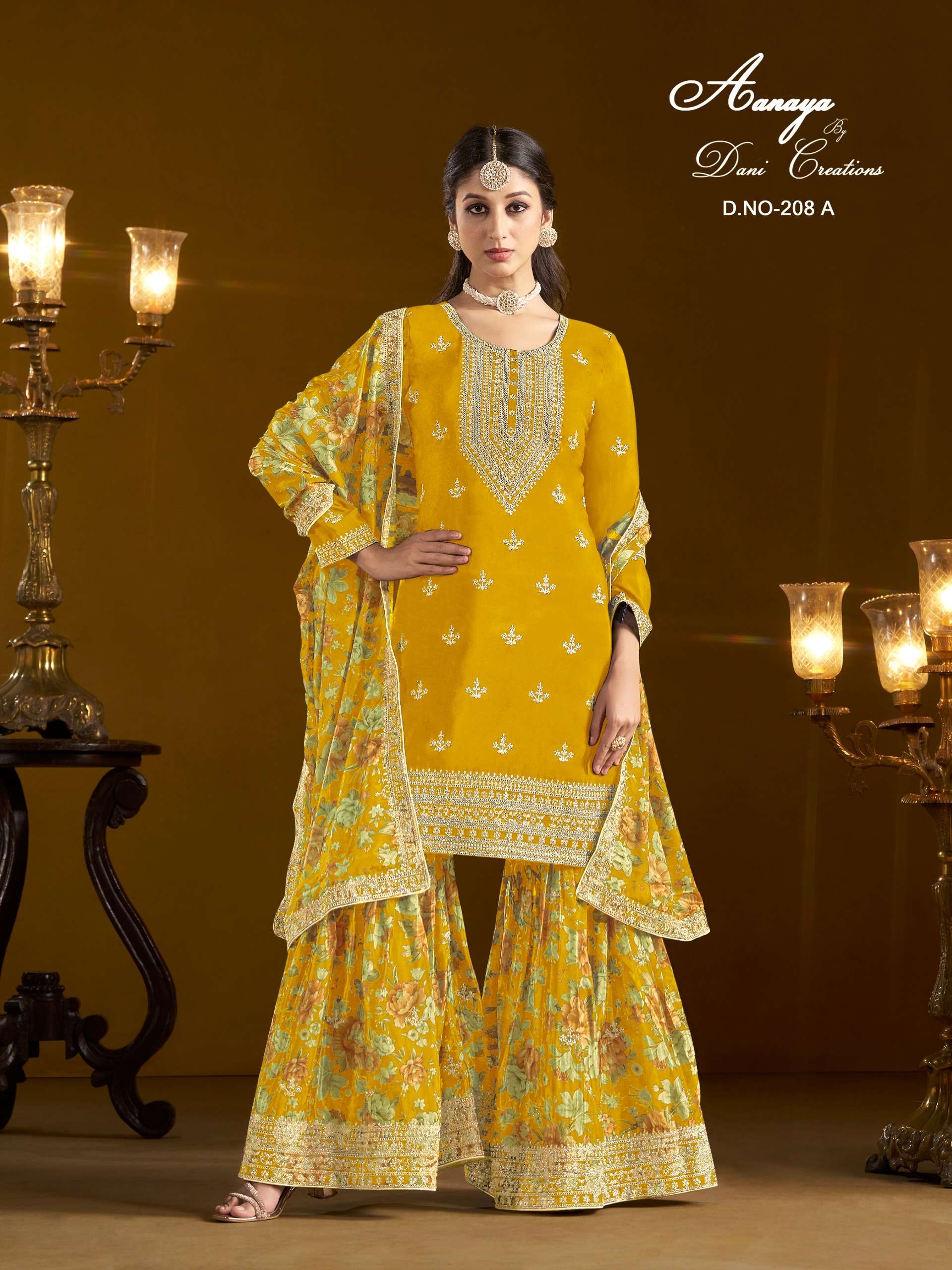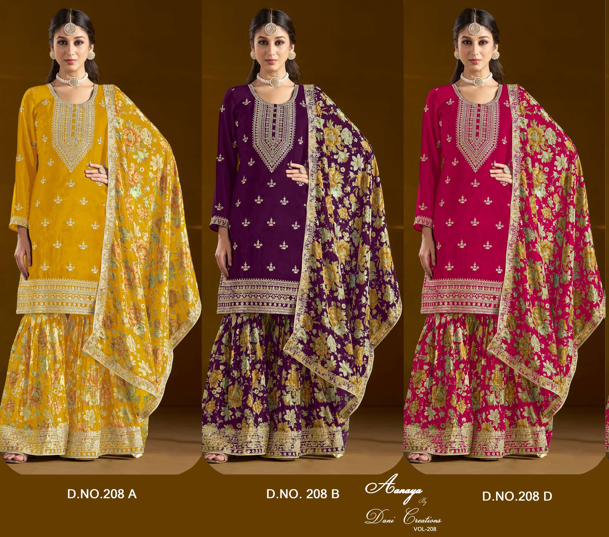Buy Online AANAYA VOL 208 by Dani creation CHINON suit collection manufacturer surat 3 Pcs of Full Catalogue at Wholesale Price. Looking for AANAYA VOL 208 by Dani creation CHINON suit collection manufacturer surat Full Catalouge at Best Price? Buy Now AANAYA VOL 208 by Dani creation CHINON suit collection manufacturer surat at Wholesale Rate of Rs 5085 with Total 3 Pcs from authroized dealer and supplier of Dani Creation Brand. Cost of Each piece is just only Rs 1695 which is very low and affordable price to resale the product in your retail store ,This is Surat based Wholesale Supplier & Dealer of Dani Creation Brand. Click on Brand name to Know more about Dani Creation Brand's products.Call or Whatsapp on 9898838984 for booking or enquiry