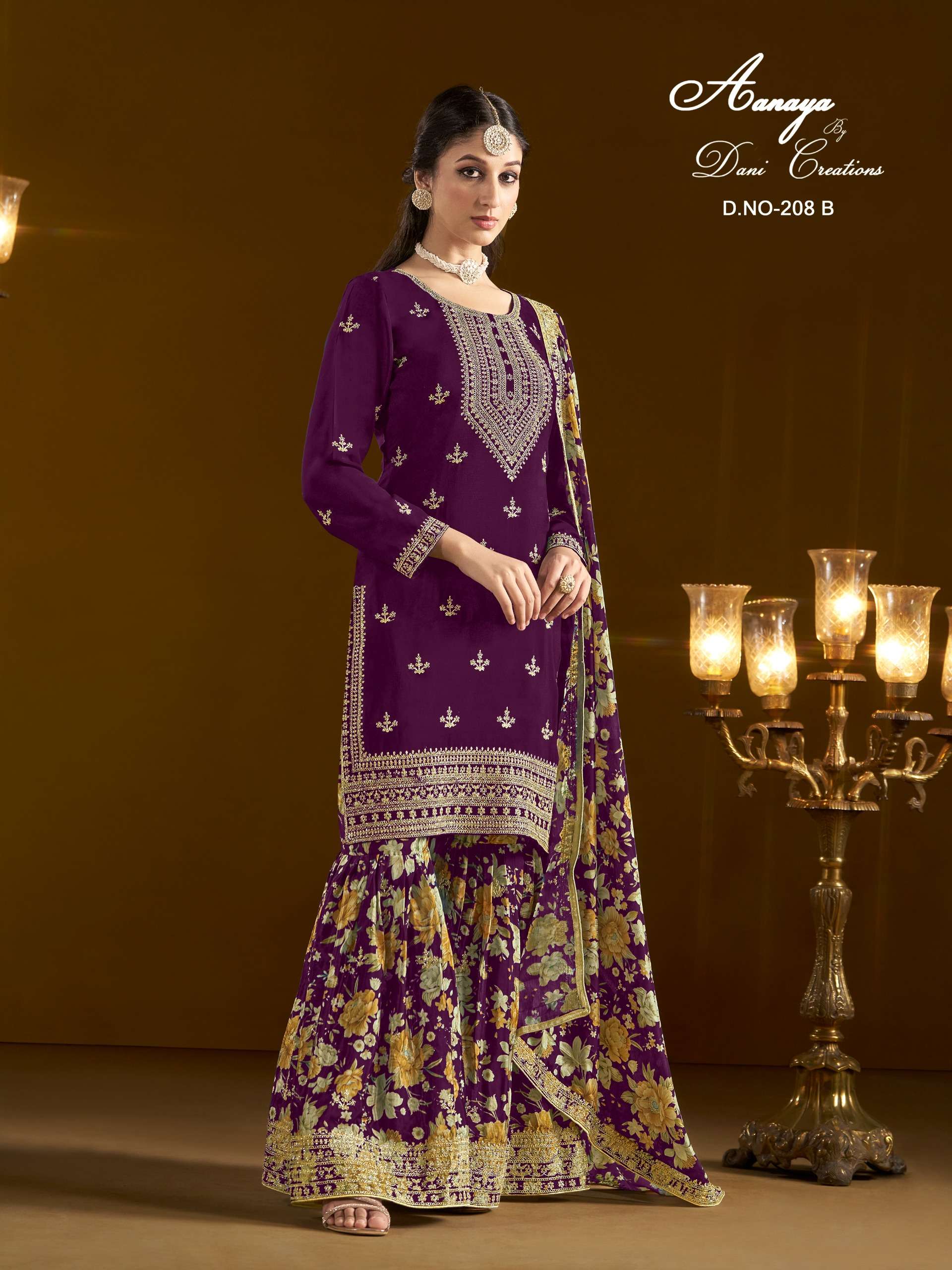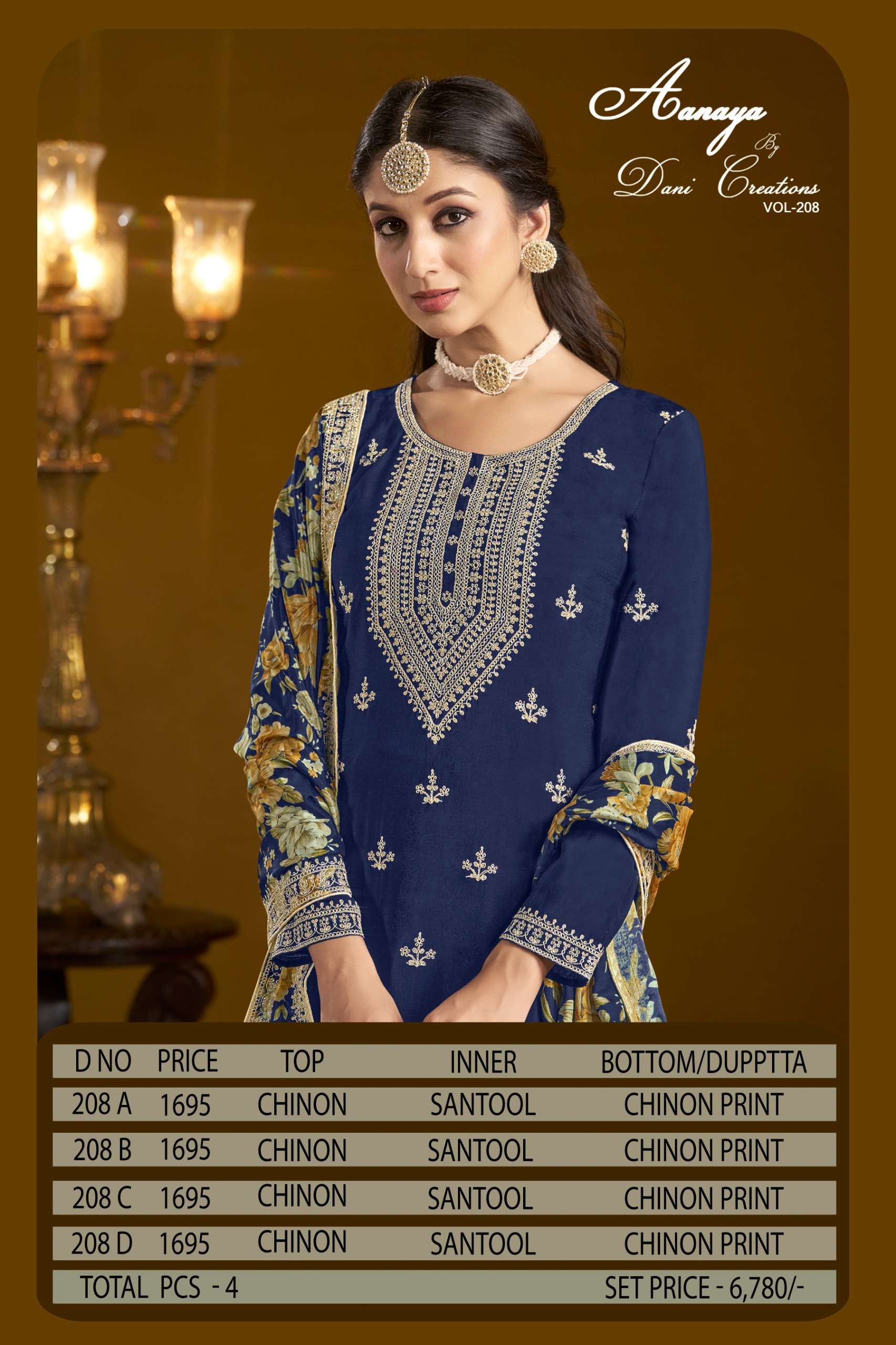 Buy Online AANAYA VOL 208 by Dani creation PLAZO suit collection manufacturer surat 4 Pcs of Full Catalogue at Wholesale Price. Looking for AANAYA VOL 208 by Dani creation PLAZO suit collection manufacturer surat Full Catalouge at Best Price? Buy Now AANAYA VOL 208 by Dani creation PLAZO suit collection manufacturer surat at Wholesale Rate of Rs 6780 with Total 4 Pcs from authroized dealer and supplier of Dani Creation Brand. Cost of Each piece is just only Rs 1695 which is very low and affordable price to resale the product in your retail store ,This is Surat based Wholesale Supplier & Dealer of Dani Creation Brand. Click on Brand name to Know more about Dani Creation Brand's products.Call or Whatsapp on 9898838984 for booking or enquiry