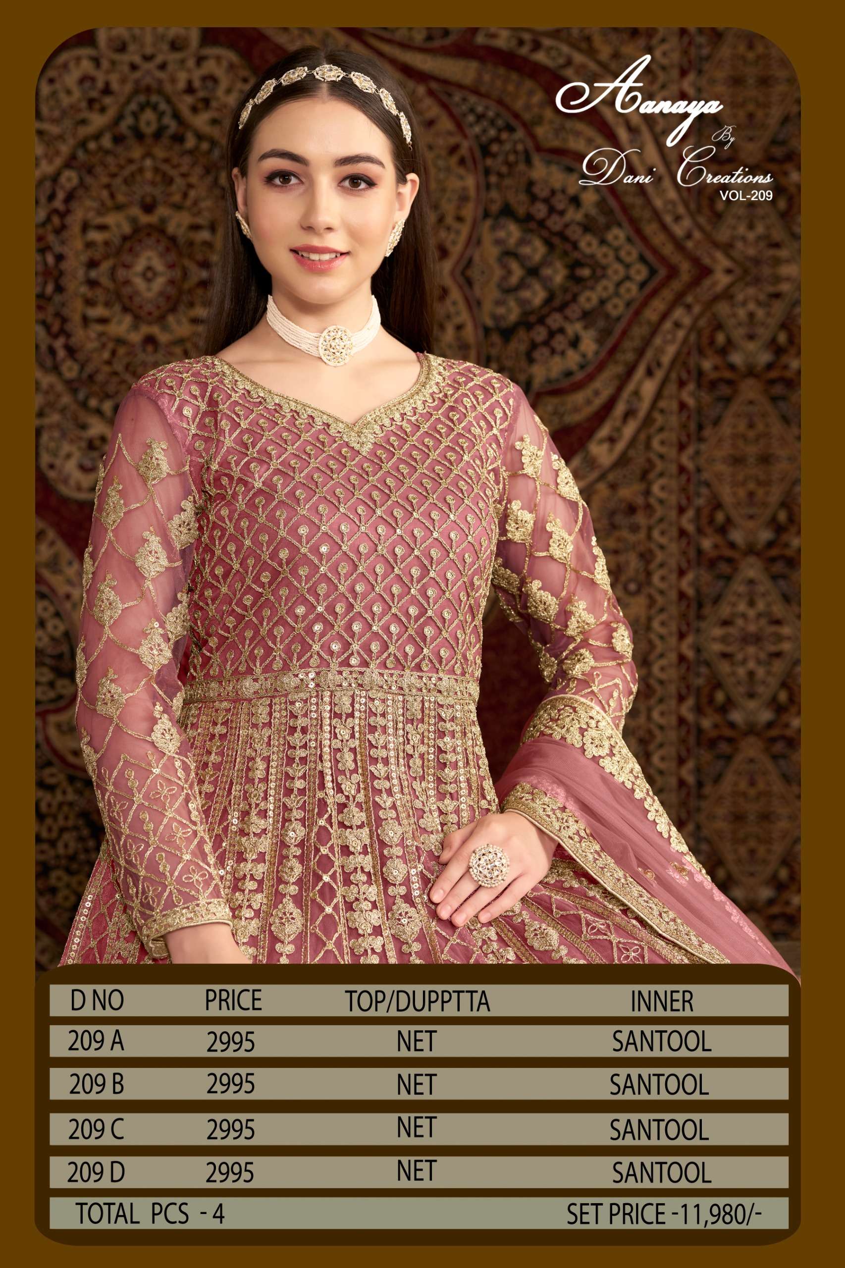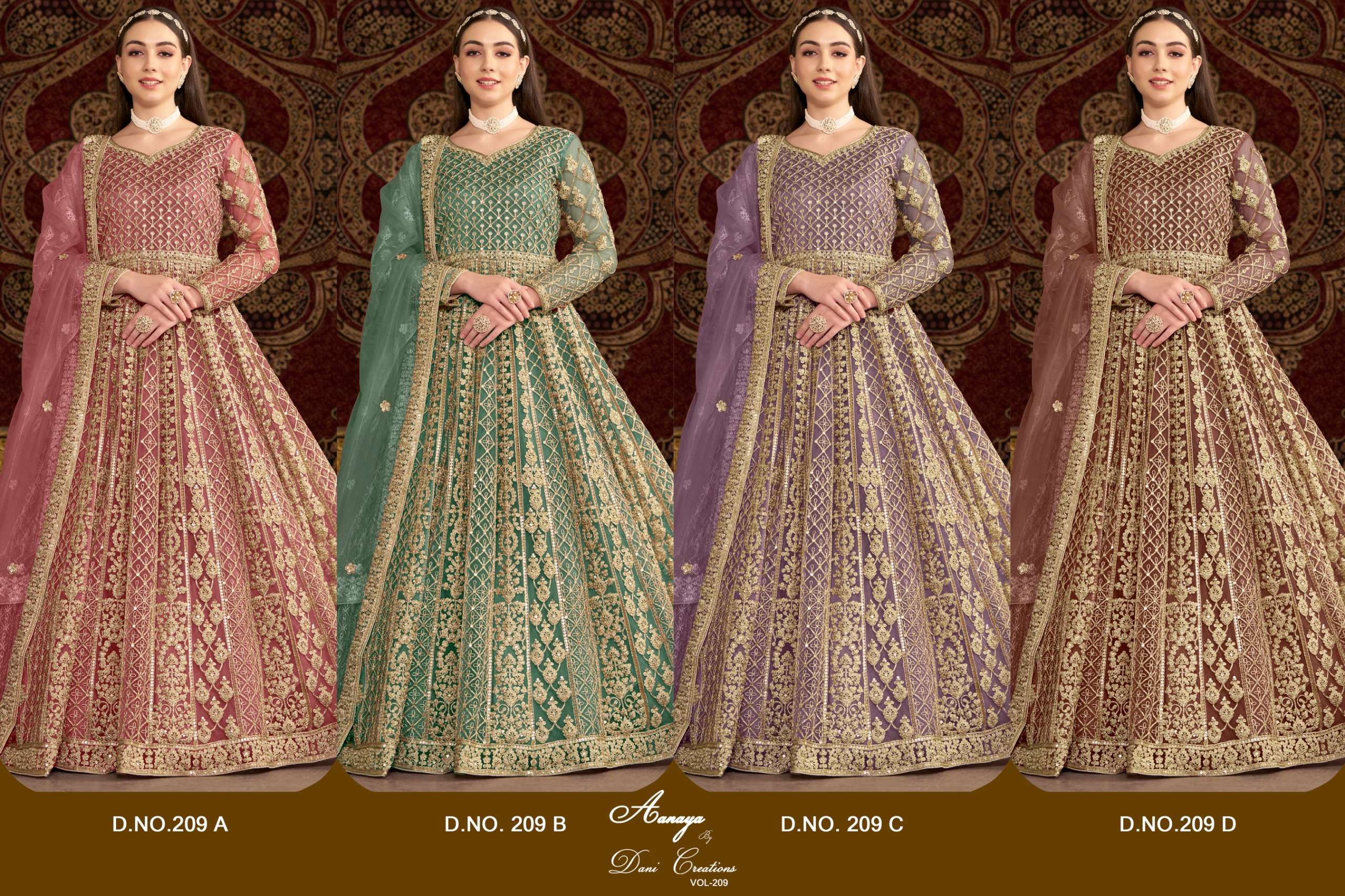 Buy Online AANAYA VOL 209 by Dani creation gown collection manufacturers surat 4 Pcs of Full Catalogue at Wholesale Price. Looking for AANAYA VOL 209 by Dani creation gown collection manufacturers surat Full Catalouge at Best Price? Buy Now AANAYA VOL 209 by Dani creation gown collection manufacturers surat at Wholesale Rate of Rs 11980 with Total 4 Pcs from authroized dealer and supplier of Dani Creation Brand. Cost of Each piece is just only Rs 2995 which is very low and affordable price to resale the product in your retail store ,This is Surat based Wholesale Supplier & Dealer of Dani Creation Brand. Click on Brand name to Know more about Dani Creation Brand's products.Call or Whatsapp on 9898838984 for booking or enquiry