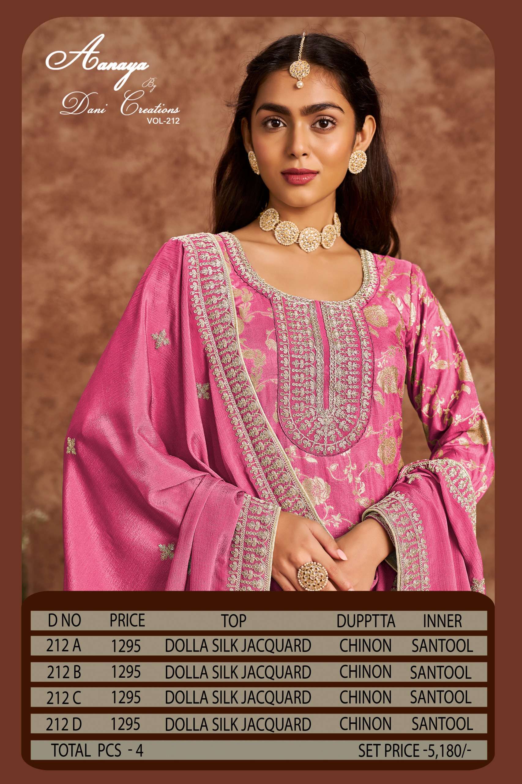 Buy Online AANAYA VOL 212 by By dani creation suit collection manufacturer surat 4 Pcs of Full Catalogue at Wholesale Price. Looking for AANAYA VOL 212 by By dani creation suit collection manufacturer surat Full Catalouge at Best Price? Buy Now AANAYA VOL 212 by By dani creation suit collection manufacturer surat at Wholesale Rate of Rs 5180 with Total 4 Pcs from authroized dealer and supplier of Dani Creation Brand. Cost of Each piece is just only Rs 1295 which is very low and affordable price to resale the product in your retail store ,This is Surat based Wholesale Supplier & Dealer of Dani Creation Brand. Click on Brand name to Know more about Dani Creation Brand's products.Call or Whatsapp on 9898838984 for booking or enquiry