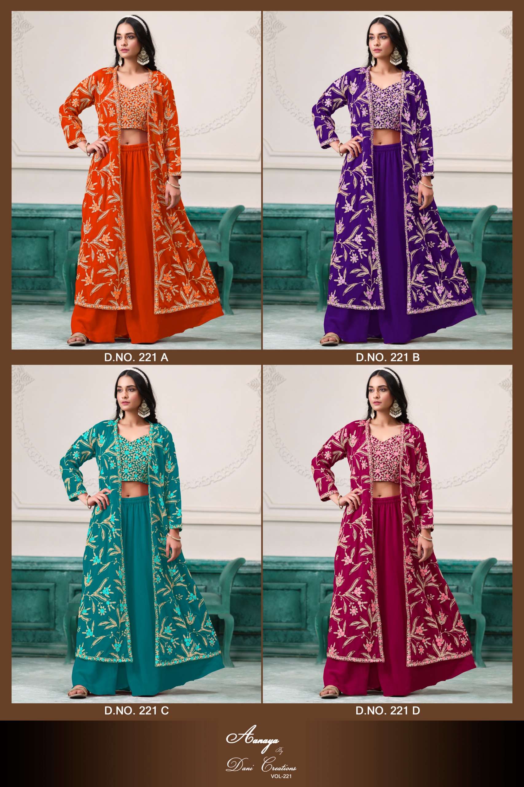 Buy Online AANAYA VOL 221 by dani creation FAUX GEORGETTE suit collection manufacturer surat 4 Pcs of Full Catalogue at Wholesale Price. Looking for AANAYA VOL 221 by dani creation FAUX GEORGETTE suit collection manufacturer surat Full Catalouge at Best Price? Buy Now AANAYA VOL 221 by dani creation FAUX GEORGETTE suit collection manufacturer surat at Wholesale Rate of Rs 0 with Total 4 Pcs from authroized dealer and supplier of Dani Creation Brand. Cost of Each piece is just only Rs 0 which is very low and affordable price to resale the product in your retail store ,This is Surat based Wholesale Supplier & Dealer of Dani Creation Brand. Click on Brand name to Know more about Dani Creation Brand's products.Call or Whatsapp on 9898838984 for booking or enquiry