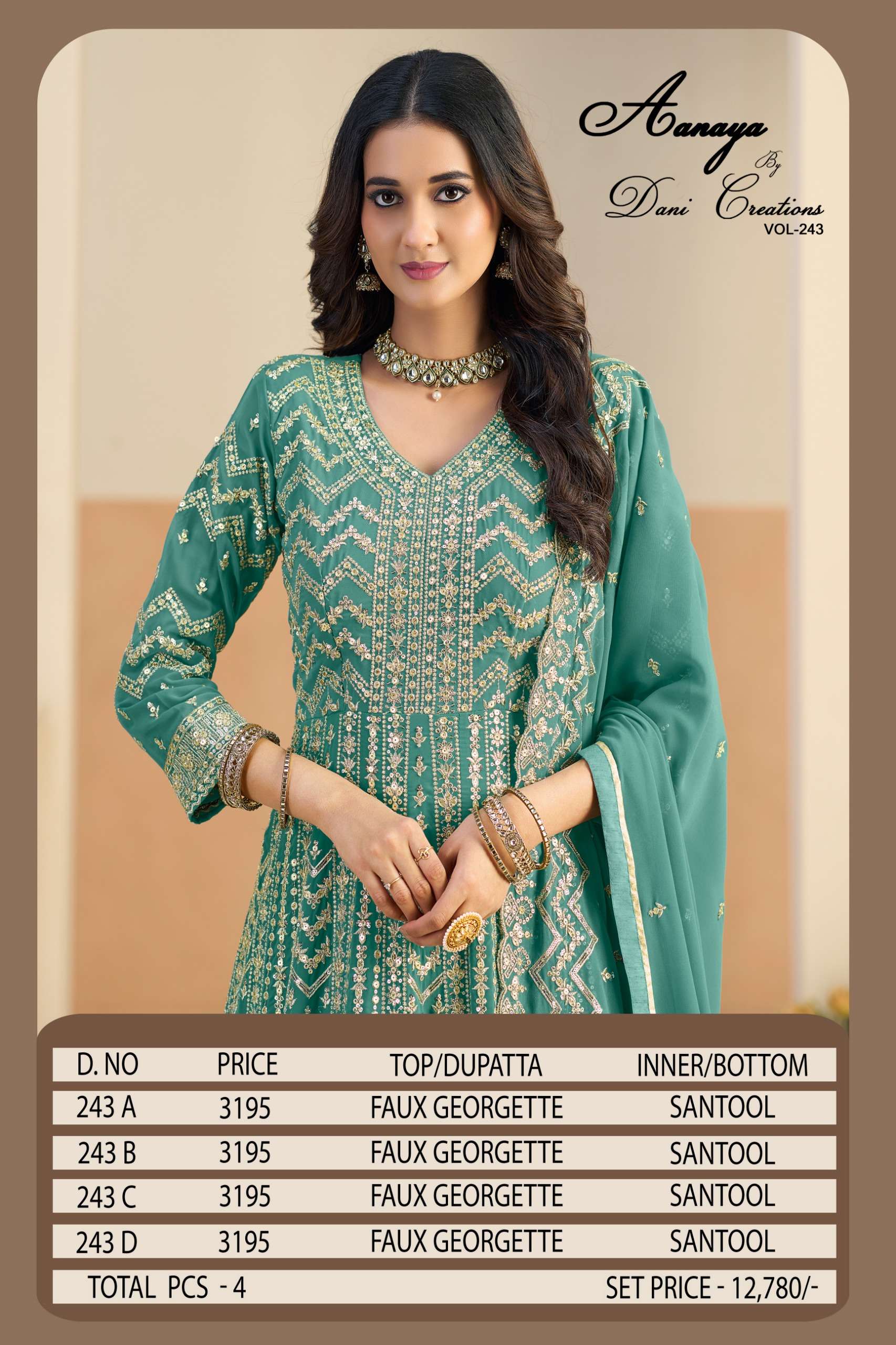 Buy Online AANAYA VOL 243 by Dani creation gown collection manufacturers surat 4 Pcs of Full Catalogue at Wholesale Price. Looking for AANAYA VOL 243 by Dani creation gown collection manufacturers surat Full Catalouge at Best Price? Buy Now AANAYA VOL 243 by Dani creation gown collection manufacturers surat at Wholesale Rate of Rs 12780 with Total 4 Pcs from authroized dealer and supplier of Dani Creation Brand. Cost of Each piece is just only Rs 3195 which is very low and affordable price to resale the product in your retail store ,This is Surat based Wholesale Supplier & Dealer of Dani Creation Brand. Click on Brand name to Know more about Dani Creation Brand's products.Call or Whatsapp on 9898838984 for booking or enquiry
