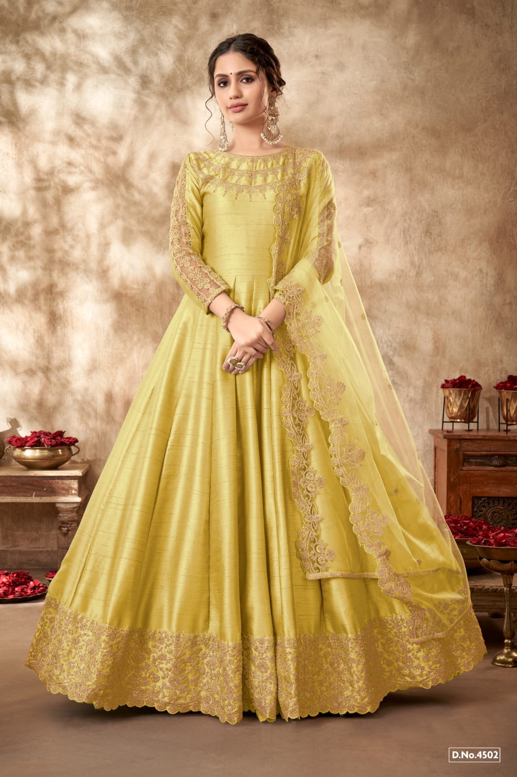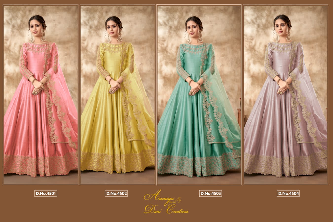 Buy Online Aanaya Vol 45 4500 Series Dani Creation Designer Gown Suit Single And Set Stockiest And Supplier From Surat 4 Pcs of Full Catalogue at Wholesale Price. Looking for Aanaya Vol 45 4500 Series Dani Creation Designer Gown Suit Single And Set Stockiest And Supplier From Surat Full Catalouge at Best Price? Buy Now Aanaya Vol 45 4500 Series Dani Creation Designer Gown Suit Single And Set Stockiest And Supplier From Surat at Wholesale Rate of Rs 9180 with Total 4 Pcs from authroized dealer and supplier of Brand. Cost of Each piece is just only Rs 2295 which is very low and affordable price to resale the product in your retail store ,This is Surat based Wholesale Supplier & Dealer of Brand. Click on Brand name to Know more about Brand's products.Call or Whatsapp on 9898838984 for booking or enquiry