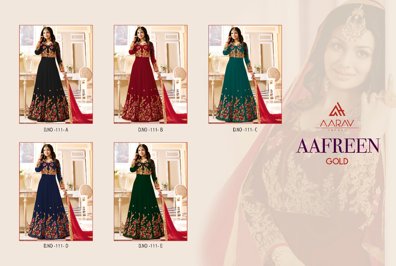 Buy Online Aarav Trendz Afreen Gold 111 Colours Gown Suit Collection 5 Pcs of Full Catalogue at Wholesale Price. Looking for Aarav Trendz Afreen Gold 111 Colours Gown Suit Collection Full Catalouge at Best Price? Buy Now Aarav Trendz Afreen Gold 111 Colours Gown Suit Collection at Wholesale Rate of Rs 9475 with Total 5 Pcs from authroized dealer and supplier of Aarav Trendz Brand. Cost of Each piece is just only Rs 1895 which is very low and affordable price to resale the product in your retail store ,This is Surat based Wholesale Supplier & Dealer of Aarav Trendz Brand. Click on Brand name to Know more about Aarav Trendz Brand's products.Call or Whatsapp on 9898838984 for booking or enquiry