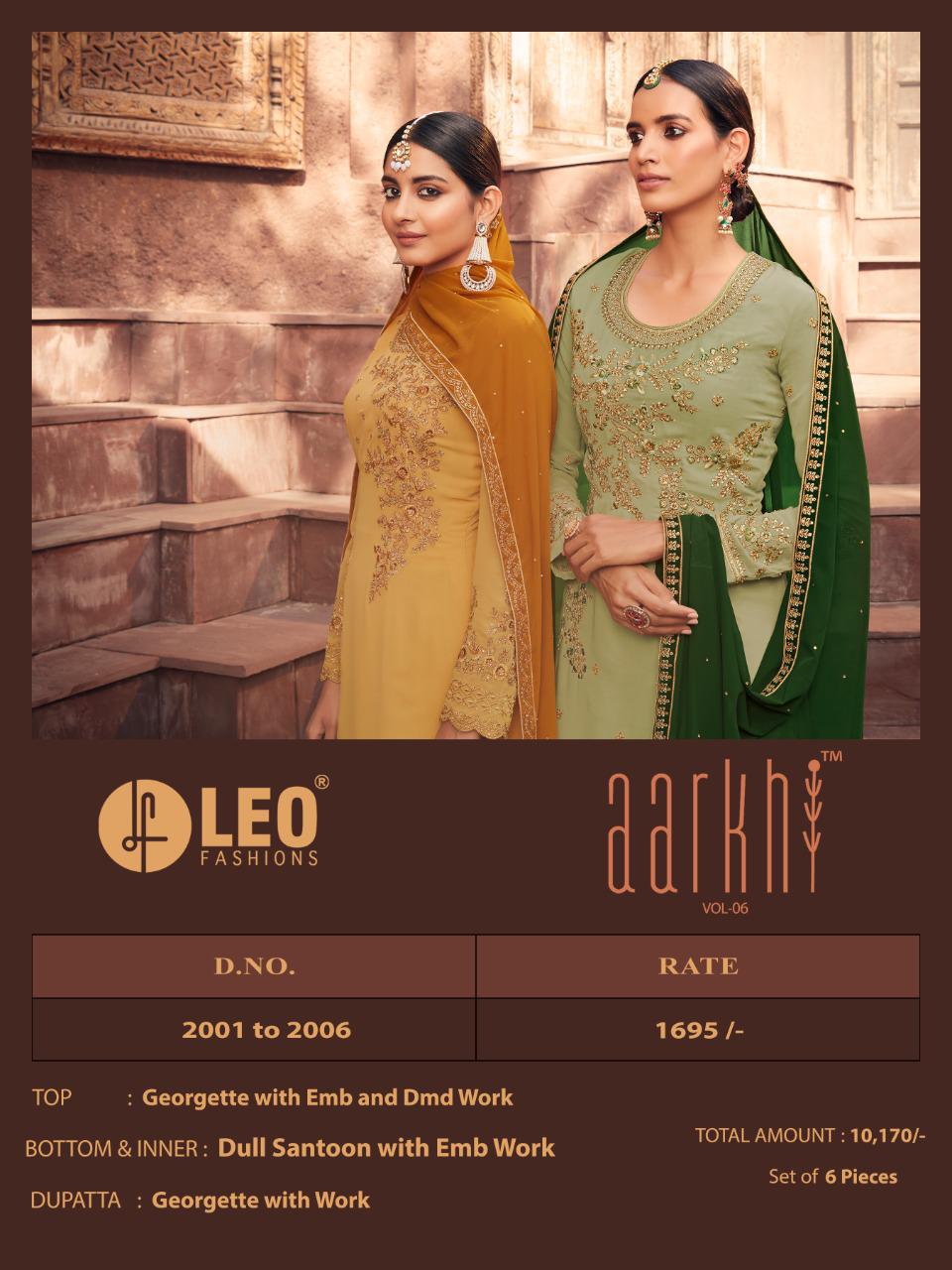 Buy Online Aarkh Vol 6 By Leo Series 2001 To 2006 Single And Set Stockiest And Supplier From Surat 6 Pcs of Full Catalogue at Wholesale Price. Looking for Aarkh Vol 6 By Leo Series 2001 To 2006 Single And Set Stockiest And Supplier From Surat Full Catalouge at Best Price? Buy Now Aarkh Vol 6 By Leo Series 2001 To 2006 Single And Set Stockiest And Supplier From Surat at Wholesale Rate of Rs 10170 with Total 6 Pcs from authroized dealer and supplier of LEO FASHIONS Brand. Cost of Each piece is just only Rs 1695 which is very low and affordable price to resale the product in your retail store ,This is Surat based Wholesale Supplier & Dealer of LEO FASHIONS Brand. Click on Brand name to Know more about LEO FASHIONS Brand's products.Call or Whatsapp on 9898838984 for booking or enquiry