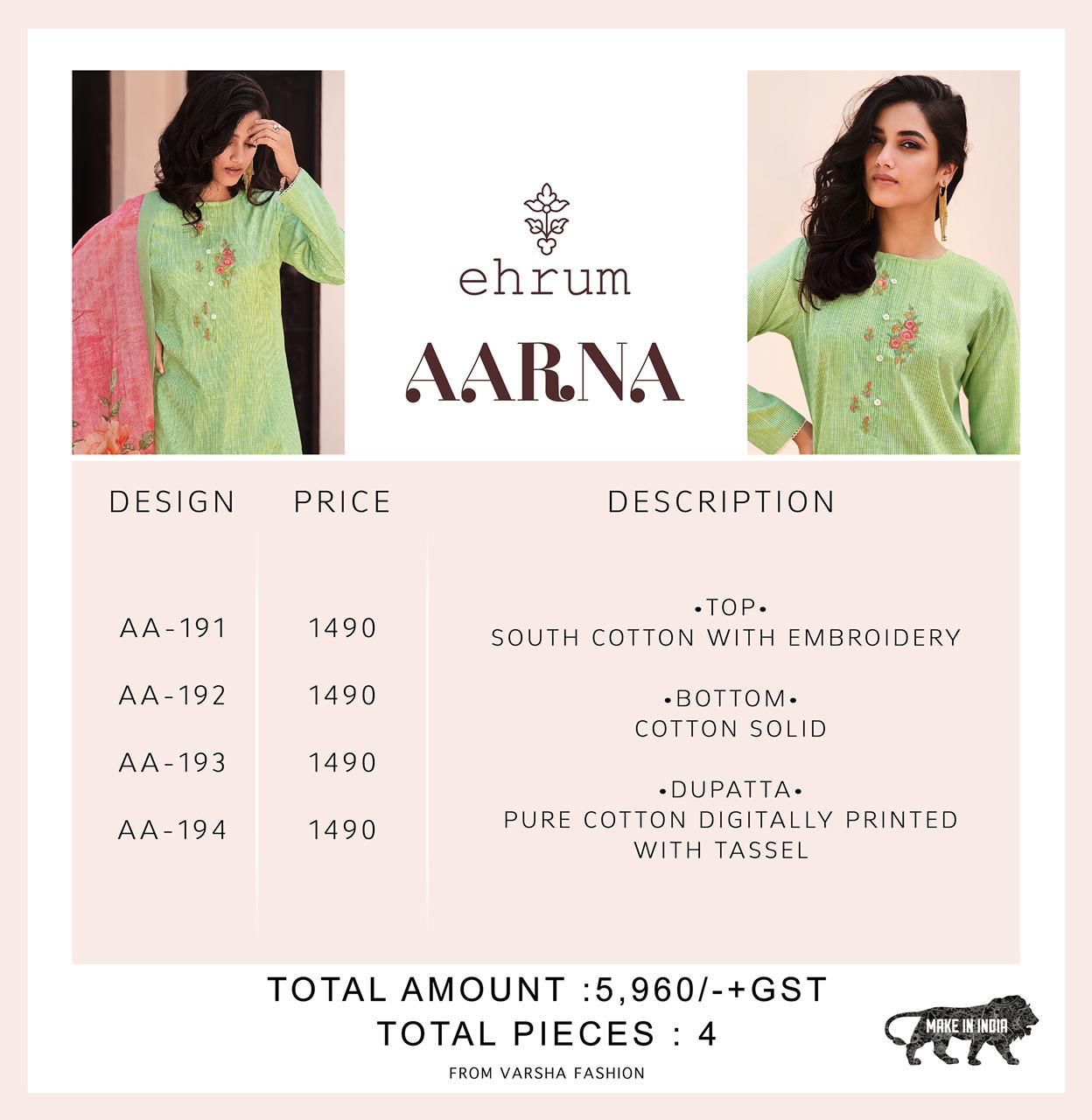 Buy Online Aarna By Varsha Ehrum Designer Cotton Suit Wholesale Supplier Traders In Surat 4 Pcs of Full Catalogue at Wholesale Price. Looking for Aarna By Varsha Ehrum Designer Cotton Suit Wholesale Supplier Traders In Surat Full Catalouge at Best Price? Buy Now Aarna By Varsha Ehrum Designer Cotton Suit Wholesale Supplier Traders In Surat at Wholesale Rate of Rs 5960 with Total 4 Pcs from authroized dealer and supplier of Brand. Cost of Each piece is just only Rs 1490 which is very low and affordable price to resale the product in your retail store ,This is Surat based Wholesale Supplier & Dealer of Brand. Click on Brand name to Know more about Brand's products.Call or Whatsapp on 9898838984 for booking or enquiry