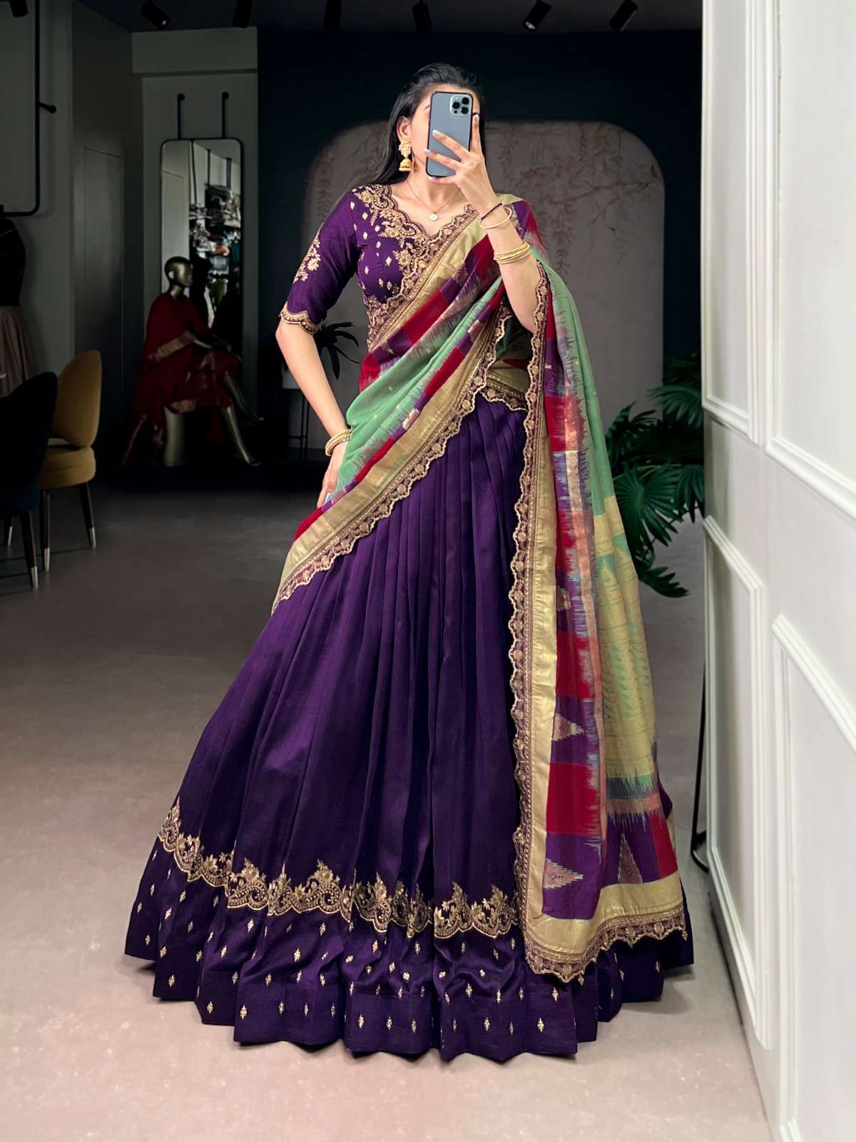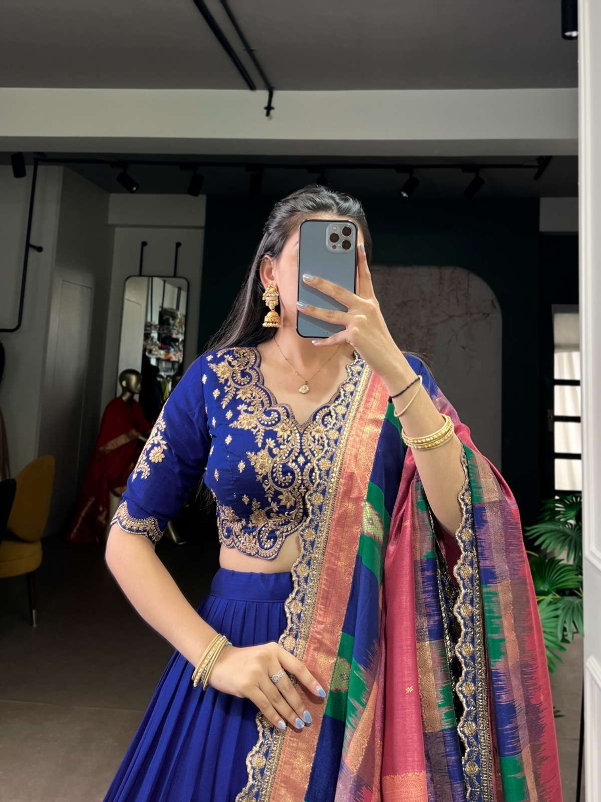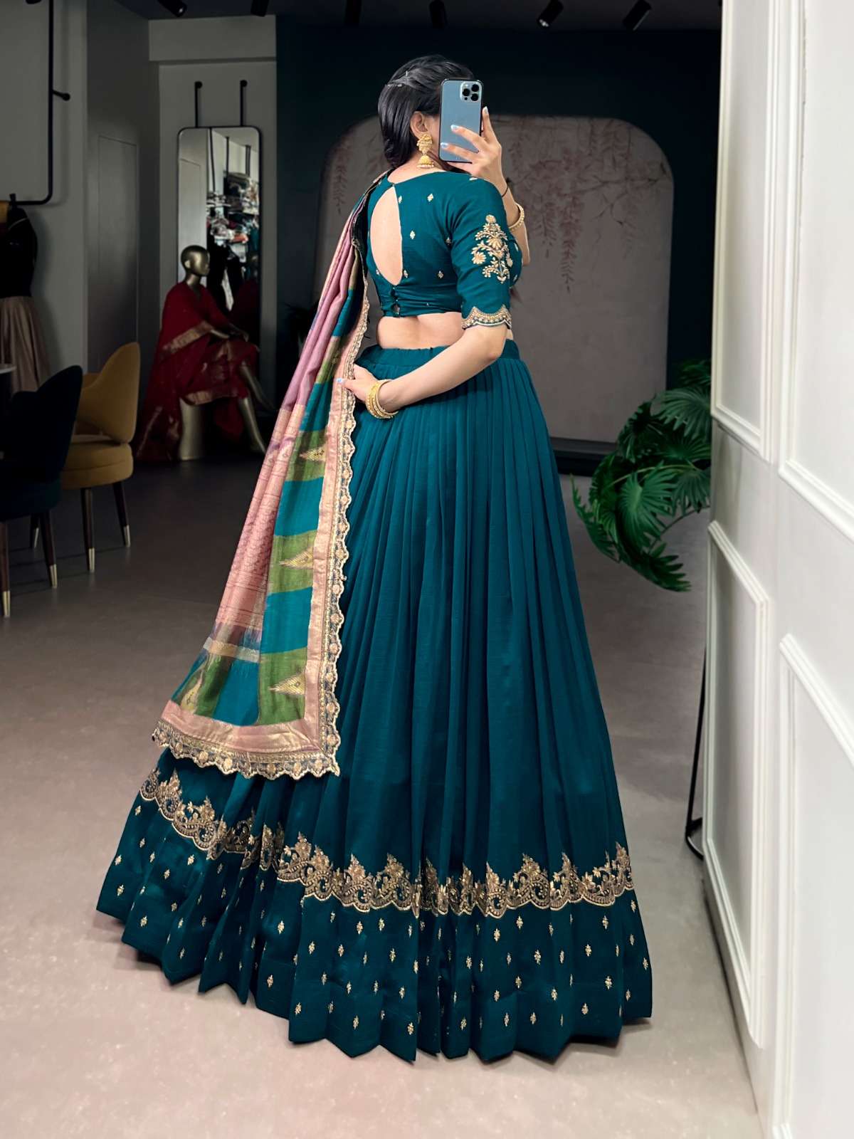 When detailed thread embroidery meets soft shimmer on Vichitra silk — a perfect lehenga choli for weddings & festivals 🌸
