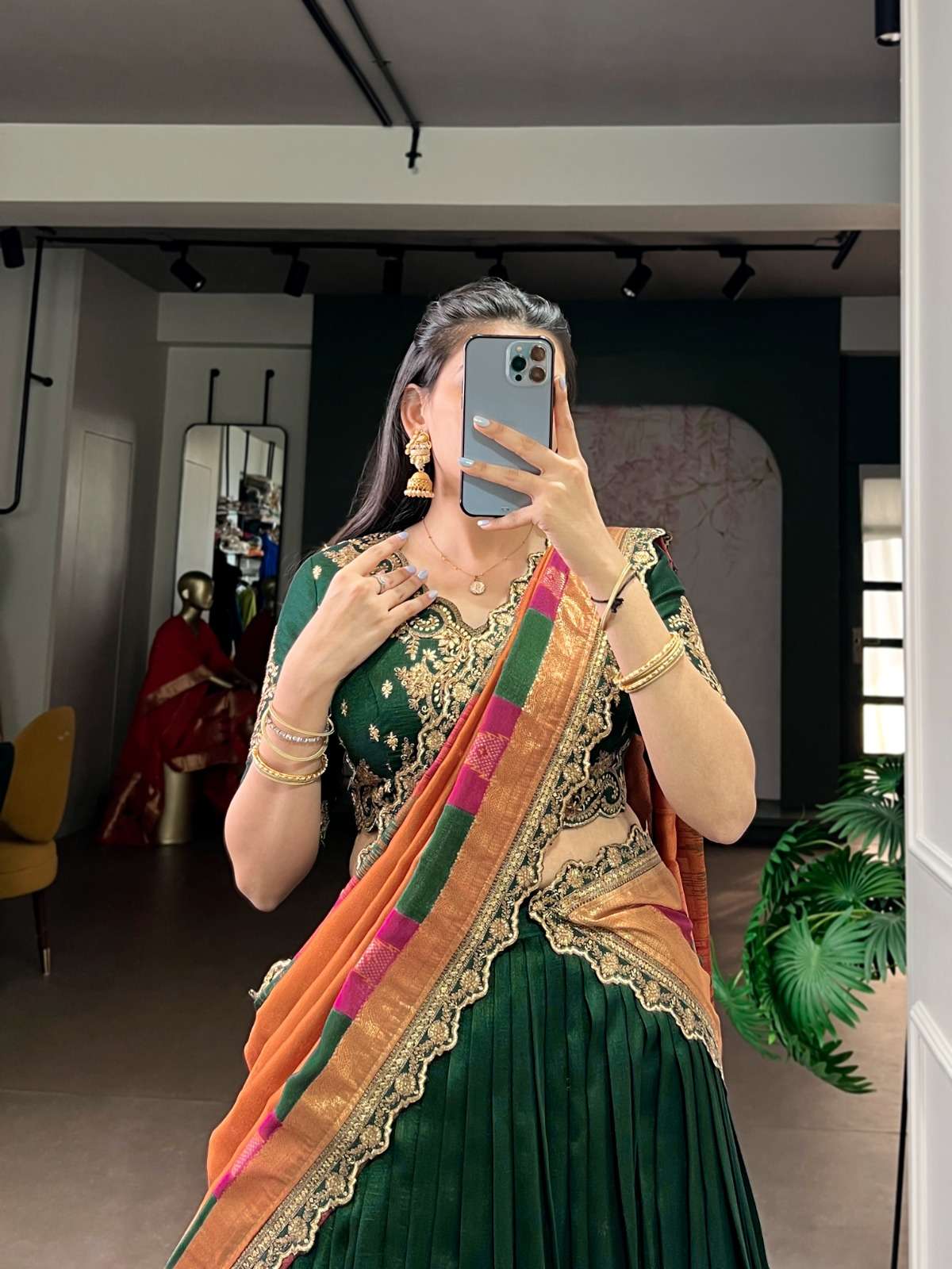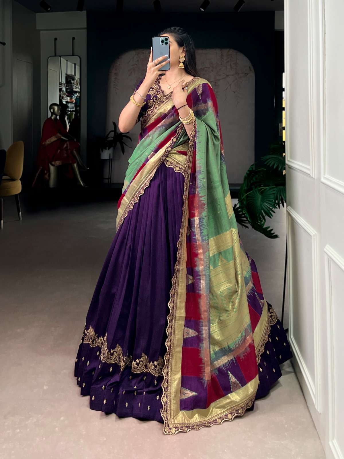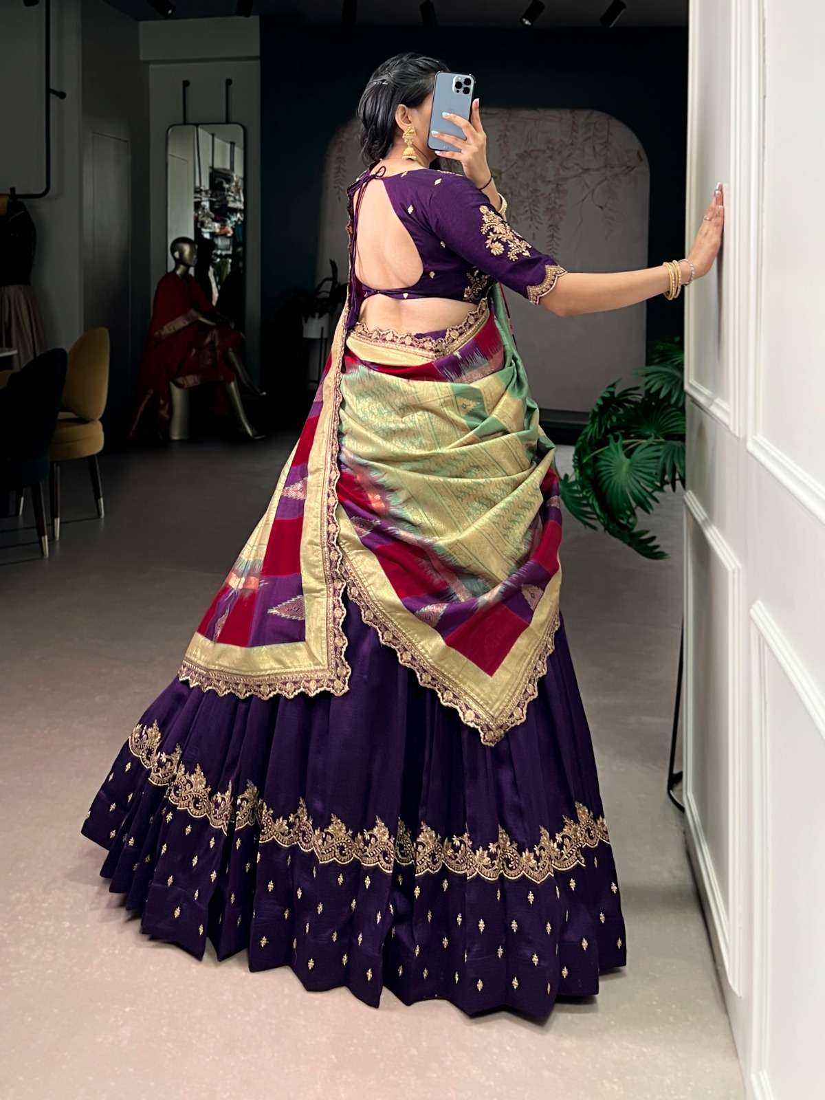 When detailed thread embroidery meets soft shimmer on Vichitra silk — a perfect lehenga choli for weddings & festivals 🌸