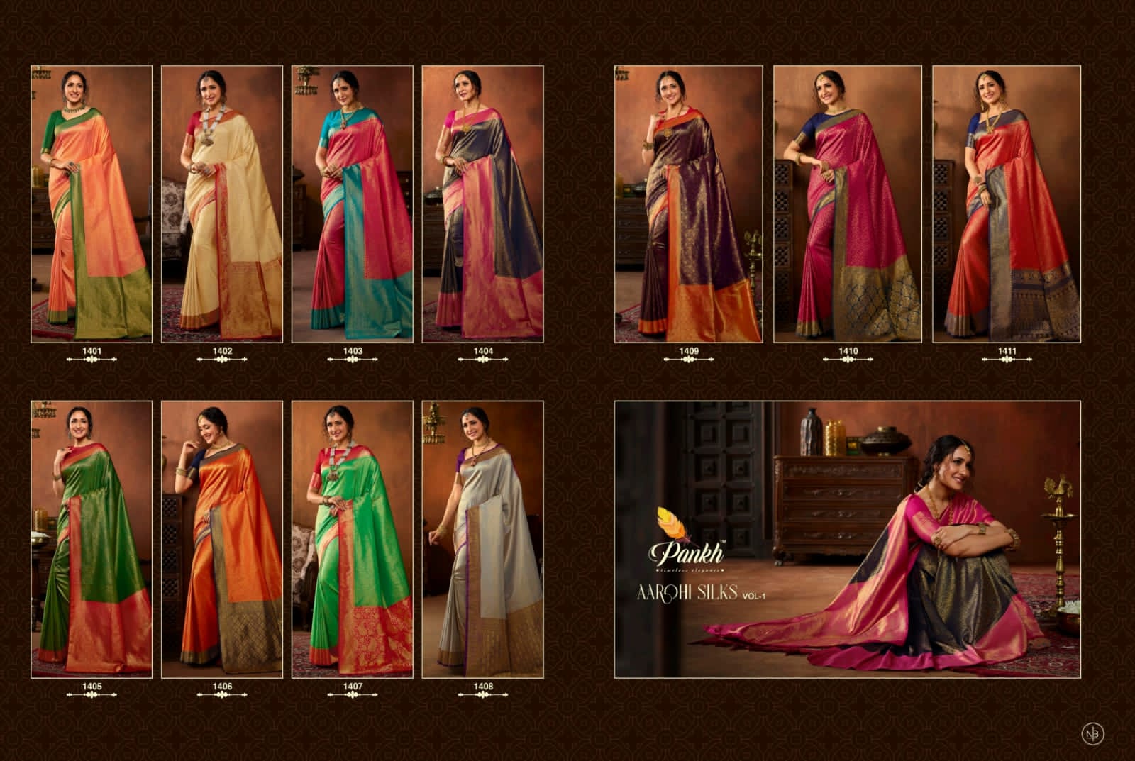 Buy Online Aarohi Silks By Pankh Wholesaler Supplier From Surat 11 Pcs of Full Catalogue at Wholesale Price. Looking for Aarohi Silks By Pankh Wholesaler Supplier From Surat Full Catalouge at Best Price? Buy Now Aarohi Silks By Pankh Wholesaler Supplier From Surat at Wholesale Rate of Rs 19745 with Total 11 Pcs from authroized dealer and supplier of Brand. Cost of Each piece is just only Rs 1795 which is very low and affordable price to resale the product in your retail store ,This is Surat based Wholesale Supplier & Dealer of Brand. Click on Brand name to Know more about Brand's products.Call or Whatsapp on 9898838984 for booking or enquiry