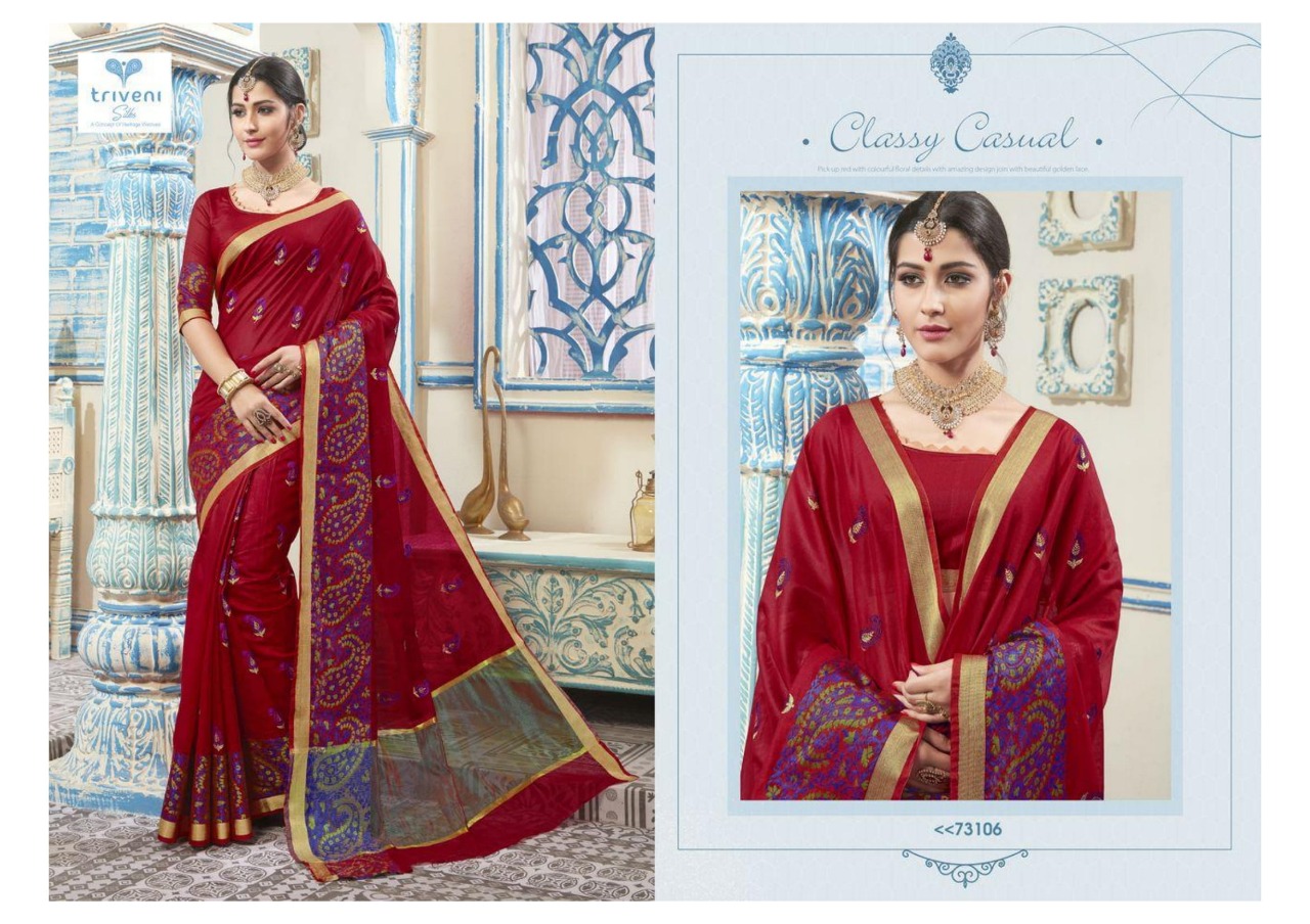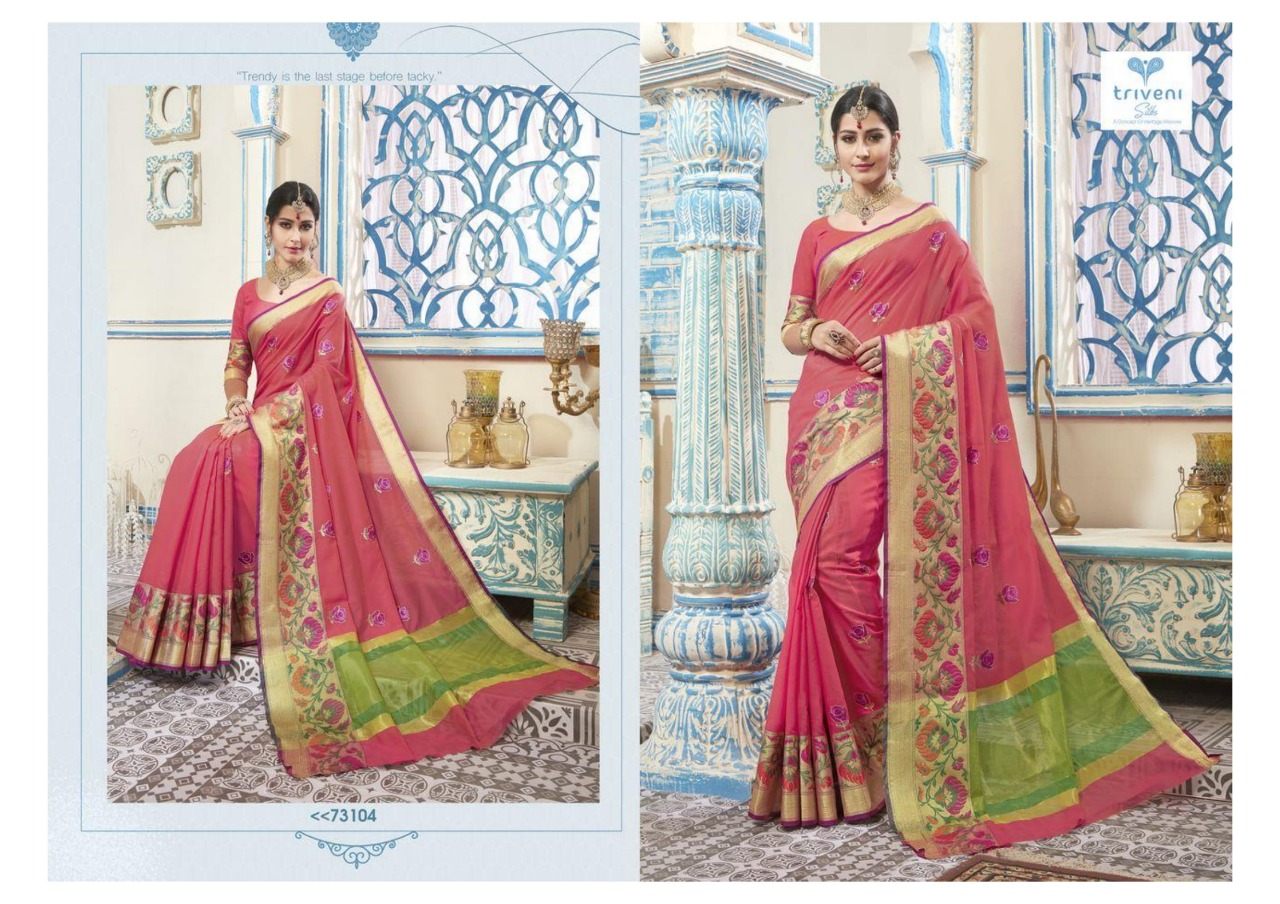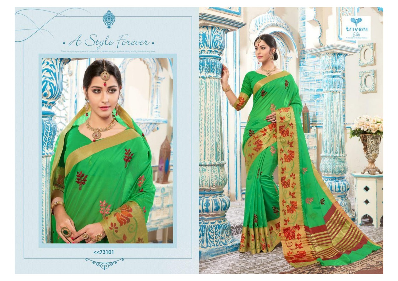 Buy Online Aarvi By Triveni 73101 Series Fancy Designer Kota Embroidery Saree Collection Wholesaler Surat 8 Pcs of Full Catalogue at Wholesale Price. Looking for Aarvi By Triveni 73101 Series Fancy Designer Kota Embroidery Saree Collection Wholesaler Surat Full Catalouge at Best Price? Buy Now Aarvi By Triveni 73101 Series Fancy Designer Kota Embroidery Saree Collection Wholesaler Surat at Wholesale Rate of Rs 7128 with Total 8 Pcs from authroized dealer and supplier of TRIVENI Brand. Cost of Each piece is just only Rs 891 which is very low and affordable price to resale the product in your retail store ,This is Surat based Wholesale Supplier & Dealer of TRIVENI Brand. Click on Brand name to Know more about TRIVENI Brand's products.Call or Whatsapp on 9898838984 for booking or enquiry