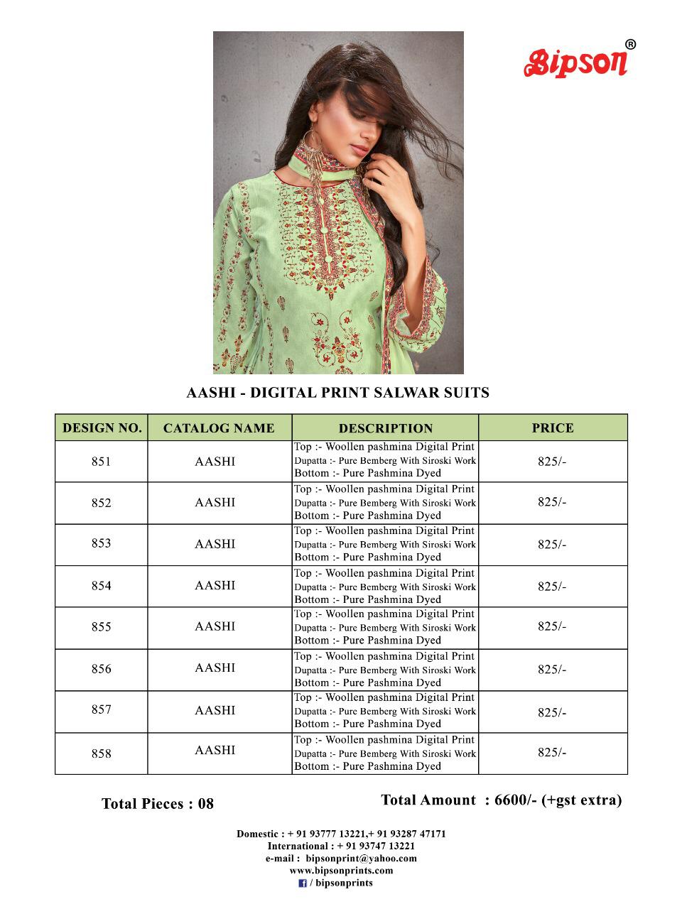 Buy Online Aashi By Bipson Designer Party Wear Suits Wholesale Supplier Nd Dealer Gujarat 8 Pcs of Full Catalogue at Wholesale Price. Looking for Aashi By Bipson Designer Party Wear Suits Wholesale Supplier Nd Dealer Gujarat Full Catalouge at Best Price? Buy Now Aashi By Bipson Designer Party Wear Suits Wholesale Supplier Nd Dealer Gujarat at Wholesale Rate of Rs 6600 with Total 8 Pcs from authroized dealer and supplier of Brand. Cost of Each piece is just only Rs 825 which is very low and affordable price to resale the product in your retail store ,This is Surat based Wholesale Supplier & Dealer of Brand. Click on Brand name to Know more about Brand's products.Call or Whatsapp on 9898838984 for booking or enquiry