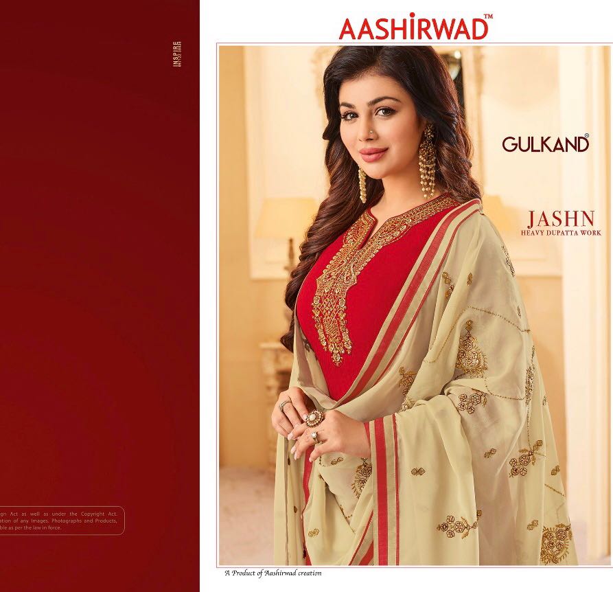 Buy Online Aashirwad Gulkand Jashn Designer Party Wear Suits Wholesale Supplier And Dealer Surat 7 Pcs of Full Catalogue at Wholesale Price. Looking for Aashirwad Gulkand Jashn Designer Party Wear Suits Wholesale Supplier And Dealer Surat Full Catalouge at Best Price? Buy Now Aashirwad Gulkand Jashn Designer Party Wear Suits Wholesale Supplier And Dealer Surat at Wholesale Rate of Rs 11865 with Total 7 Pcs from authroized dealer and supplier of AASHIRWAD Brand. Cost of Each piece is just only Rs 1695 which is very low and affordable price to resale the product in your retail store ,This is Surat based Wholesale Supplier & Dealer of AASHIRWAD Brand. Click on Brand name to Know more about AASHIRWAD Brand's products.Call or Whatsapp on 9898838984 for booking or enquiry