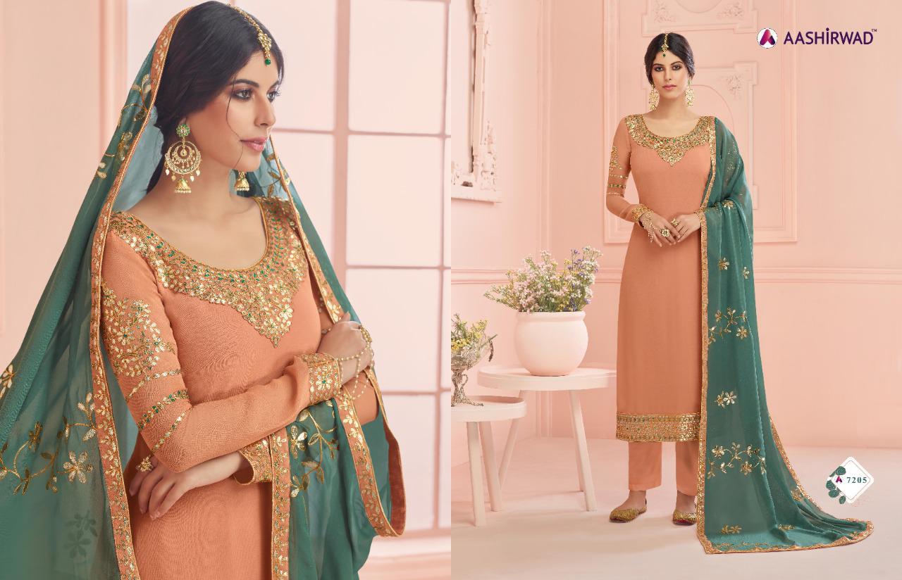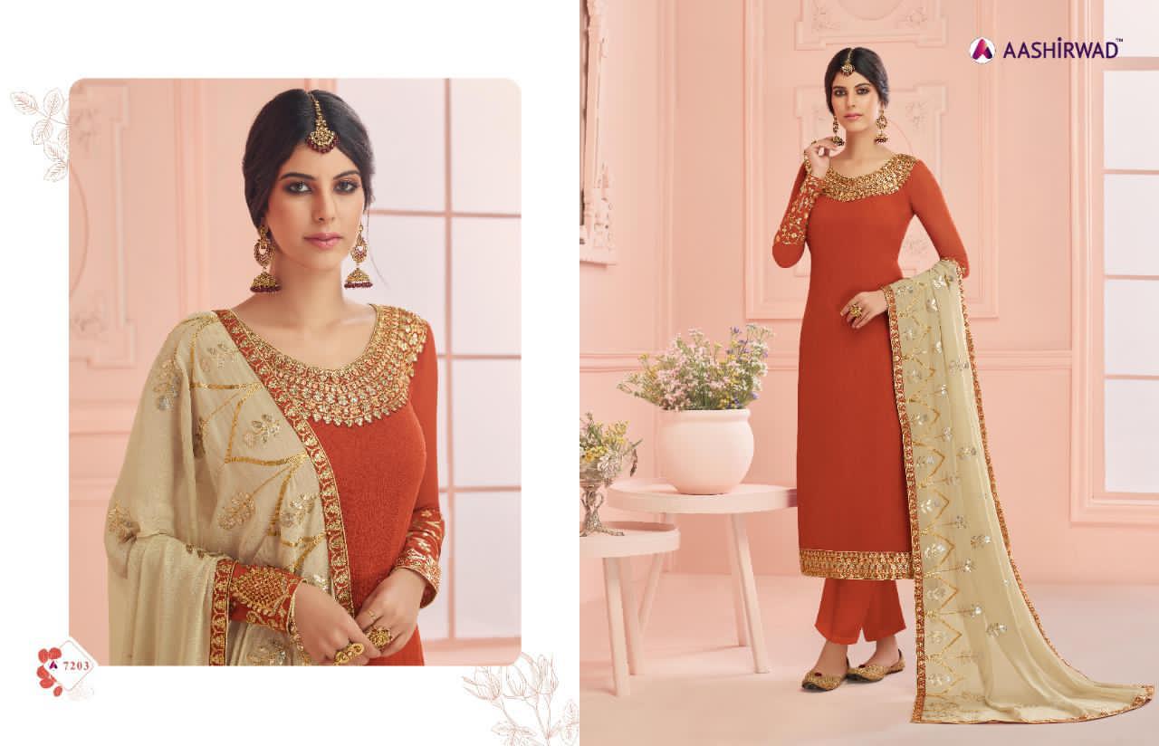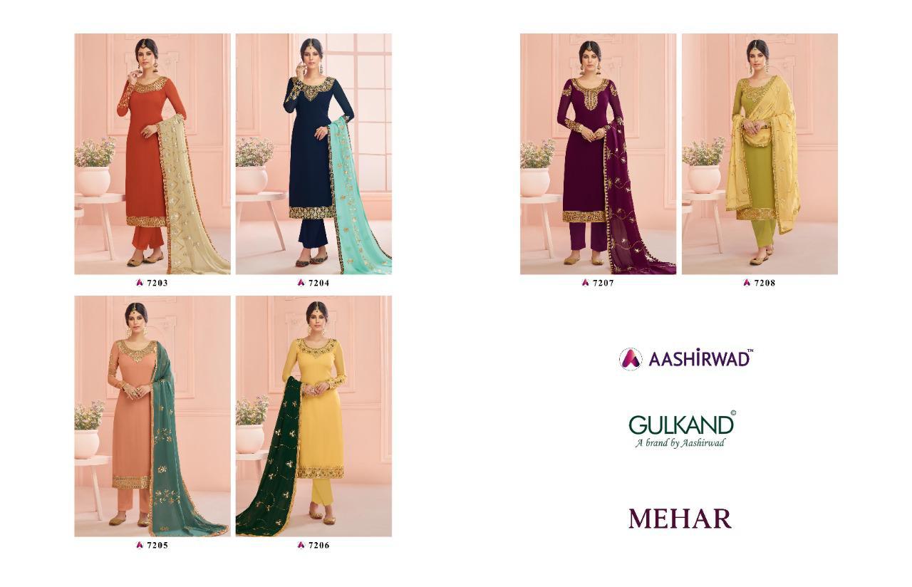 Buy Online Aashirwad Mehar Series 7203 To 7208 Designer Party Wear Suits Wholesale Supplier Gujarat 6 Pcs of Full Catalogue at Wholesale Price. Looking for Aashirwad Mehar Series 7203 To 7208 Designer Party Wear Suits Wholesale Supplier Gujarat Full Catalouge at Best Price? Buy Now Aashirwad Mehar Series 7203 To 7208 Designer Party Wear Suits Wholesale Supplier Gujarat at Wholesale Rate of Rs 10170 with Total 6 Pcs from authroized dealer and supplier of AASHIRWAD Brand. Cost of Each piece is just only Rs 1695 which is very low and affordable price to resale the product in your retail store ,This is Surat based Wholesale Supplier & Dealer of AASHIRWAD Brand. Click on Brand name to Know more about AASHIRWAD Brand's products.Call or Whatsapp on 9898838984 for booking or enquiry