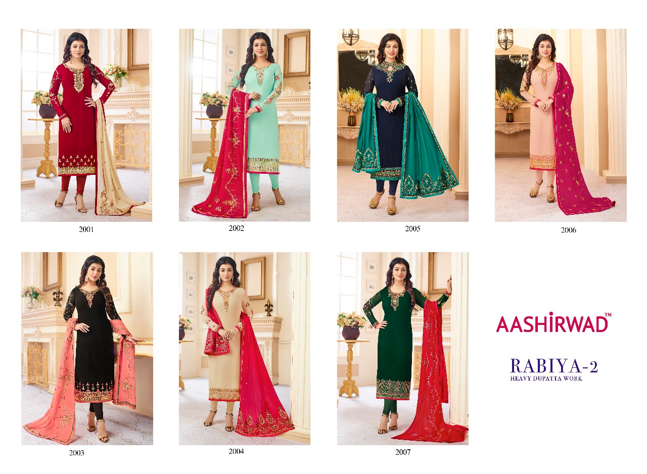 Buy Online Aashirwad Rabiya Vol 2 Designer Heavy Dupatta Suit Collectio 7 Pcs of Full Catalogue at Wholesale Price. Looking for Aashirwad Rabiya Vol 2 Designer Heavy Dupatta Suit Collectio Full Catalouge at Best Price? Buy Now Aashirwad Rabiya Vol 2 Designer Heavy Dupatta Suit Collectio at Wholesale Rate of Rs 11865 with Total 7 Pcs from authroized dealer and supplier of AASHIRWAD Brand. Cost of Each piece is just only Rs 1695 which is very low and affordable price to resale the product in your retail store ,This is Surat based Wholesale Supplier & Dealer of AASHIRWAD Brand. Click on Brand name to Know more about AASHIRWAD Brand's products.Call or Whatsapp on 9898838984 for booking or enquiry