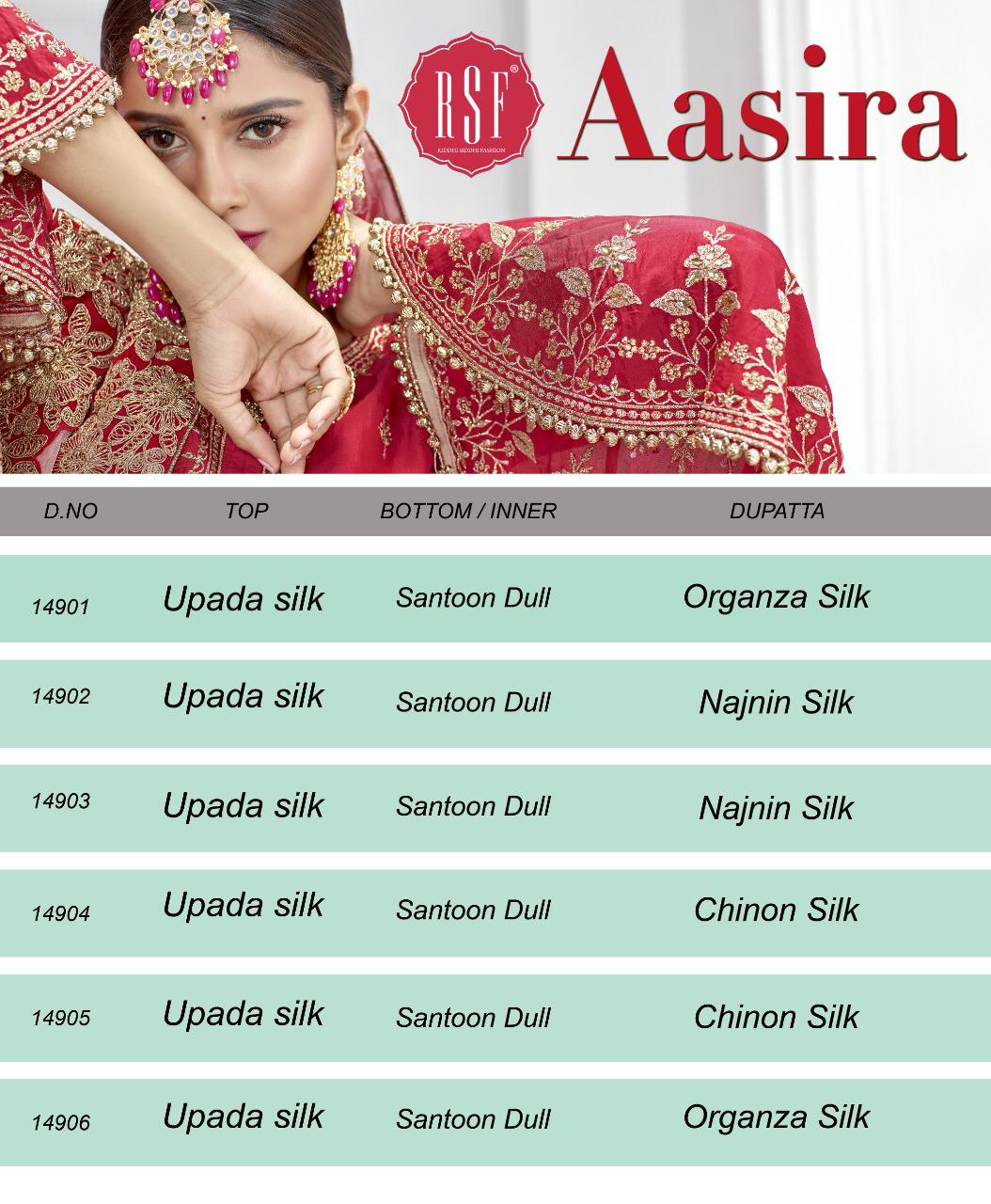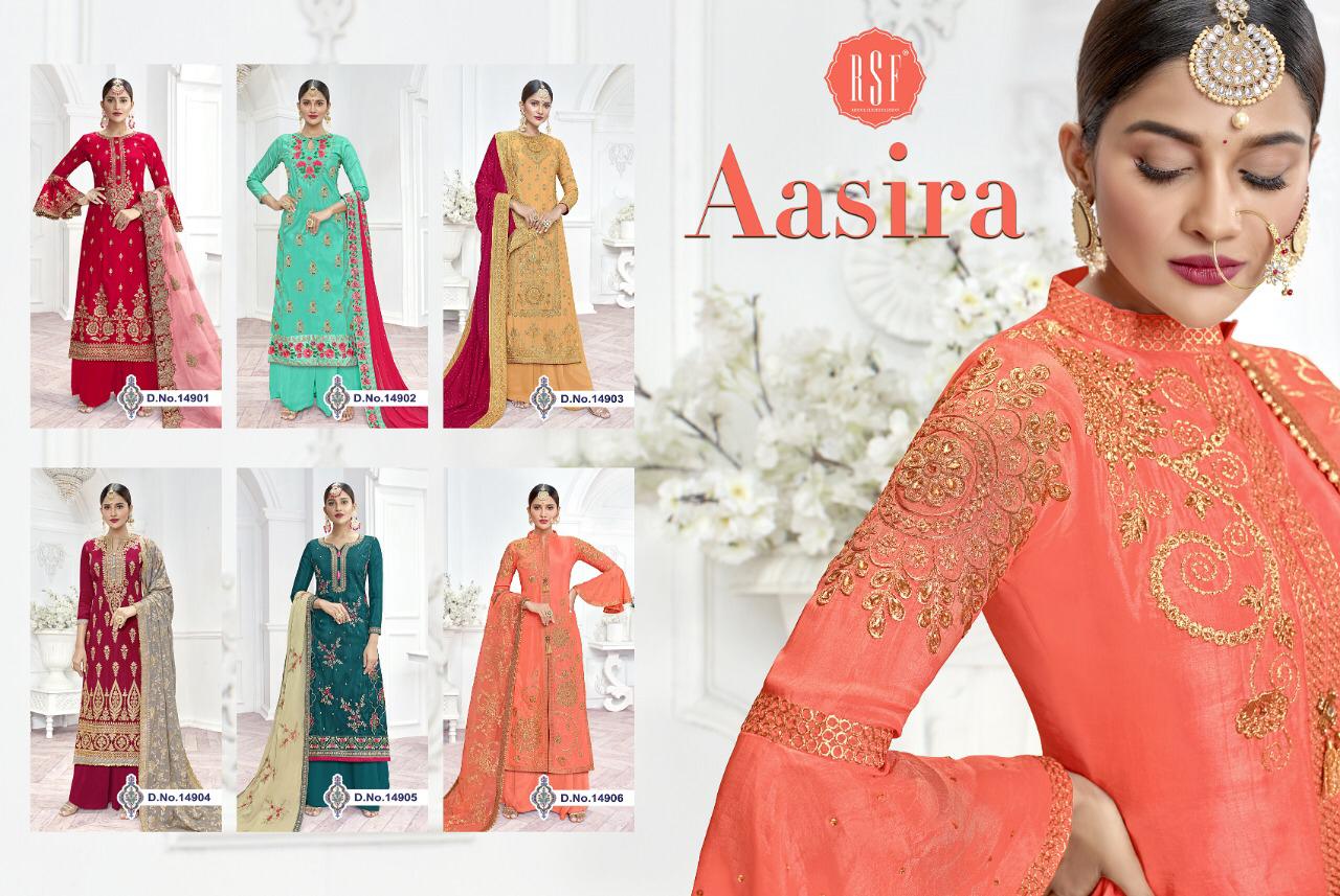 Buy Online Aasira By Rs Fashion Silk Embroidered Designer Wedding Collection Wholesale Supplier Surat 6 Pcs of Full Catalogue at Wholesale Price. Looking for Aasira By Rs Fashion Silk Embroidered Designer Wedding Collection Wholesale Supplier Surat Full Catalouge at Best Price? Buy Now Aasira By Rs Fashion Silk Embroidered Designer Wedding Collection Wholesale Supplier Surat at Wholesale Rate of Rs 8970 with Total 6 Pcs from authroized dealer and supplier of RSF Brand. Cost of Each piece is just only Rs 1495 which is very low and affordable price to resale the product in your retail store ,This is Surat based Wholesale Supplier & Dealer of RSF Brand. Click on Brand name to Know more about RSF Brand's products.Call or Whatsapp on 9898838984 for booking or enquiry