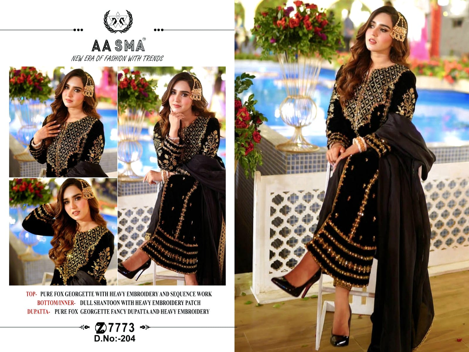 Buy Online Aasma D No 204 Georgette Pakistani Suits 5 Pcs of Full Catalogue at Wholesale Price. Looking for Aasma D No 204 Georgette Pakistani Suits Full Catalouge at Best Price? Buy Now Aasma D No 204 Georgette Pakistani Suits at Wholesale Rate of Rs 5495 with Total 5 Pcs from authroized dealer and supplier of Brand. Cost of Each piece is just only Rs 1099 which is very low and affordable price to resale the product in your retail store ,This is Surat based Wholesale Supplier & Dealer of Brand. Click on Brand name to Know more about Brand's products.Call or Whatsapp on 9898838984 for booking or enquiry