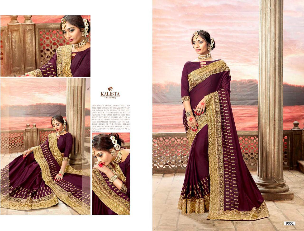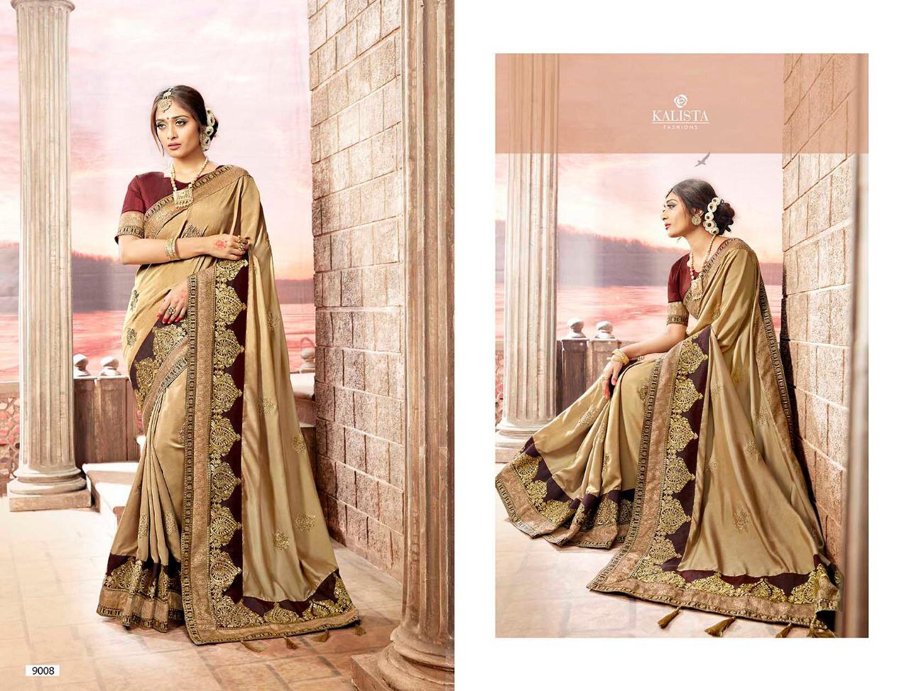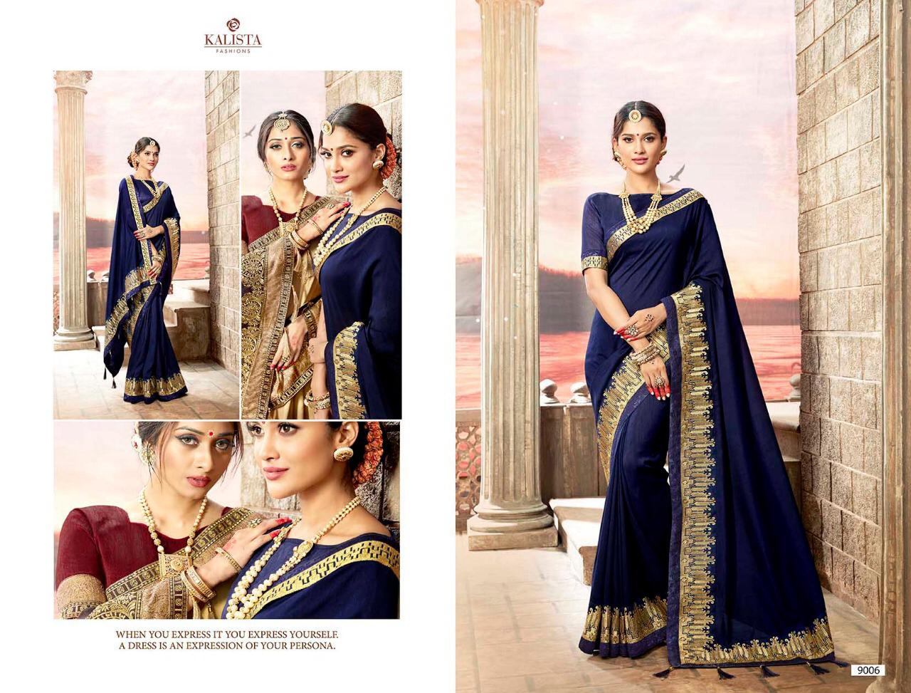 Buy Online Aasma Vol 2 By Kalista 9001 Series Fancy Designer Party Wear Saree Collection Wholesaler Surat 8 Pcs of Full Catalogue at Wholesale Price. Looking for Aasma Vol 2 By Kalista 9001 Series Fancy Designer Party Wear Saree Collection Wholesaler Surat Full Catalouge at Best Price? Buy Now Aasma Vol 2 By Kalista 9001 Series Fancy Designer Party Wear Saree Collection Wholesaler Surat at Wholesale Rate of Rs 10360 with Total 8 Pcs from authroized dealer and supplier of KALISTA FASHION Brand. Cost of Each piece is just only Rs 1295 which is very low and affordable price to resale the product in your retail store ,This is Surat based Wholesale Supplier & Dealer of KALISTA FASHION Brand. Click on Brand name to Know more about KALISTA FASHION Brand's products.Call or Whatsapp on 9898838984 for booking or enquiry
