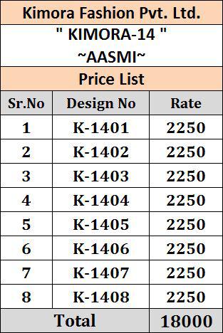 Buy Online Aasmi By Kimora Series K 1401 To K 1408 Designer Party Wear Suits Wholesale Supplier Gujarat 8 Pcs of Full Catalogue at Wholesale Price. Looking for Aasmi By Kimora Series K 1401 To K 1408 Designer Party Wear Suits Wholesale Supplier Gujarat Full Catalouge at Best Price? Buy Now Aasmi By Kimora Series K 1401 To K 1408 Designer Party Wear Suits Wholesale Supplier Gujarat at Wholesale Rate of Rs 18000 with Total 8 Pcs from authroized dealer and supplier of KIMORA Brand. Cost of Each piece is just only Rs 2250 which is very low and affordable price to resale the product in your retail store ,This is Surat based Wholesale Supplier & Dealer of KIMORA Brand. Click on Brand name to Know more about KIMORA Brand's products.Call or Whatsapp on 9898838984 for booking or enquiry