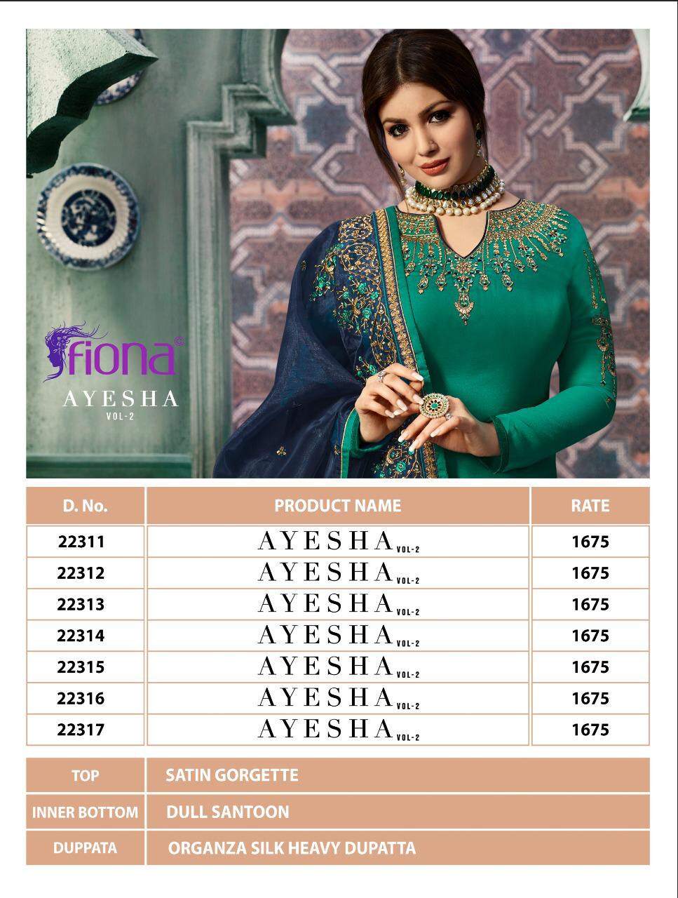 Buy Online Aayesha Vol 2 By Fiona 22311 Series Fancy Satin Georgette Party Wear Salwar Kameez Catlog Wholesale Dealer Surat 7 Pcs of Full Catalogue at Wholesale Price. Looking for Aayesha Vol 2 By Fiona 22311 Series Fancy Satin Georgette Party Wear Salwar Kameez Catlog Wholesale Dealer Surat Full Catalouge at Best Price? Buy Now Aayesha Vol 2 By Fiona 22311 Series Fancy Satin Georgette Party Wear Salwar Kameez Catlog Wholesale Dealer Surat at Wholesale Rate of Rs 11725 with Total 7 Pcs from authroized dealer and supplier of FIONA Brand. Cost of Each piece is just only Rs 1675 which is very low and affordable price to resale the product in your retail store ,This is Surat based Wholesale Supplier & Dealer of FIONA Brand. Click on Brand name to Know more about FIONA Brand's products.Call or Whatsapp on 9898838984 for booking or enquiry