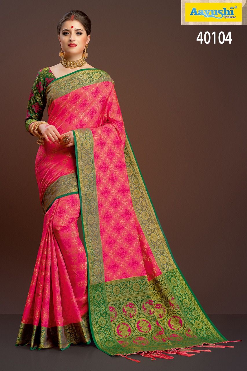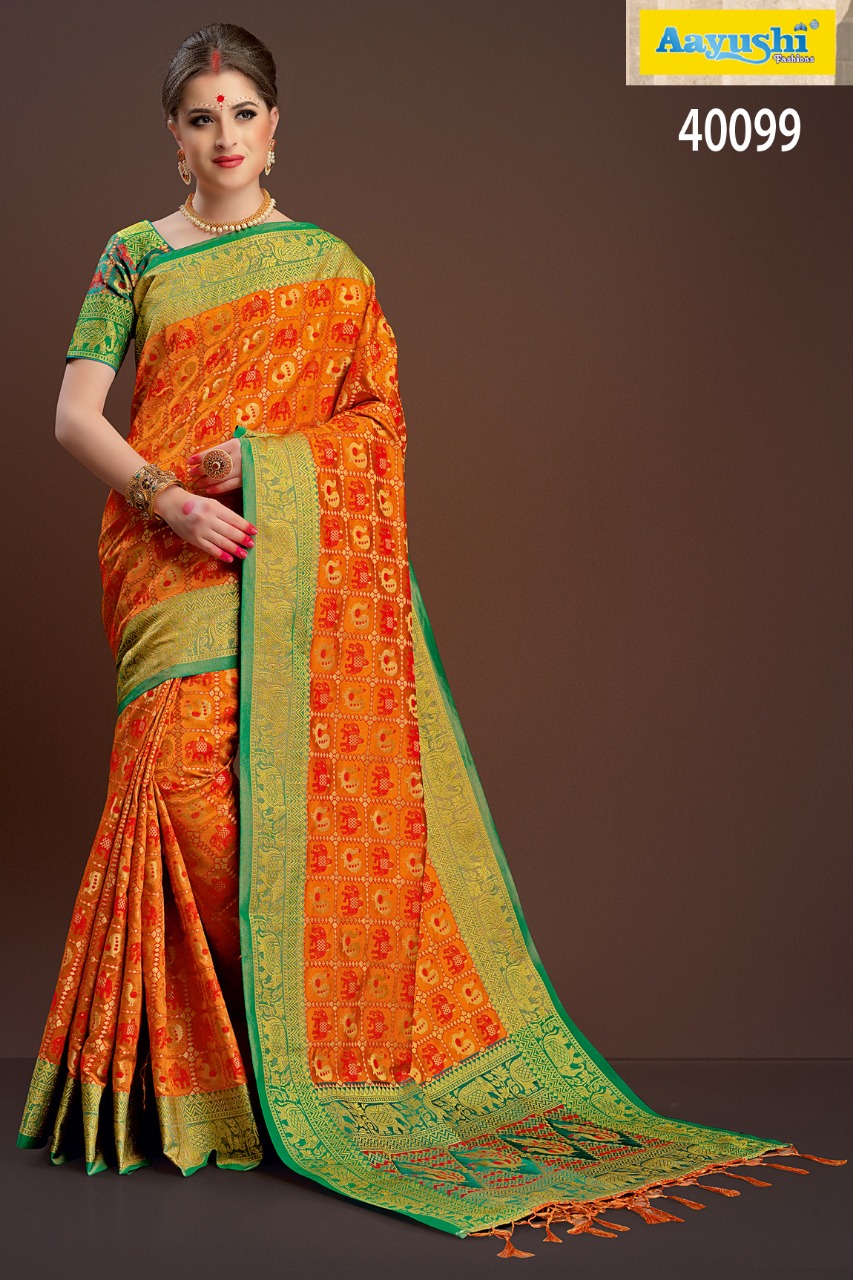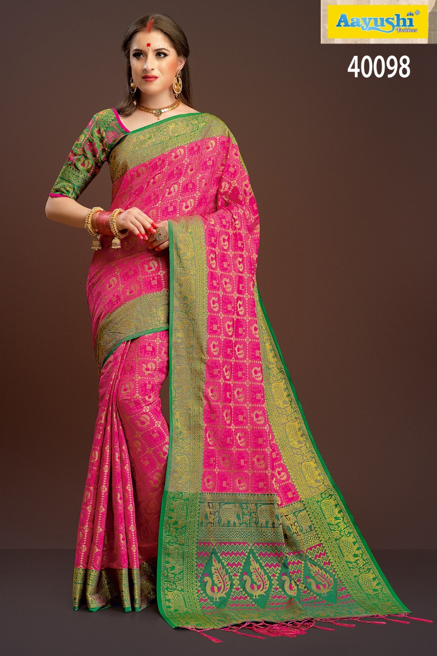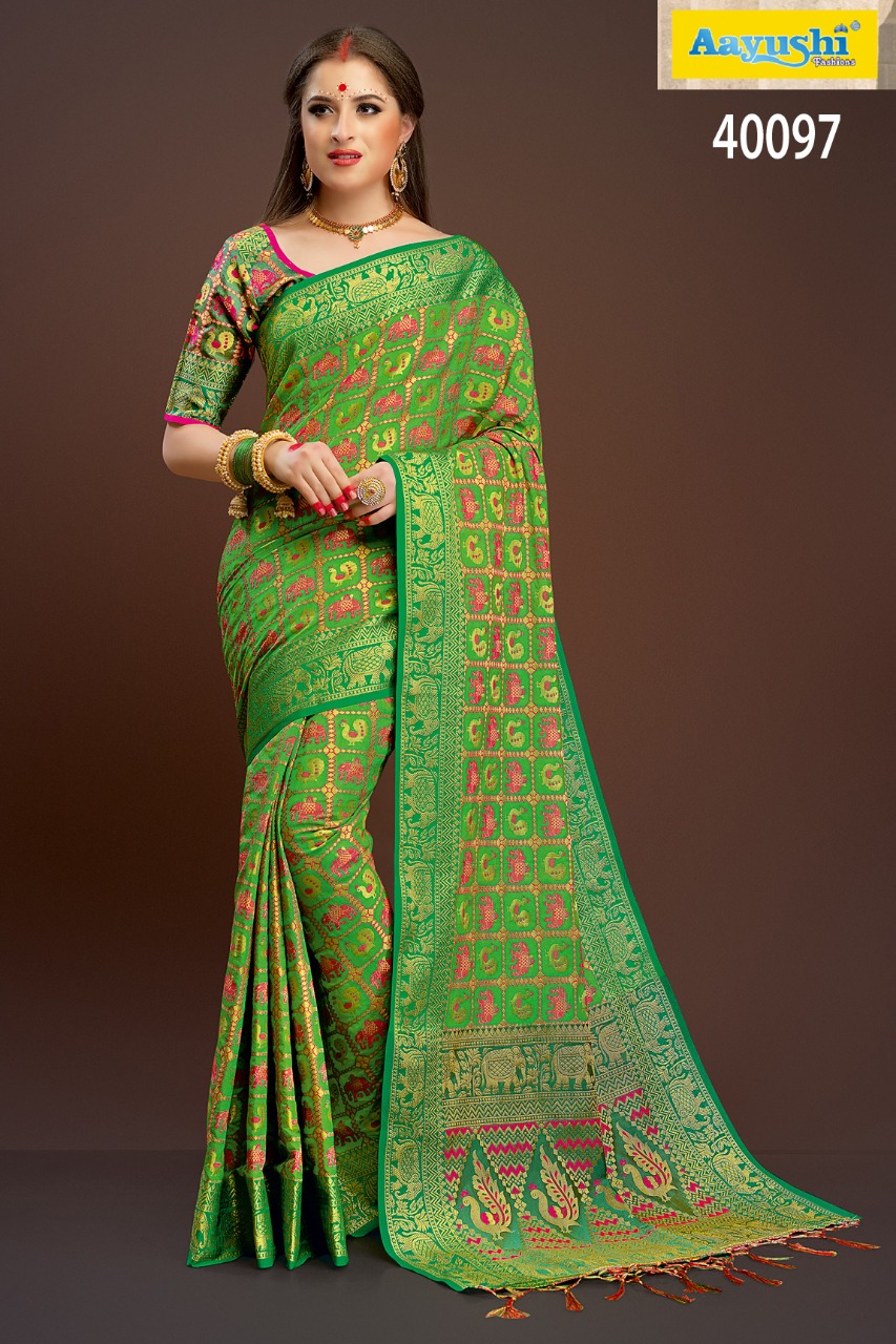 Buy Online Aayushi Haute Couture Vol 8 40097 Series Weaving Silk Sarees 12 Pcs of Full Catalogue at Wholesale Price. Looking for Aayushi Haute Couture Vol 8 40097 Series Weaving Silk Sarees Full Catalouge at Best Price? Buy Now Aayushi Haute Couture Vol 8 40097 Series Weaving Silk Sarees at Wholesale Rate of Rs 16800 with Total 12 Pcs from authroized dealer and supplier of Aayushi fashions Brand. Cost of Each piece is just only Rs 1400 which is very low and affordable price to resale the product in your retail store ,This is Surat based Wholesale Supplier & Dealer of Aayushi fashions Brand. Click on Brand name to Know more about Aayushi fashions Brand's products.Call or Whatsapp on 9898838984 for booking or enquiry
