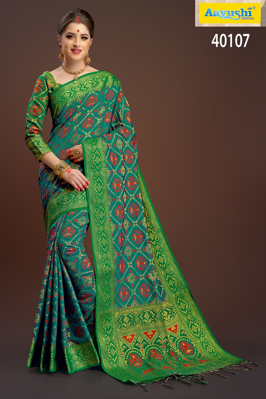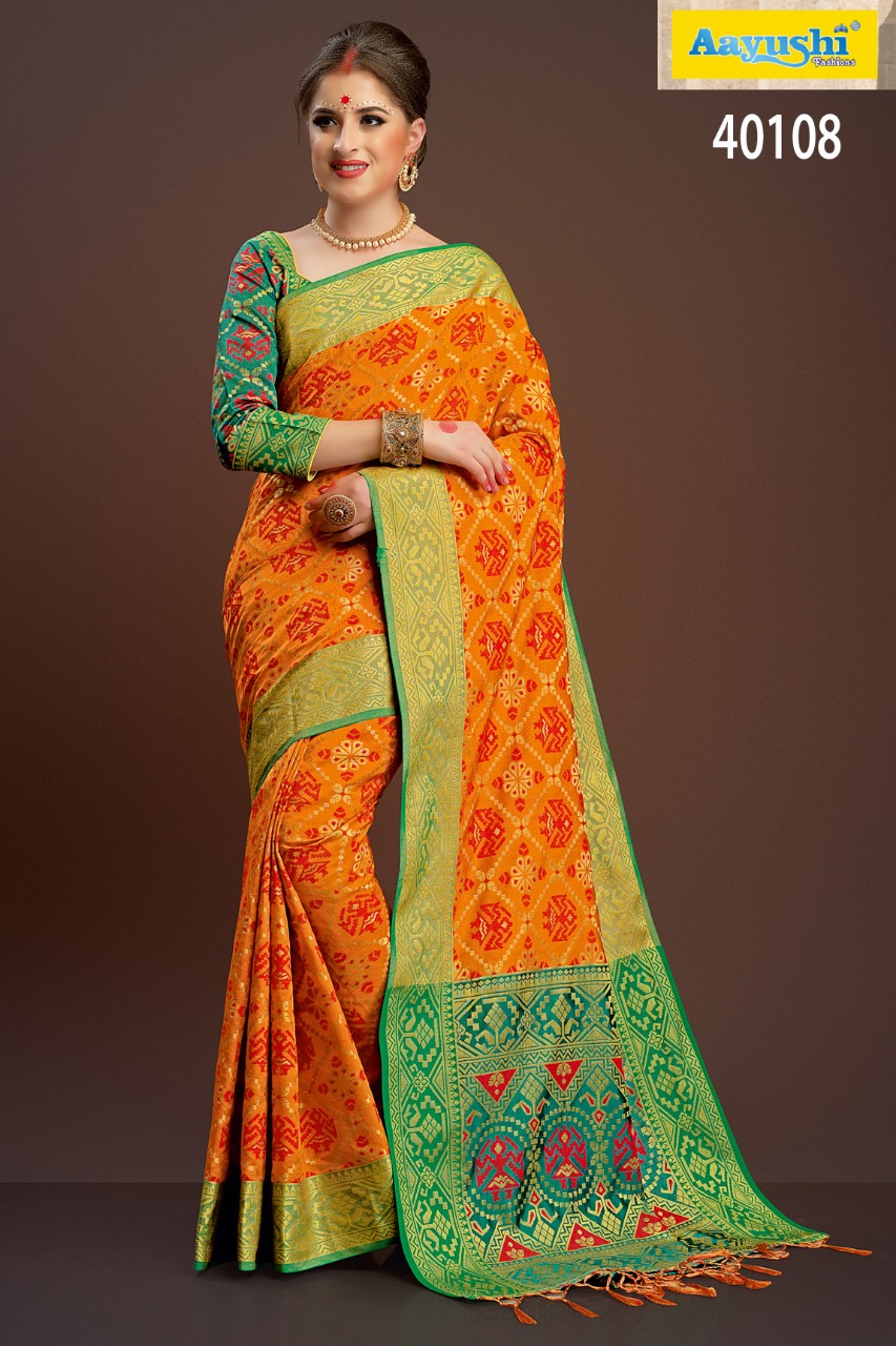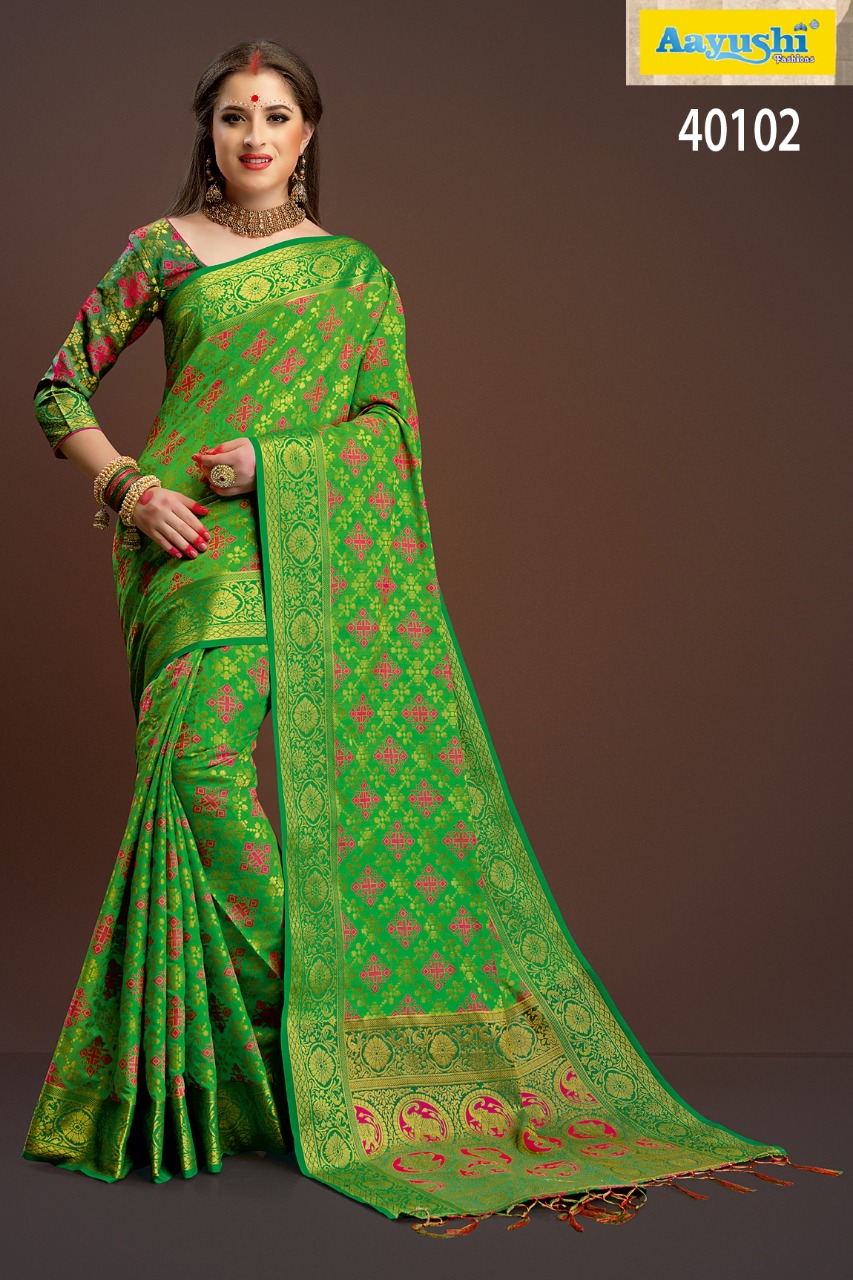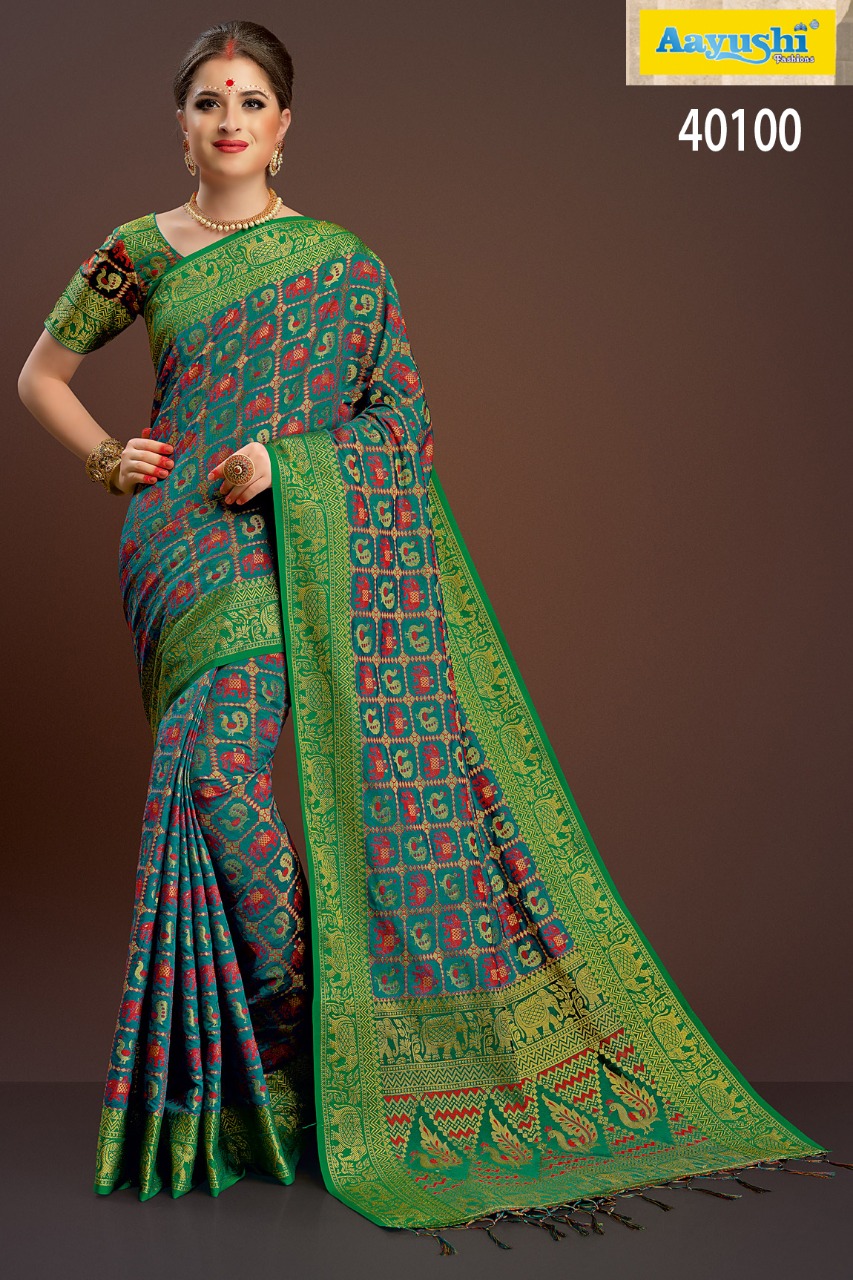 Buy Online Aayushi Haute Couture Vol 8 40097 Series Weaving Silk Sarees 12 Pcs of Full Catalogue at Wholesale Price. Looking for Aayushi Haute Couture Vol 8 40097 Series Weaving Silk Sarees Full Catalouge at Best Price? Buy Now Aayushi Haute Couture Vol 8 40097 Series Weaving Silk Sarees at Wholesale Rate of Rs 16800 with Total 12 Pcs from authroized dealer and supplier of Aayushi fashions Brand. Cost of Each piece is just only Rs 1400 which is very low and affordable price to resale the product in your retail store ,This is Surat based Wholesale Supplier & Dealer of Aayushi fashions Brand. Click on Brand name to Know more about Aayushi fashions Brand's products.Call or Whatsapp on 9898838984 for booking or enquiry