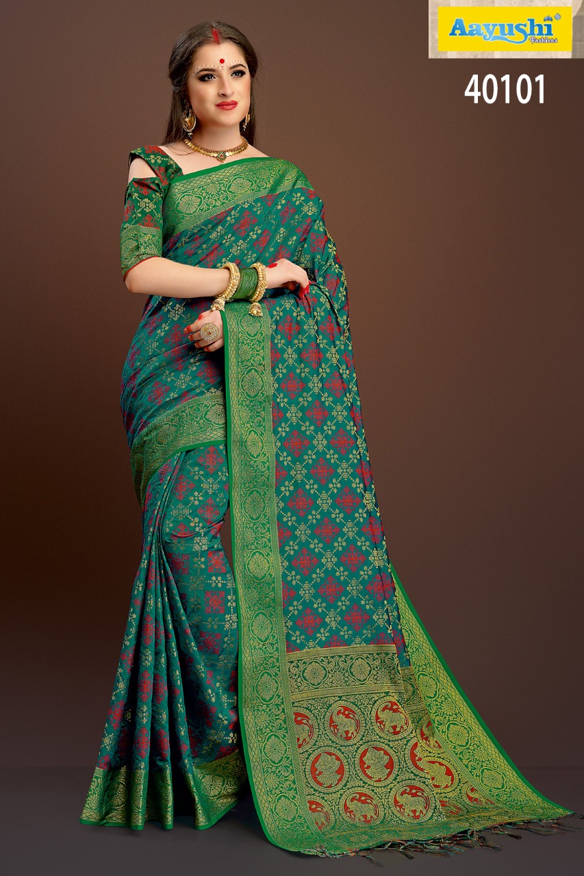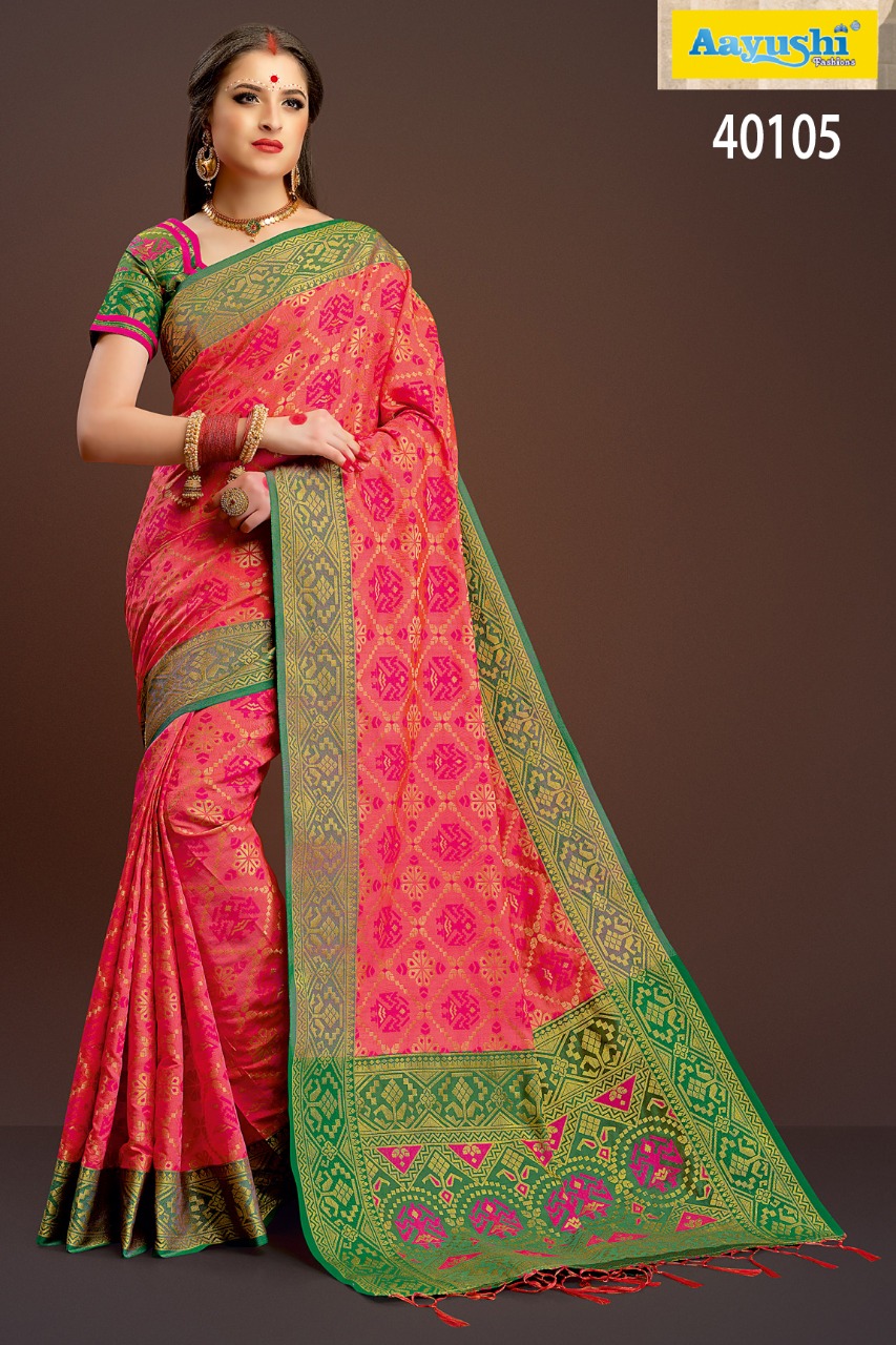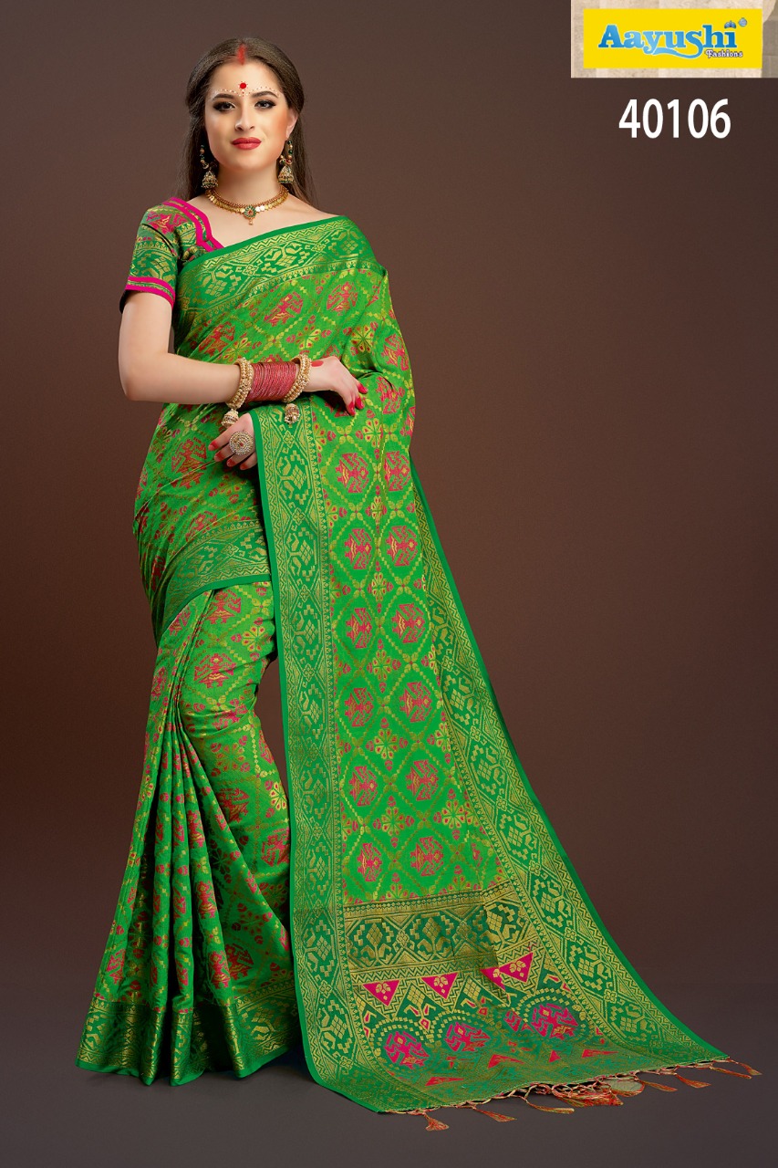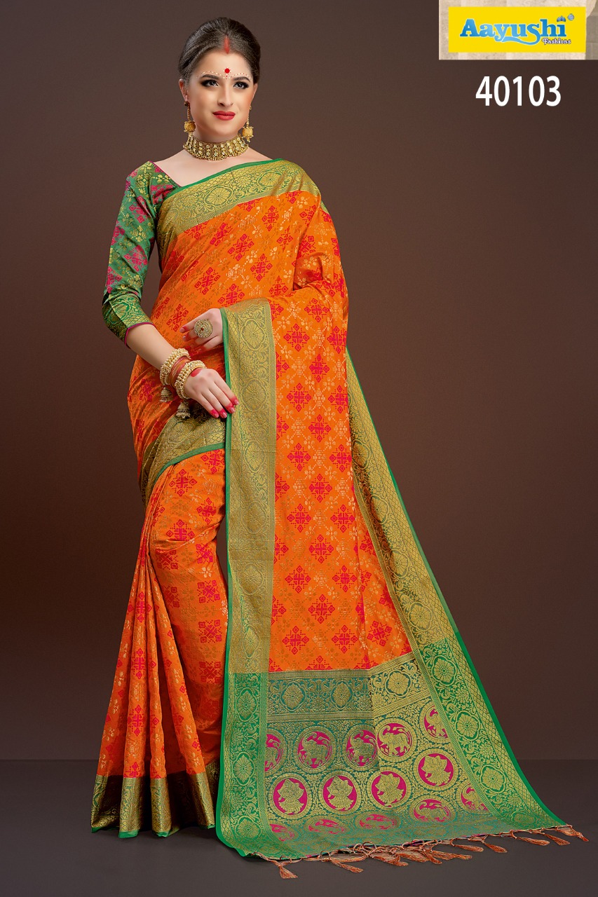 Buy Online Aayushi Haute Couture Vol 8 40097 Series Weaving Silk Sarees 12 Pcs of Full Catalogue at Wholesale Price. Looking for Aayushi Haute Couture Vol 8 40097 Series Weaving Silk Sarees Full Catalouge at Best Price? Buy Now Aayushi Haute Couture Vol 8 40097 Series Weaving Silk Sarees at Wholesale Rate of Rs 16800 with Total 12 Pcs from authroized dealer and supplier of Aayushi fashions Brand. Cost of Each piece is just only Rs 1400 which is very low and affordable price to resale the product in your retail store ,This is Surat based Wholesale Supplier & Dealer of Aayushi fashions Brand. Click on Brand name to Know more about Aayushi fashions Brand's products.Call or Whatsapp on 9898838984 for booking or enquiry