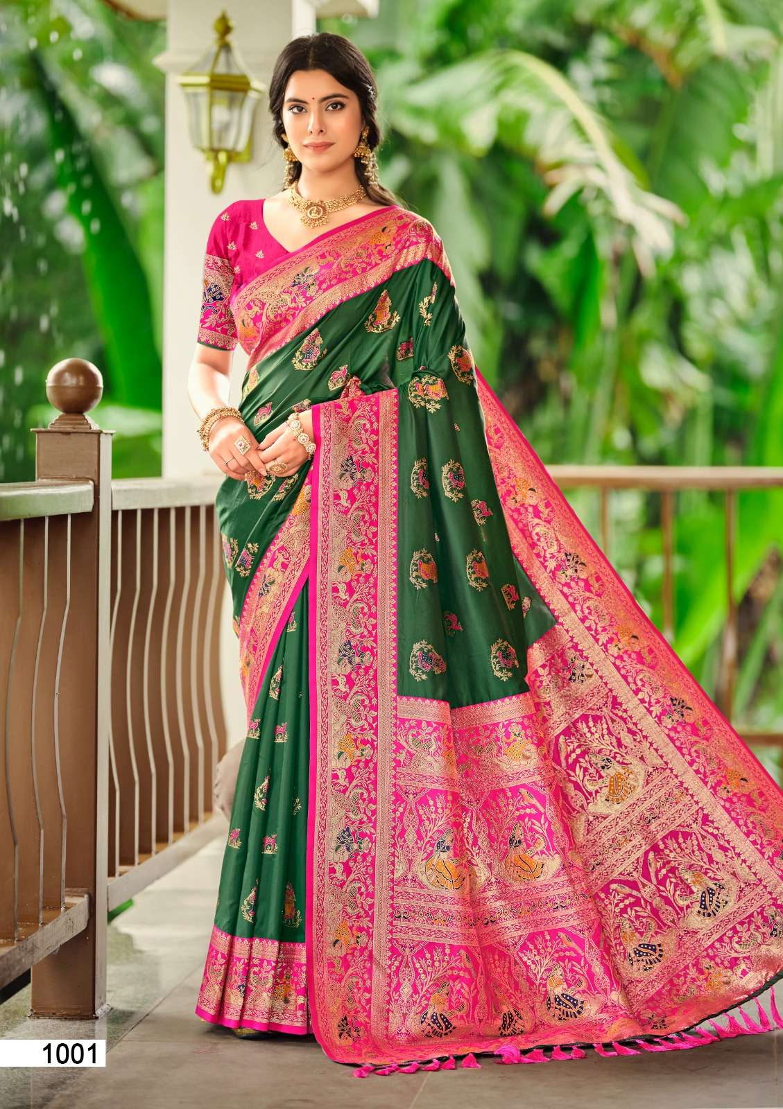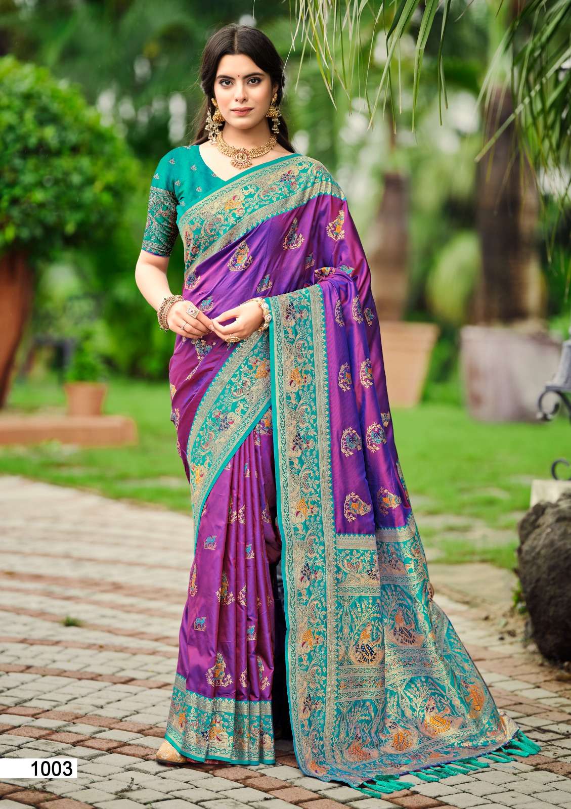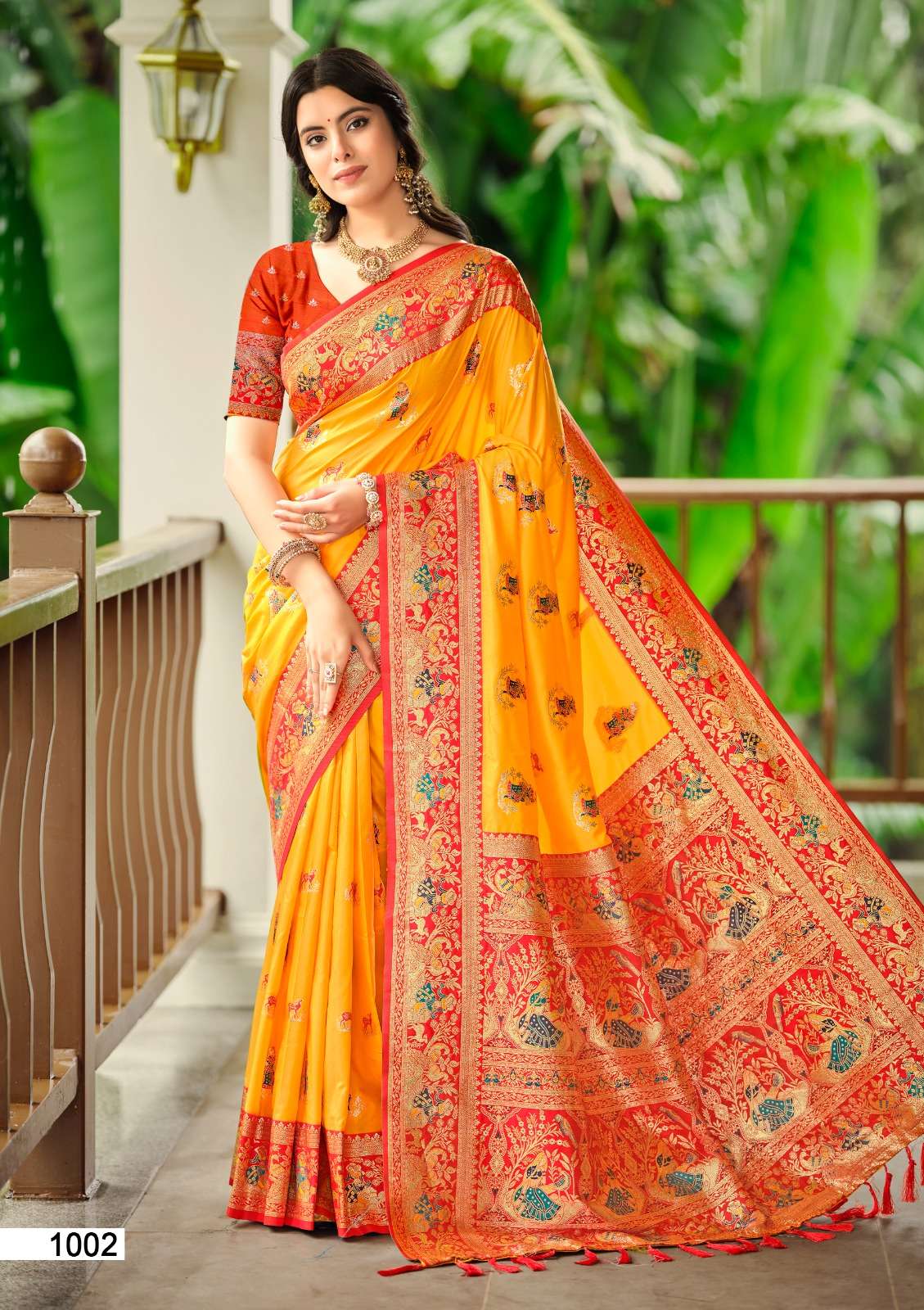 Brand - Bunawat Catalogue Name : ABHIYUKTA VOL-3 Saree Fabric : SILK Blouse Fabric : SILK Price : 1475 GST 5% Extra. Single available. Ready to ship. |