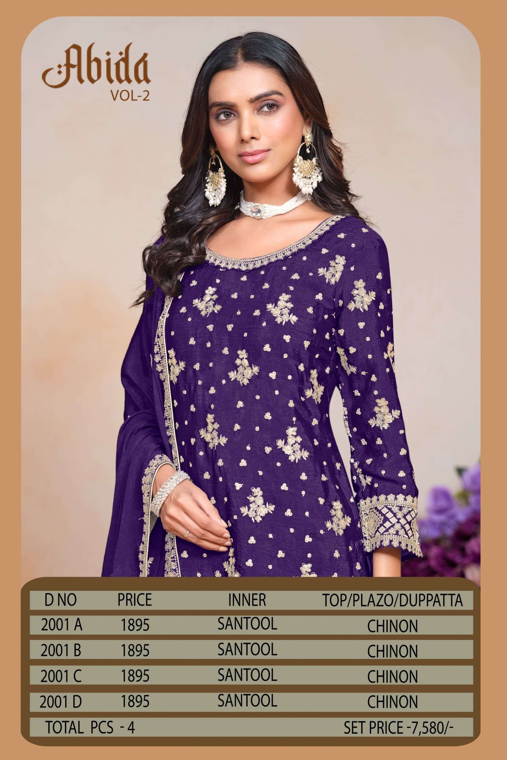 Buy Online ABIDA VOL 2 SERIES 2001 COLOUR PARTY WEAR READYMADE COLLECTION 4 Pcs of Full Catalogue at Wholesale Price. Looking for ABIDA VOL 2 SERIES 2001 COLOUR PARTY WEAR READYMADE COLLECTION Full Catalouge at Best Price? Buy Now ABIDA VOL 2 SERIES 2001 COLOUR PARTY WEAR READYMADE COLLECTION at Wholesale Rate of Rs 7580 with Total 4 Pcs from authroized dealer and supplier of BRAND'S Brand. Cost of Each piece is just only Rs 1895 which is very low and affordable price to resale the product in your retail store ,This is Surat based Wholesale Supplier & Dealer of BRAND'S Brand. Click on Brand name to Know more about BRAND'S Brand's products.Call or Whatsapp on 9898838984 for booking or enquiry