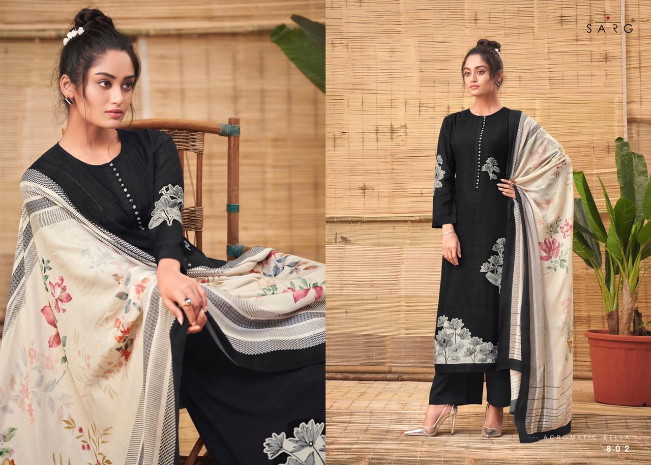 *SARG* Presents - *ACROMATIC BELLA* *TOP-* MUSLIN SILK DIGITAL PRINT WITH HAND WORK *BOTTOM* COTTON SATIN *DUPATTA* MUSLIN SILK DIGITAL PRINT *RATE* 1695? per pcs . Set to set . GST 5 Percent Extra *TOTAL DESIGNS* 05 |