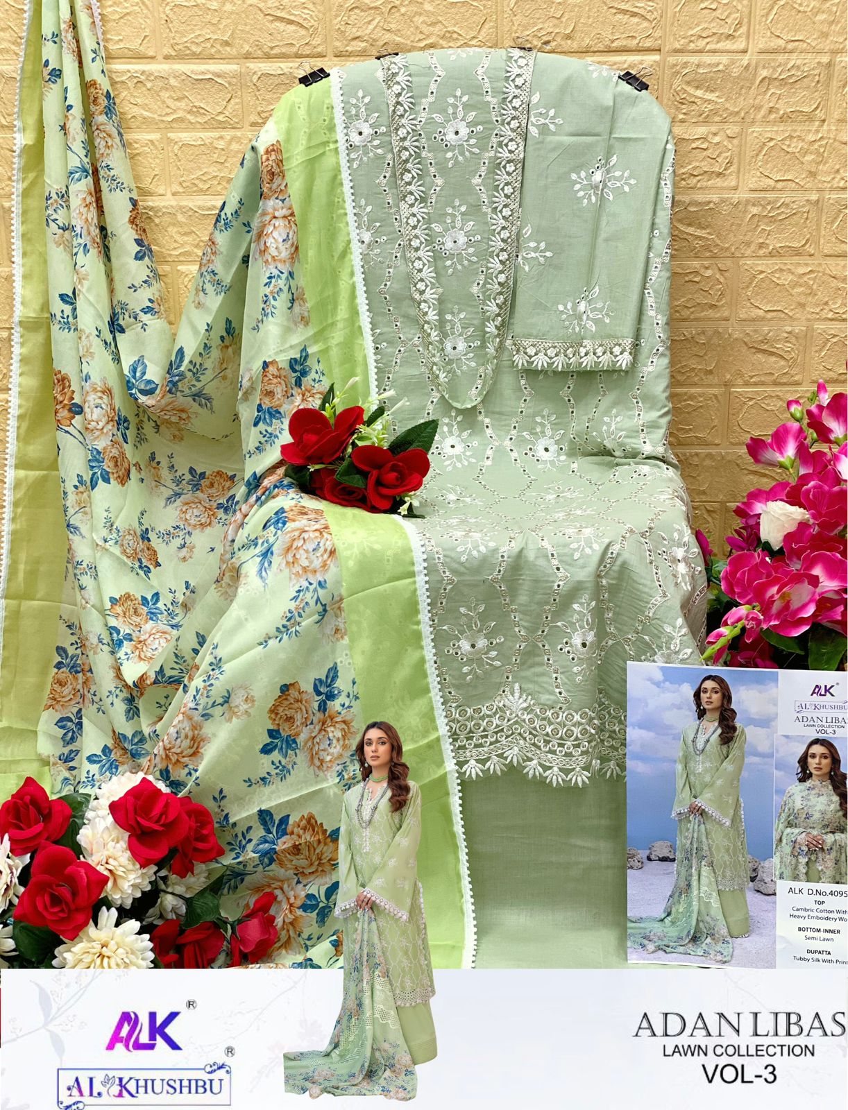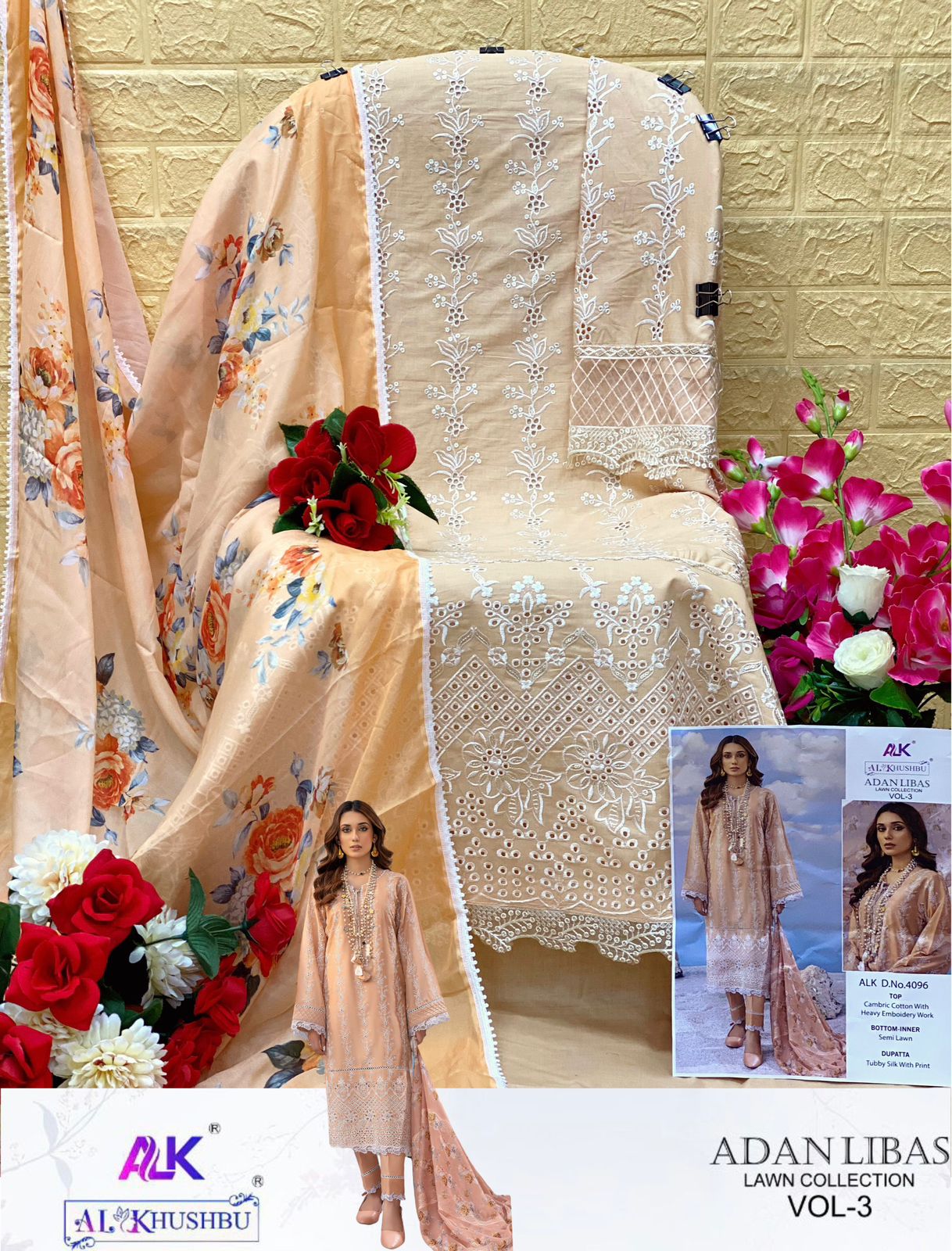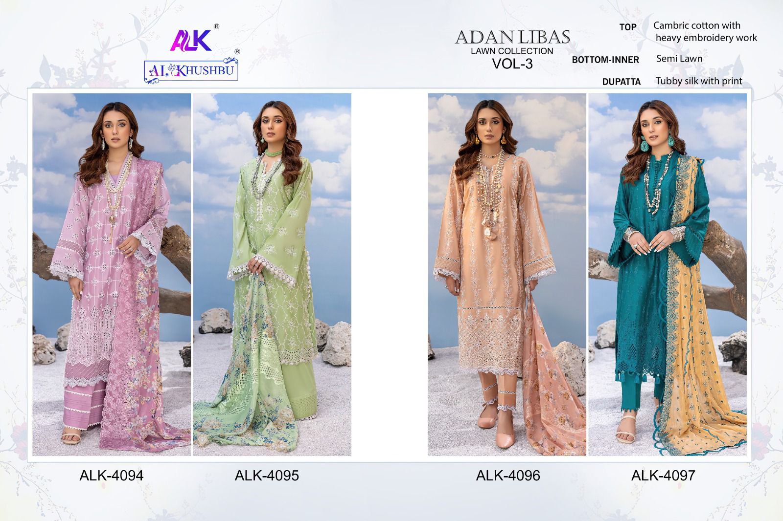 Buy Online Adan Libas Vol 3 Al Khushbu Cotton Suits 4 Pcs of Full Catalogue at Wholesale Price. Looking for Adan Libas Vol 3 Al Khushbu Cotton Suits Full Catalouge at Best Price? Buy Now Adan Libas Vol 3 Al Khushbu Cotton Suits at Wholesale Rate of Rs 5100 with Total 4 Pcs from authroized dealer and supplier of Brand. Cost of Each piece is just only Rs 1275 which is very low and affordable price to resale the product in your retail store ,This is Surat based Wholesale Supplier & Dealer of Brand. Click on Brand name to Know more about Brand's products.Call or Whatsapp on 9898838984 for booking or enquiry