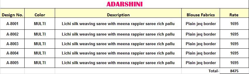 Buy Online Adarshini By Np Series A 8001 To A 8005 Silk Designer Party Wear Sarees Wholesale Supplier India 5 Pcs of Full Catalogue at Wholesale Price. Looking for Adarshini By Np Series A 8001 To A 8005 Silk Designer Party Wear Sarees Wholesale Supplier India Full Catalouge at Best Price? Buy Now Adarshini By Np Series A 8001 To A 8005 Silk Designer Party Wear Sarees Wholesale Supplier India at Wholesale Rate of Rs 8475 with Total 5 Pcs from authroized dealer and supplier of BRAND'S Brand. Cost of Each piece is just only Rs 1695 which is very low and affordable price to resale the product in your retail store ,This is Surat based Wholesale Supplier & Dealer of BRAND'S Brand. Click on Brand name to Know more about BRAND'S Brand's products.Call or Whatsapp on 9898838984 for booking or enquiry