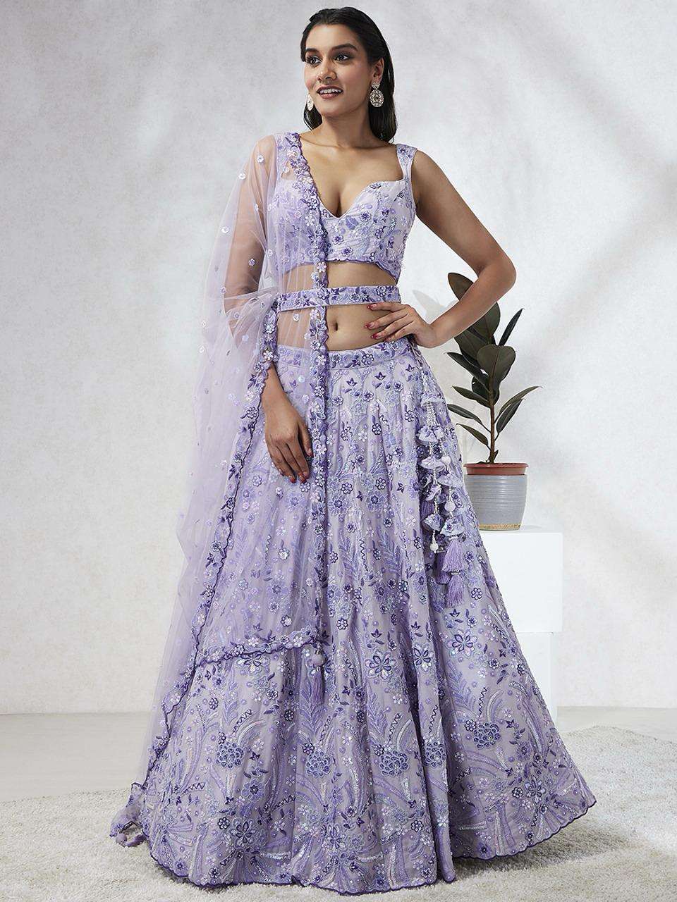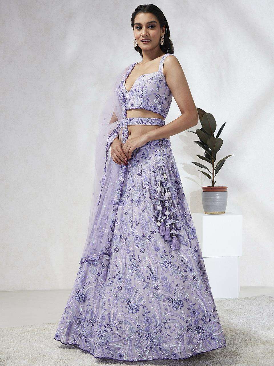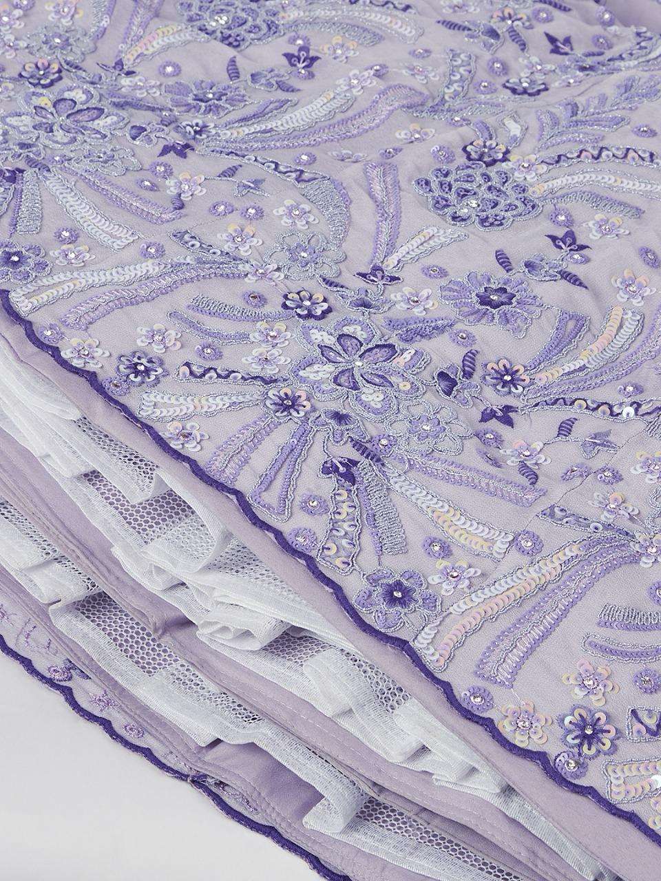 *📝 Product Details:* - *Lehenga:* Made of premium quality Lavender Colour Pure Georgette fabric Full Flaire Semi-Stitched Lehenga with heavy Sequins and thread Work Embroidery 🧵 - *Lehenga Stitching:* Double Shantoon inner with 2 layers of Can Can and Buckram for added support 🧵 - *Dupatta:* Lavender Net Dupatta with sequinse work Ethnic motif, Embroidery lace Border, and latkan on the corner 🧥 - *Blouse:* Lavender Pure Georgette all-over material with Heavy Embroidery and multi-color sequinse work 👕 - *Lehenga Flair:* 4 meters with Inner attached 📏 - *Waist Belt:* Cutdana, Sequinse Embroidered belt with Stunning tassels 👖 - *Lehenga Latkan:* Unique long lehenga hand-made tassel with ethnic work hanging beads latkan 💎