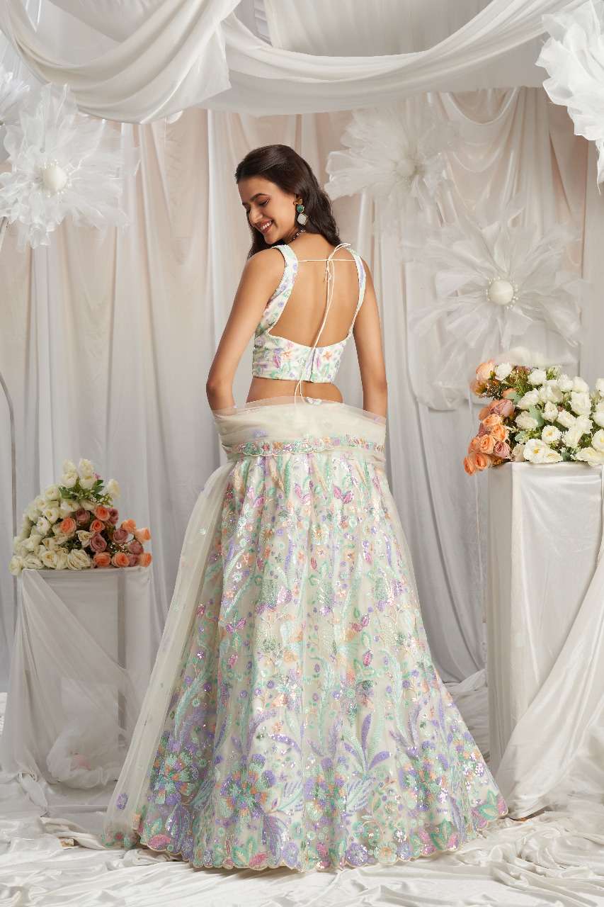 *Lehenga Details 👗* - *Fabric:* Premium quality Cream Colour Net fabric - *Work:* Multi-color Sequins and Coding thread Embroidery - *Flair:* 3.5 meters with Inner attached - *Waist:* Customizable up to 38 inches