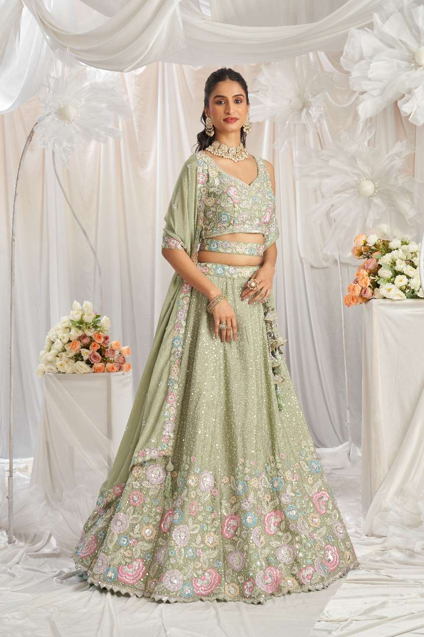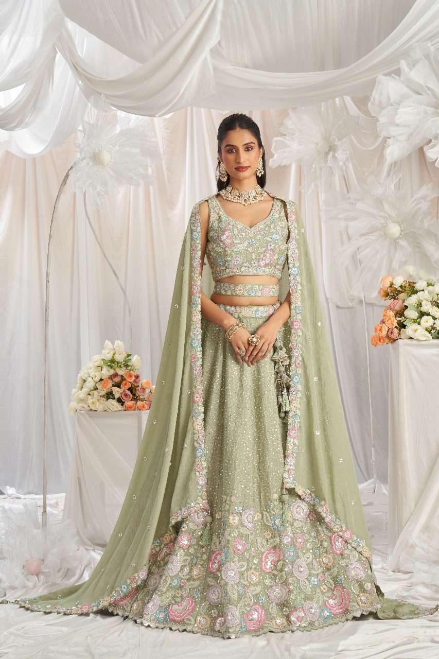 *Lehenga Details* - *Fabric:* Premium quality Lime Green Colour Pure Chiffon fabric - *Work:* Multi-color Sequins, Coding thread Embroidery - *Flair:* 3.5 meters with Inner attached - *Waist:* Customizable up to 42 inches