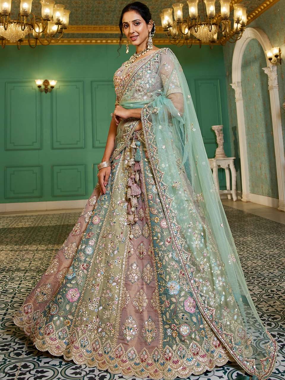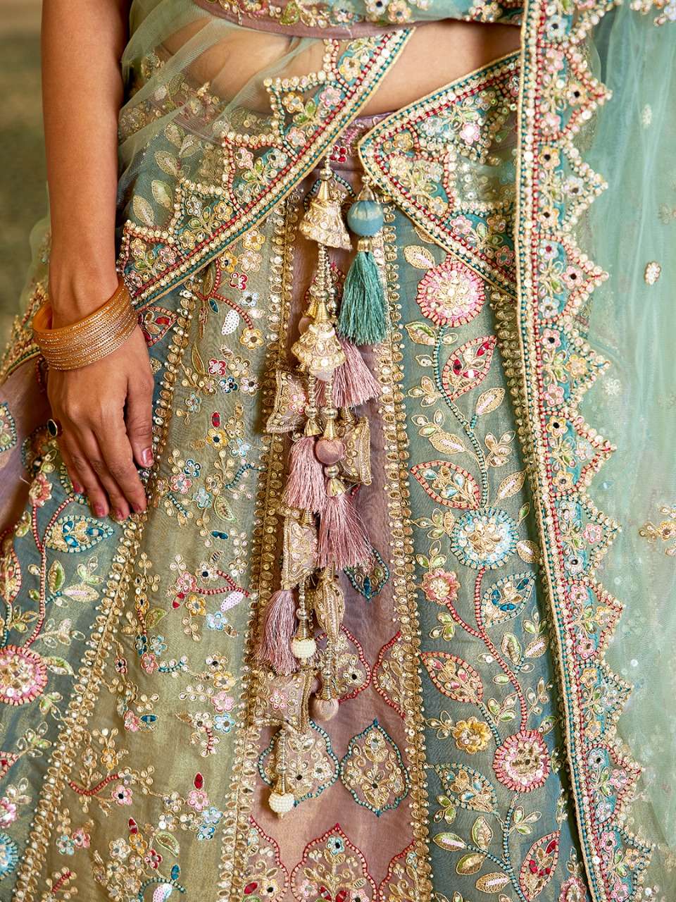 *Lehenga Details* - *Fabric:* Premium quality Multi Colour Bridel Net fabric - *Work:* Gotapatti and Sequins, Moti with Coding thread Embroidery - *Flair:* 3.8 meters with Inner attached - *Waist:* Customizable up to 38 inches - *Stitching Note:* Double Shantoon inner with 2 layers of Can Can 18 and 12 inch with Buckram 9 and 4 inch
