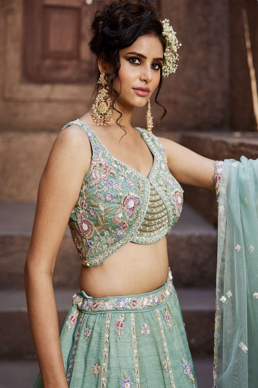 - *Lehenga:* Premium quality tissue fabric, full flair, semi-stitched lehenga with moti, sequins, and coding work, thread embroidery, and thread work border on the hemline. - *Lehenga Stitching:* Double shantoon inner with 2 layers of can-can (16 and 10 inches) and buckram (12 inches). - *Dupatta:* Tissue fabric jacard and banarasi work dupatta with heavy coding, moti embroidery, cut work border. - *Blouse:* Tissue fabric sweetheart pattern material with heavy sequins, coding, and thread embroidery work, shantoon inner attached.