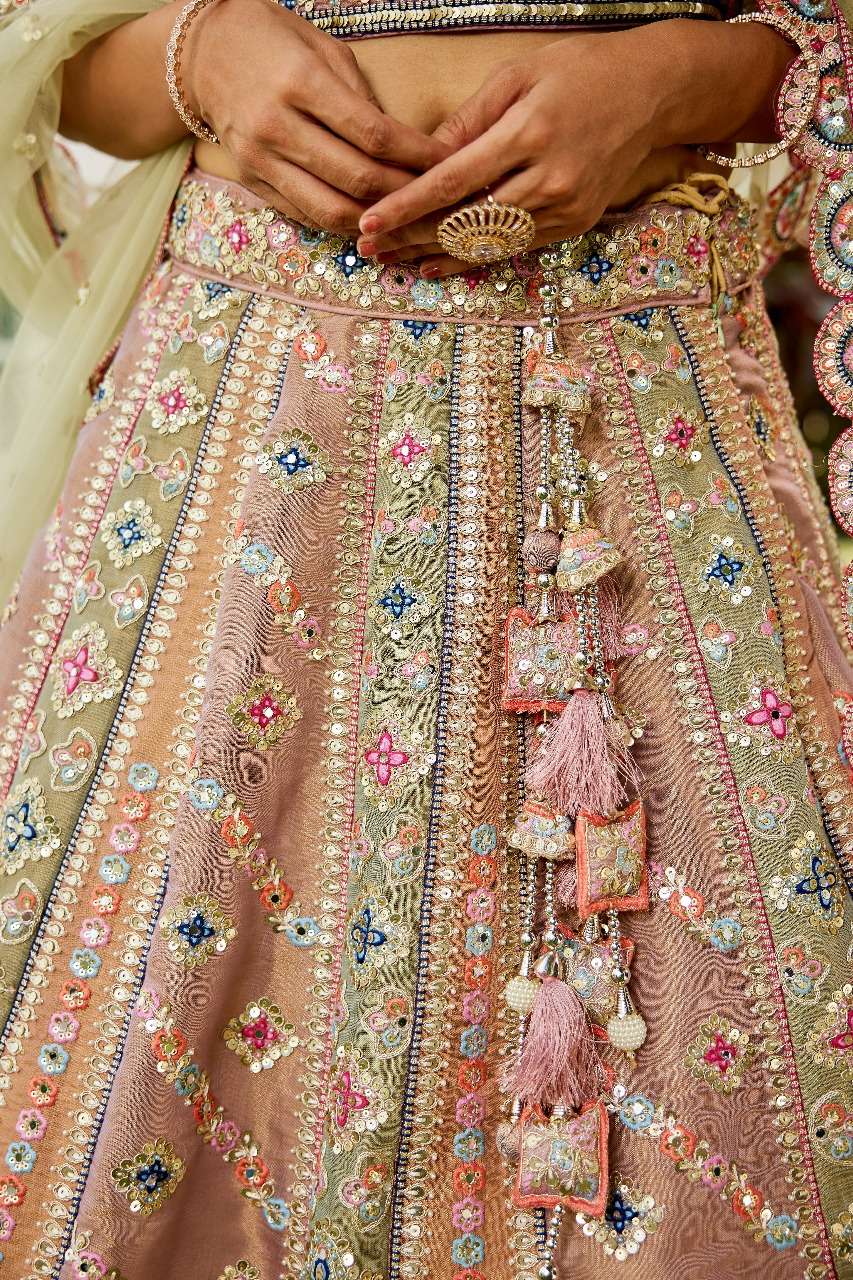 "• Lehenga:- Made of premium quality Multi Colour Bridel Net fabric Full Flaire Semi-Stitched Lehenga With Gotapatti and Sequins, Moti with Coding thread Embroidery work. Has a Sequins work border on the hemline. • Lehenga Stitching Note:- Double Shantoon inner with 2 layers of Can Can 18 and 12 inch with Buckram 9 and 4 inch is given together in lehenga. • Dupatta:- Lime Green Net Dupatta has a sequinse Ethnic motif with Embroidery work Border. • Blouse:- Lavender Bridel Net fabric Sweetheart Neck material With Heavy sequinse and thread Embroidery work. Has a shantoon inner attached. • Lehenga Flair : 3.8 meter with Inner attached. • Waist Belt: Perfect Accessory for Lehenga, Sequinse Embroidered belt with Stunning tassels are affixed on the drawstrings. • Lehenga Latkan: Unique long lehenga hand made round shaped tassel, with ethnic work hanging beads latkan. "