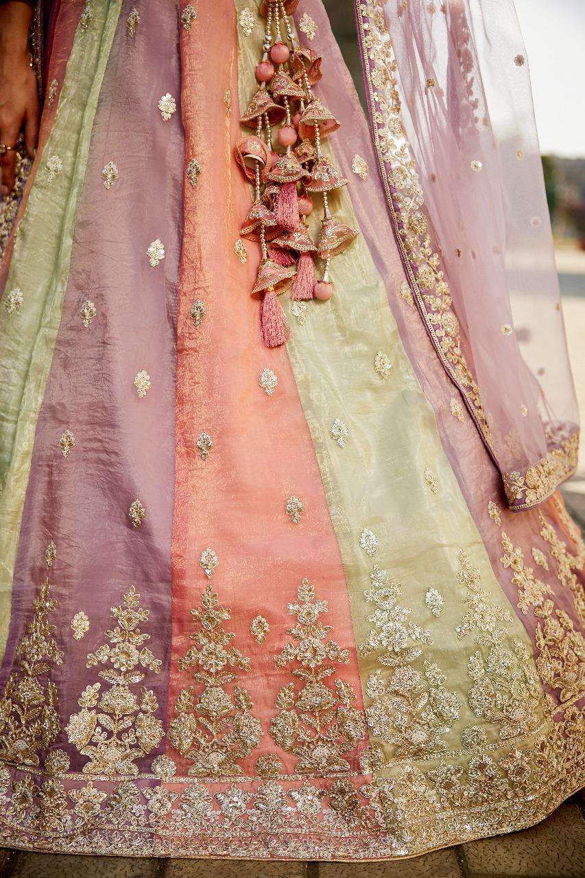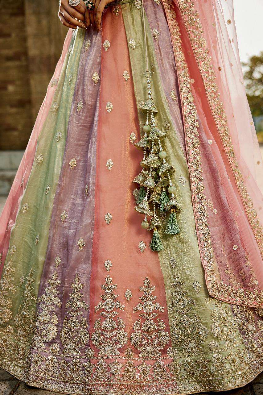 - *Lehenga:* Premium quality multi-color tissue fabric, full flair, semi-stitched lehenga with moti, sequins, and coding work, thread embroidery, and thread work border on the hemline. - *Lehenga Stitching:* Double shantoon inner with 2 layers of can-can (16 and 10 inches) and buckram (12 inches). - *Dupatta:* Lavender net ethnic dupatta with heavy coding, zarkans embroidery, cut work border. - *Blouse:* Pink tissue fabric sweetheart pattern material with heavy sequins, coding, and thread embroidery work, shantoon inner attached.