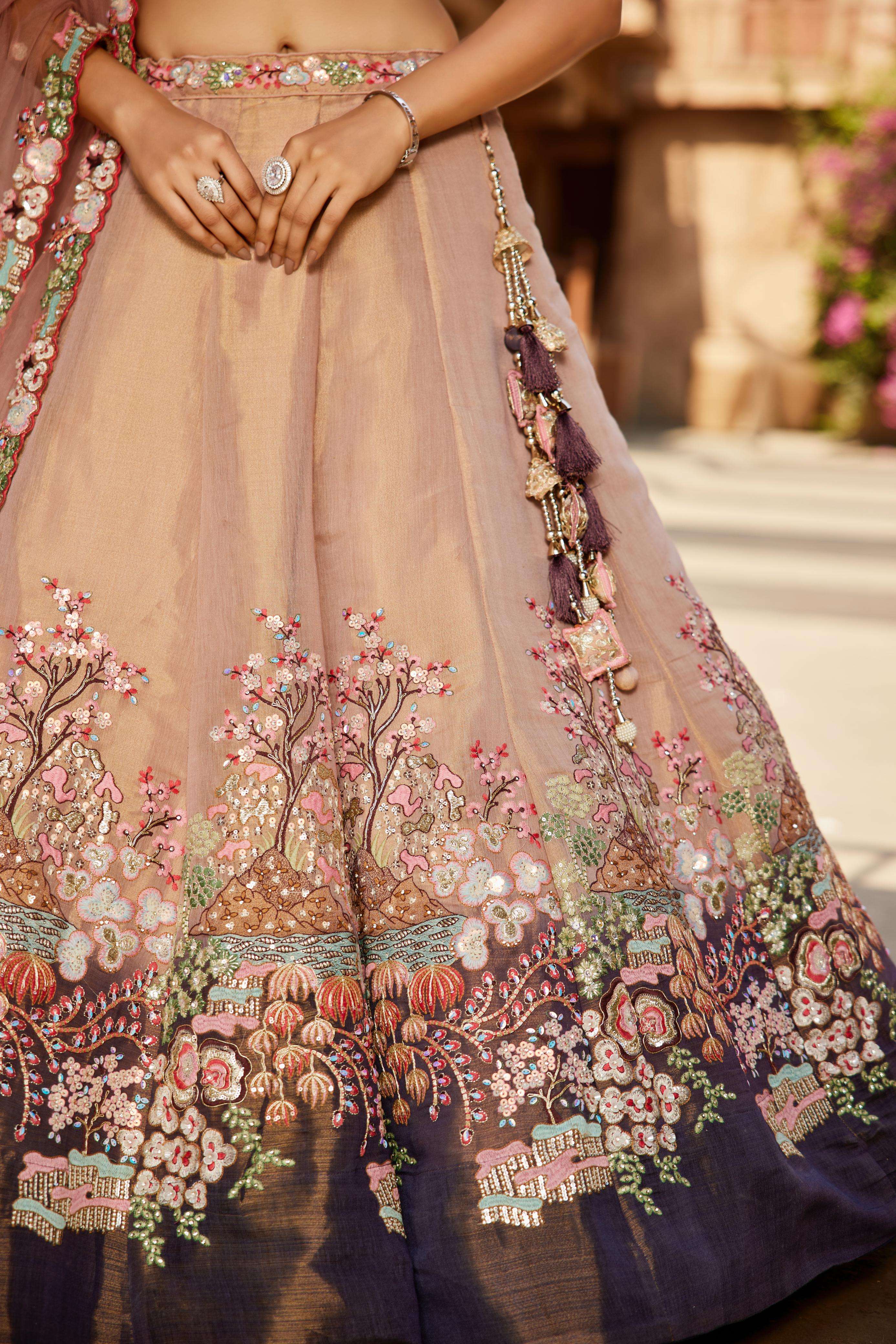 *Lehenga Details 👗* - *Fabric:* Premium quality 2-tone Purple and Cream Bridel net fabric - *Work:* Zarkans, Sequinse, and Coding work with thread Embroidery - *Flair:* 4.3 meters with Inner attached - *Waist:* Customizable up to 40 inches