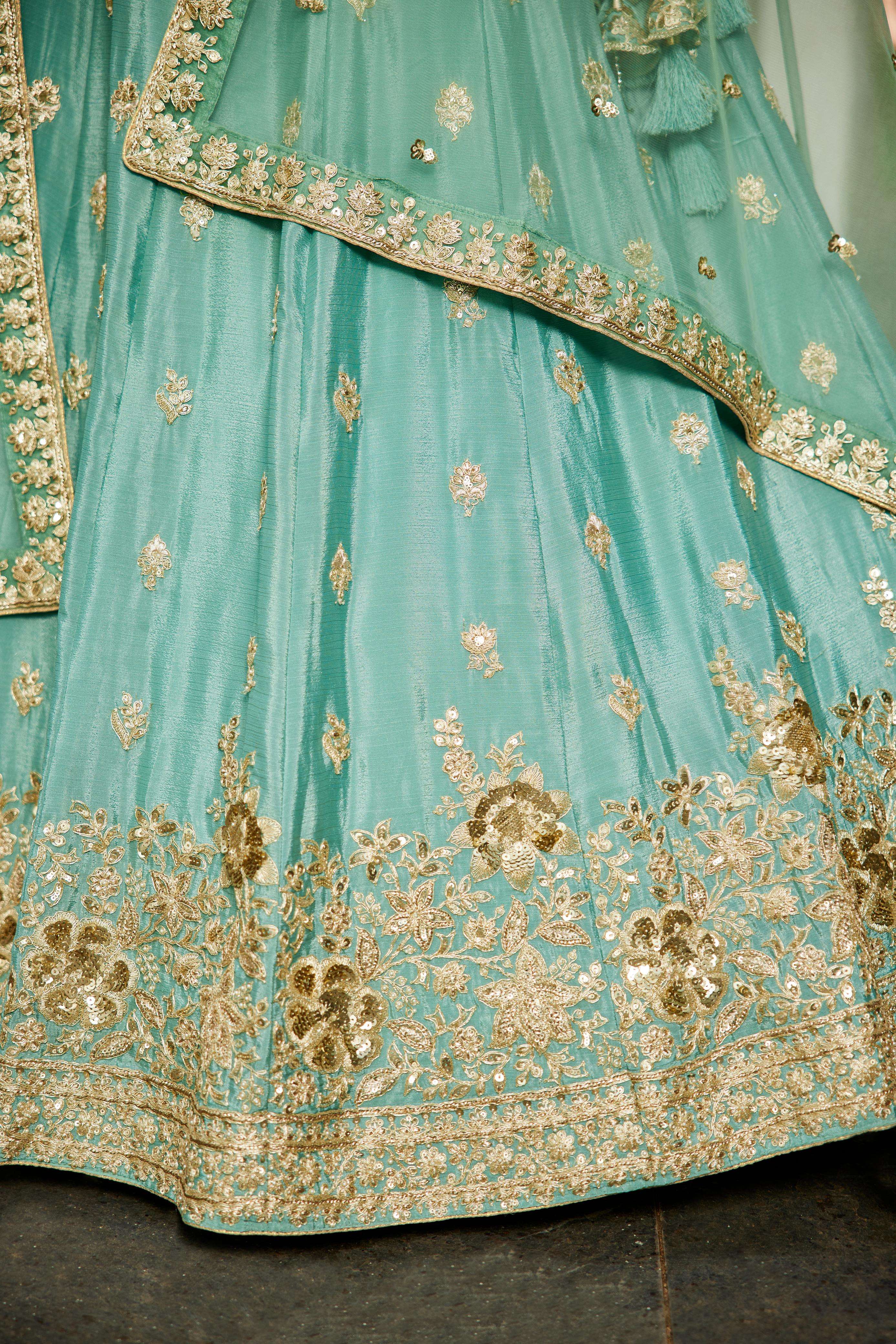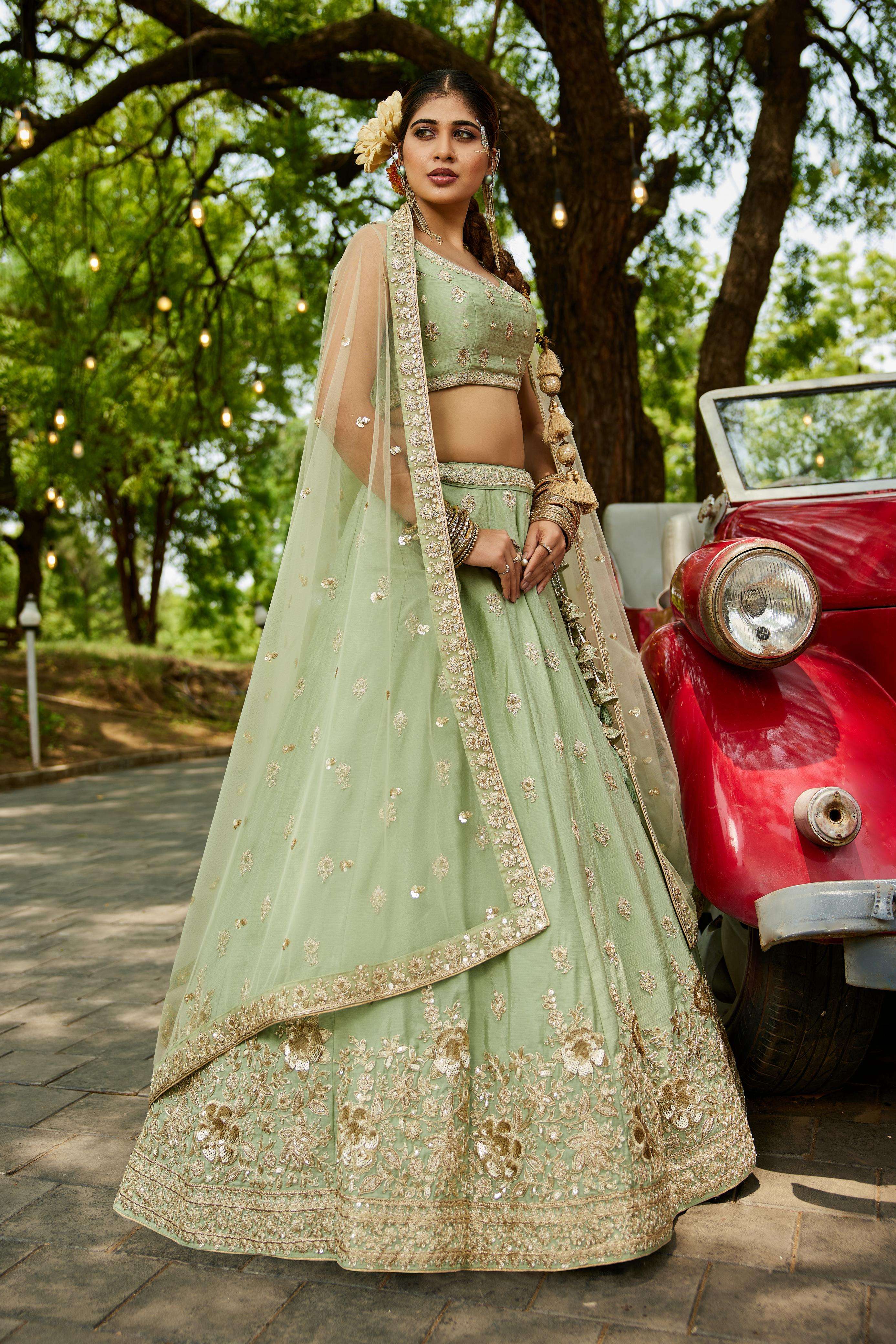 Chinnon Sequinse embroidery Semi-Stitched Lehenga choli & Dupatta"• Lehenga:- Made of premium quality Lime Green Colour Chiffon fabric Full Flaire Semi-Stitched Lehenga With Sequinse and Coding work has a thread Embroidery work. Has a thread work border on the hemline.