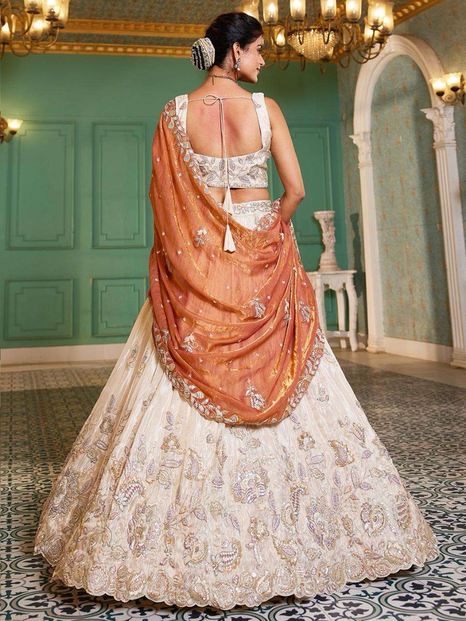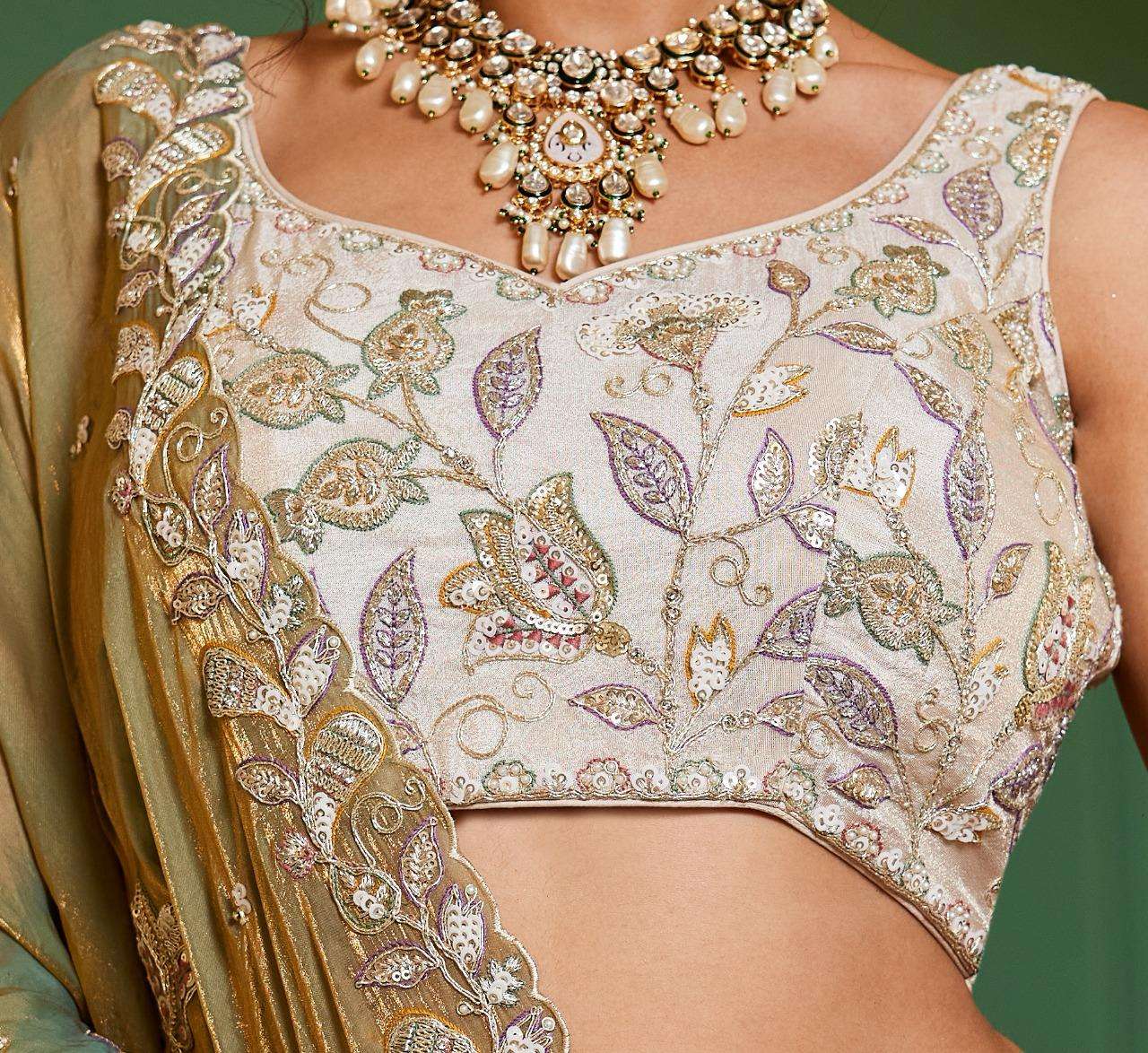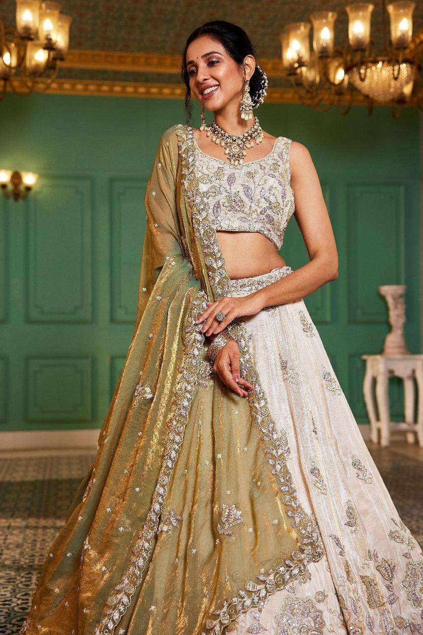 - *Lehenga:* Cream-colored tissue semi-stitched lehenga with sequins and coding work - *Dupatta:* Green gold-colored viscose dupatta with sequins cutwork, ethnic motif, and heavy embroidery work border - *Blouse:* Cream-colored viscose blouse with heavy sequins and thread embroidery work
